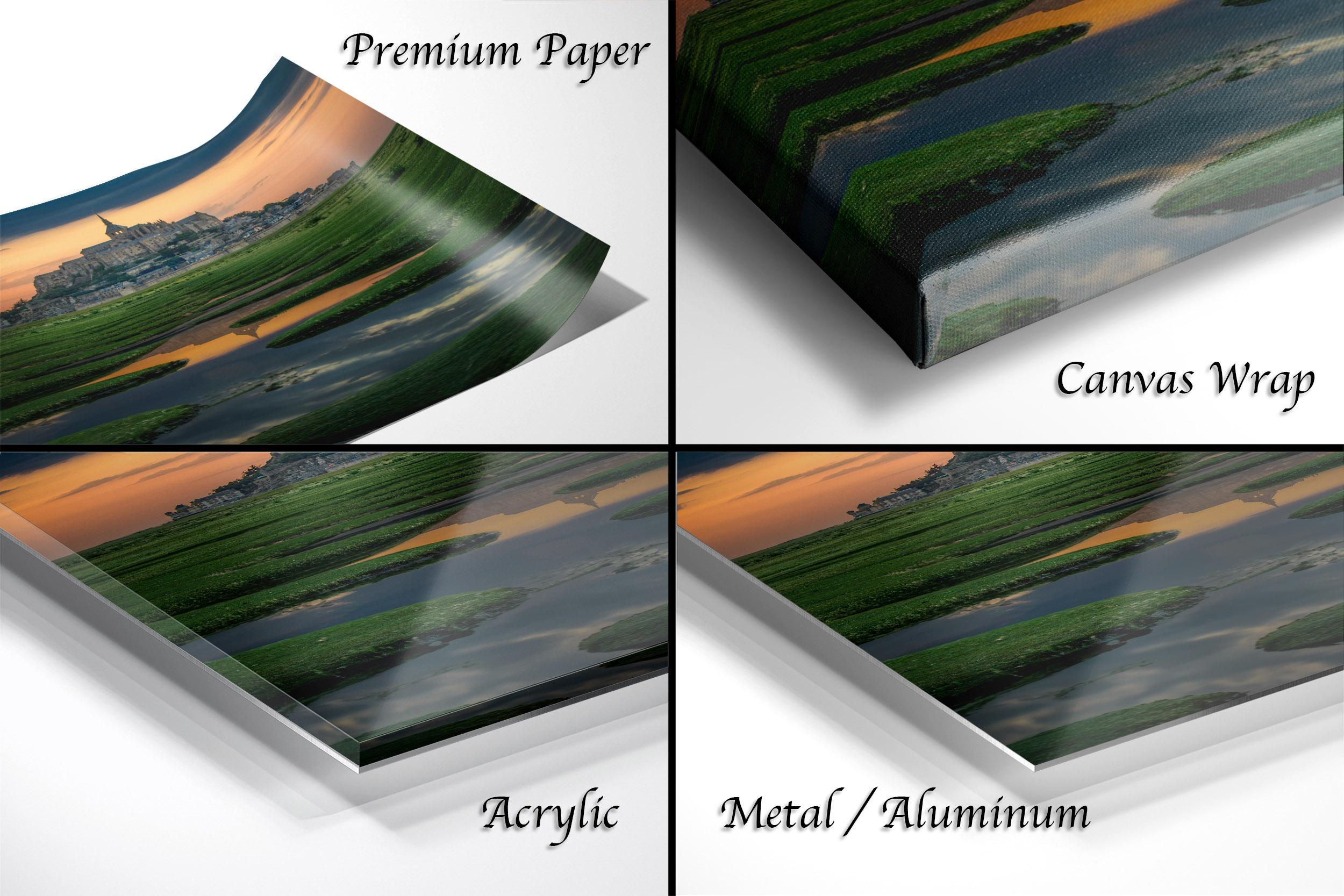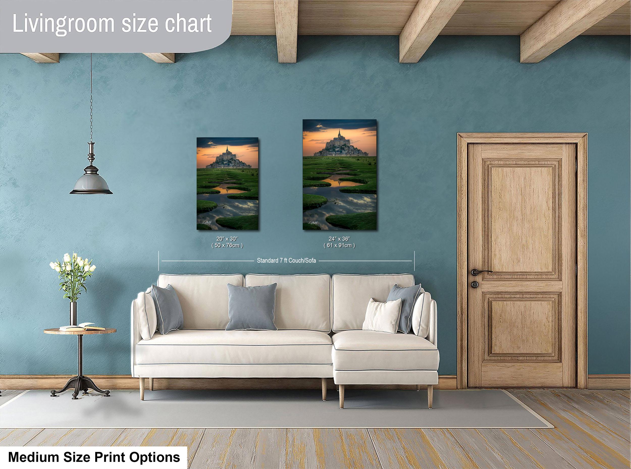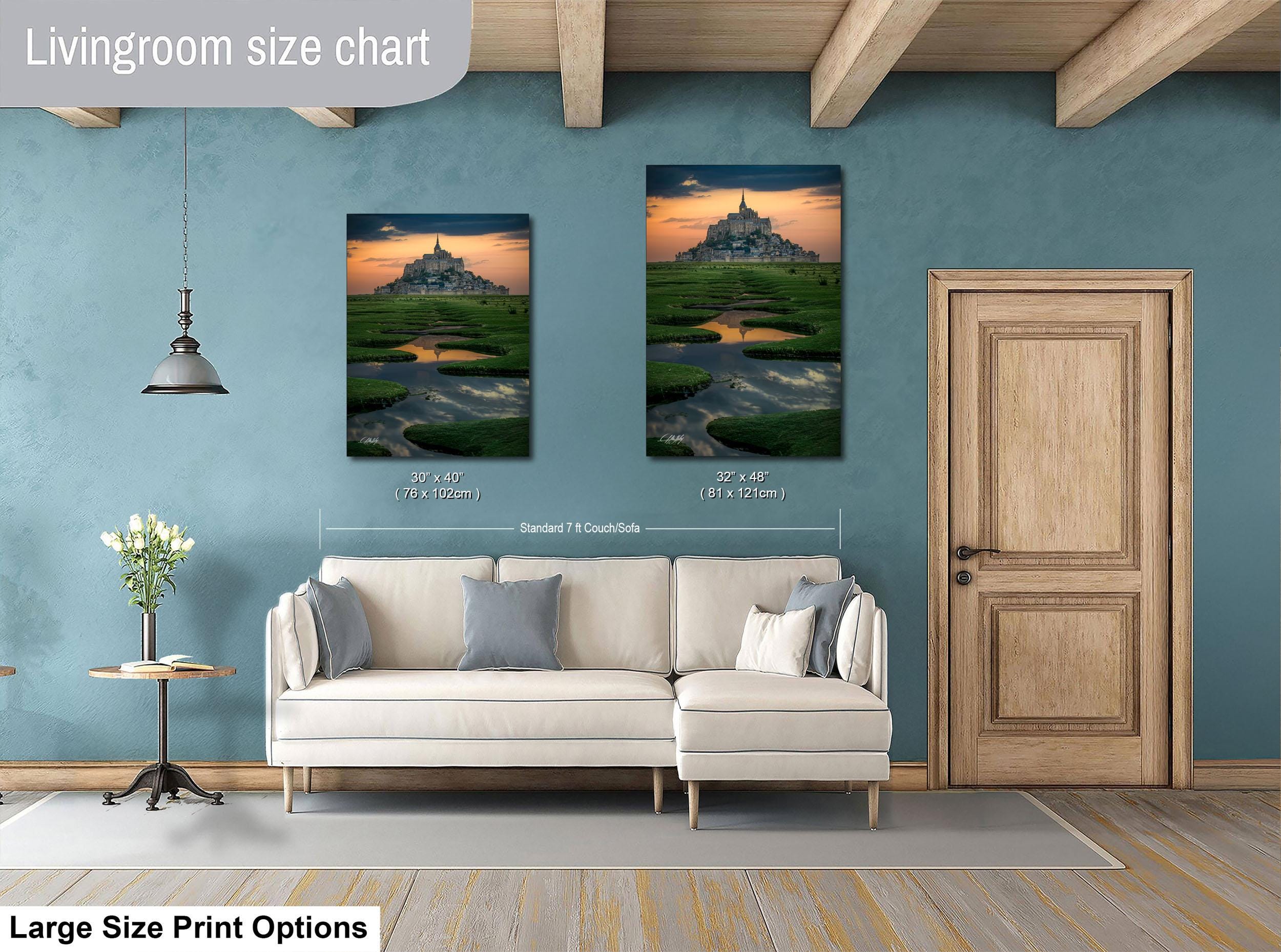 Experience the majestic Mont Saint-Michel, a historic island crowned by its abbey atop the island, standing as a timeless sentinel amidst rolling green hills and quaint villages. This fine art piece captures the ethereal beauty of Normandy's sea breeze and salt sea air, immortalizing a moment where nature’s power meets serene history.