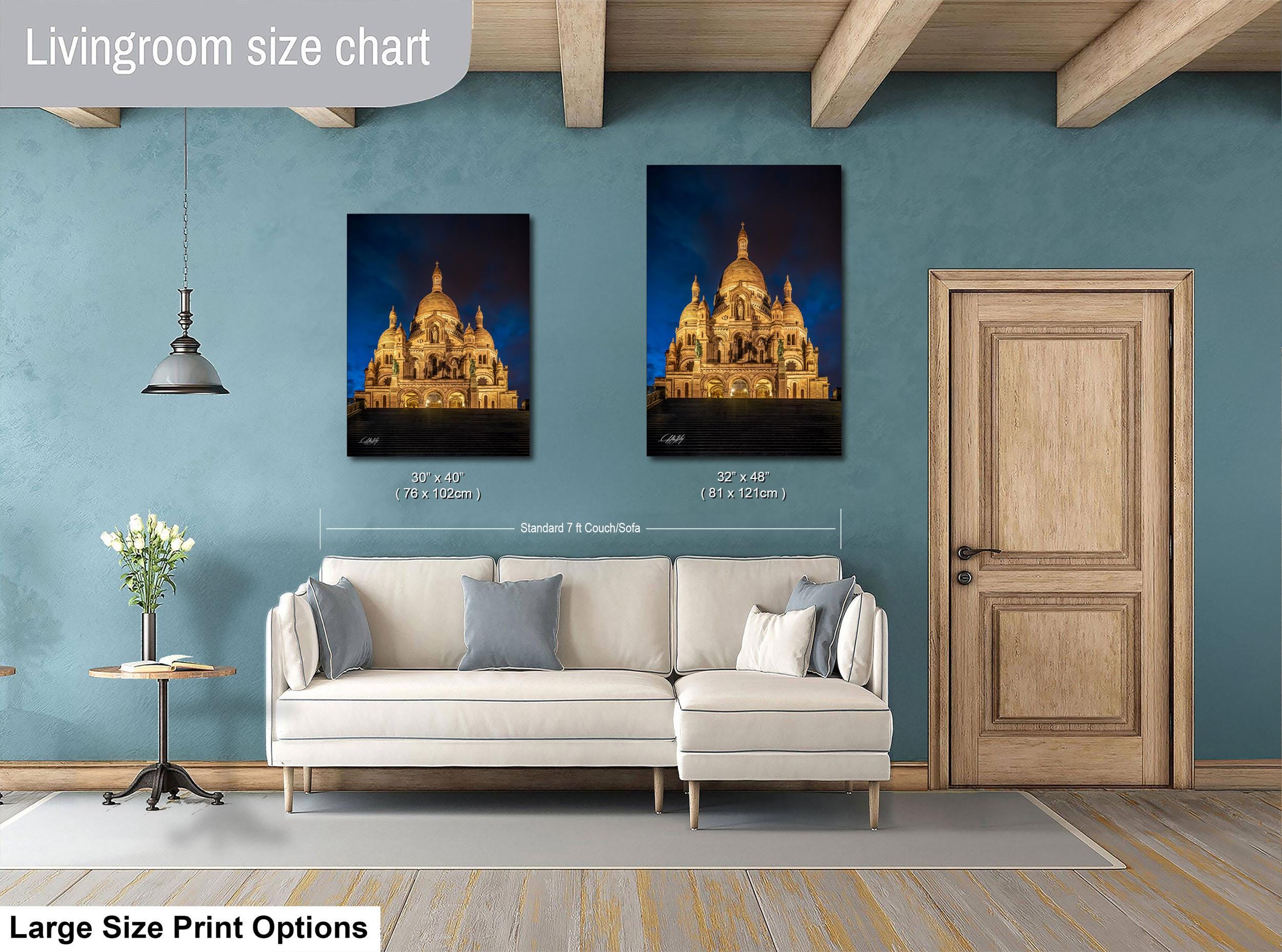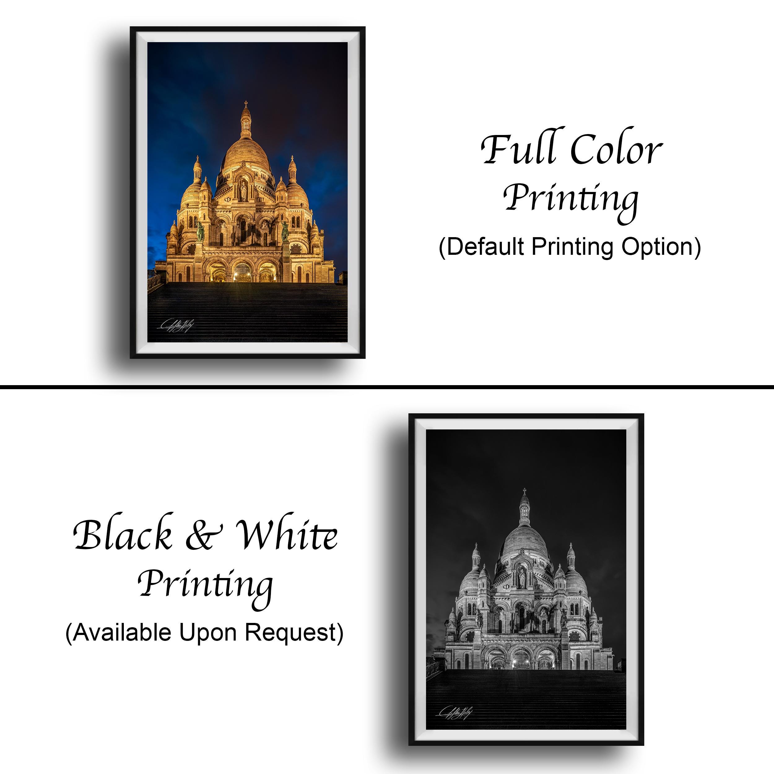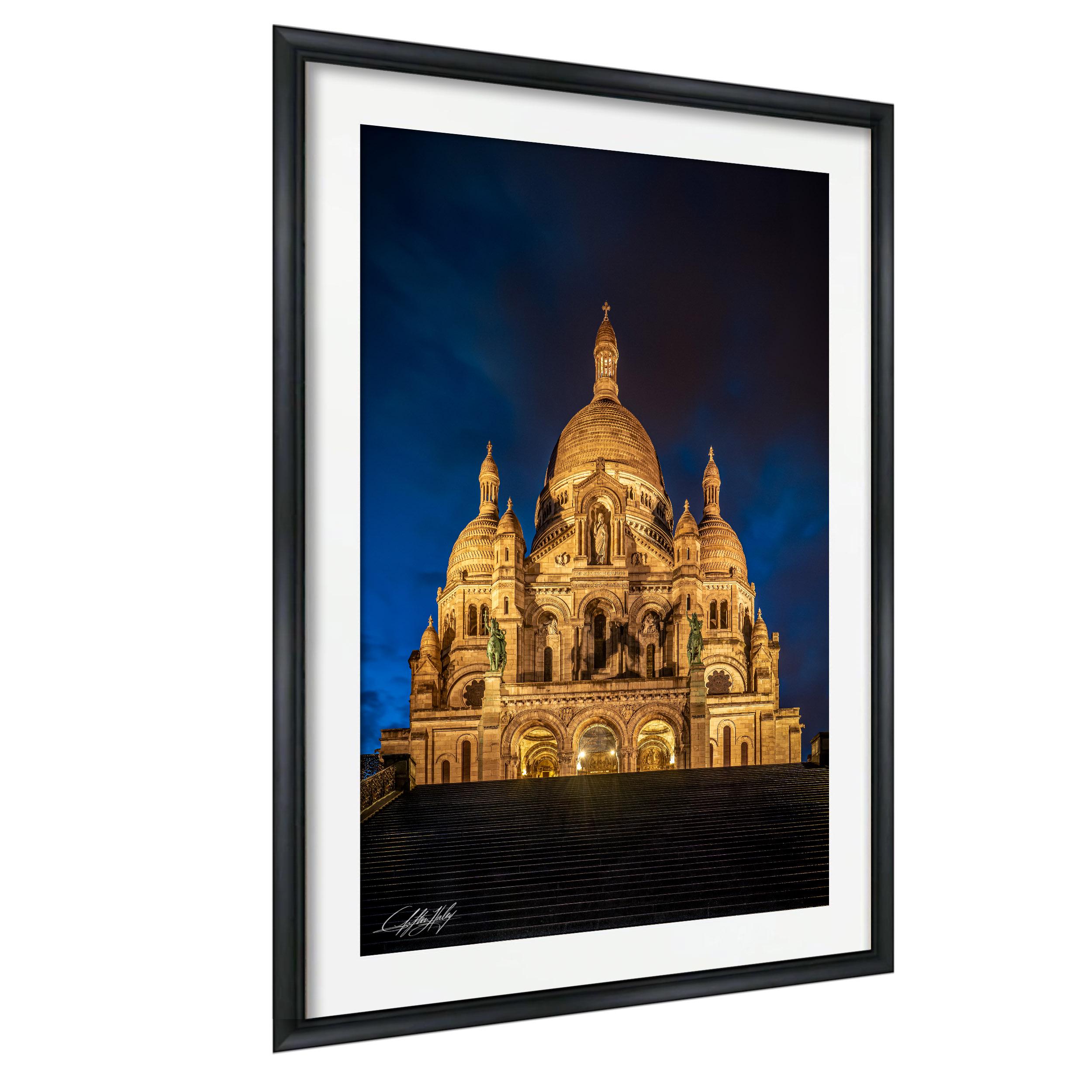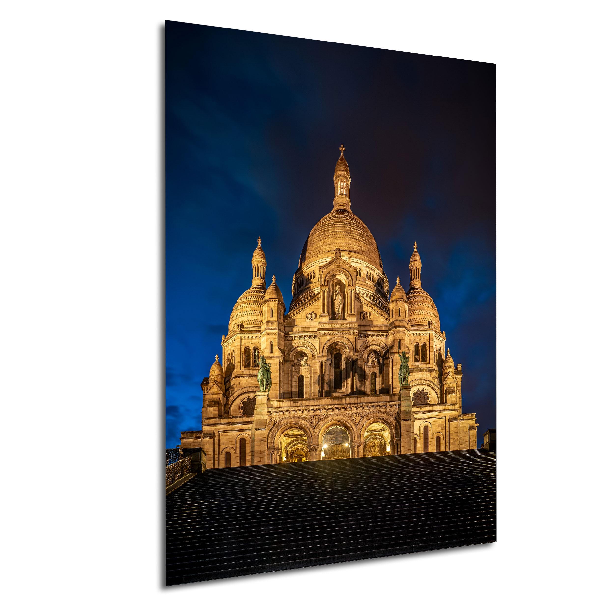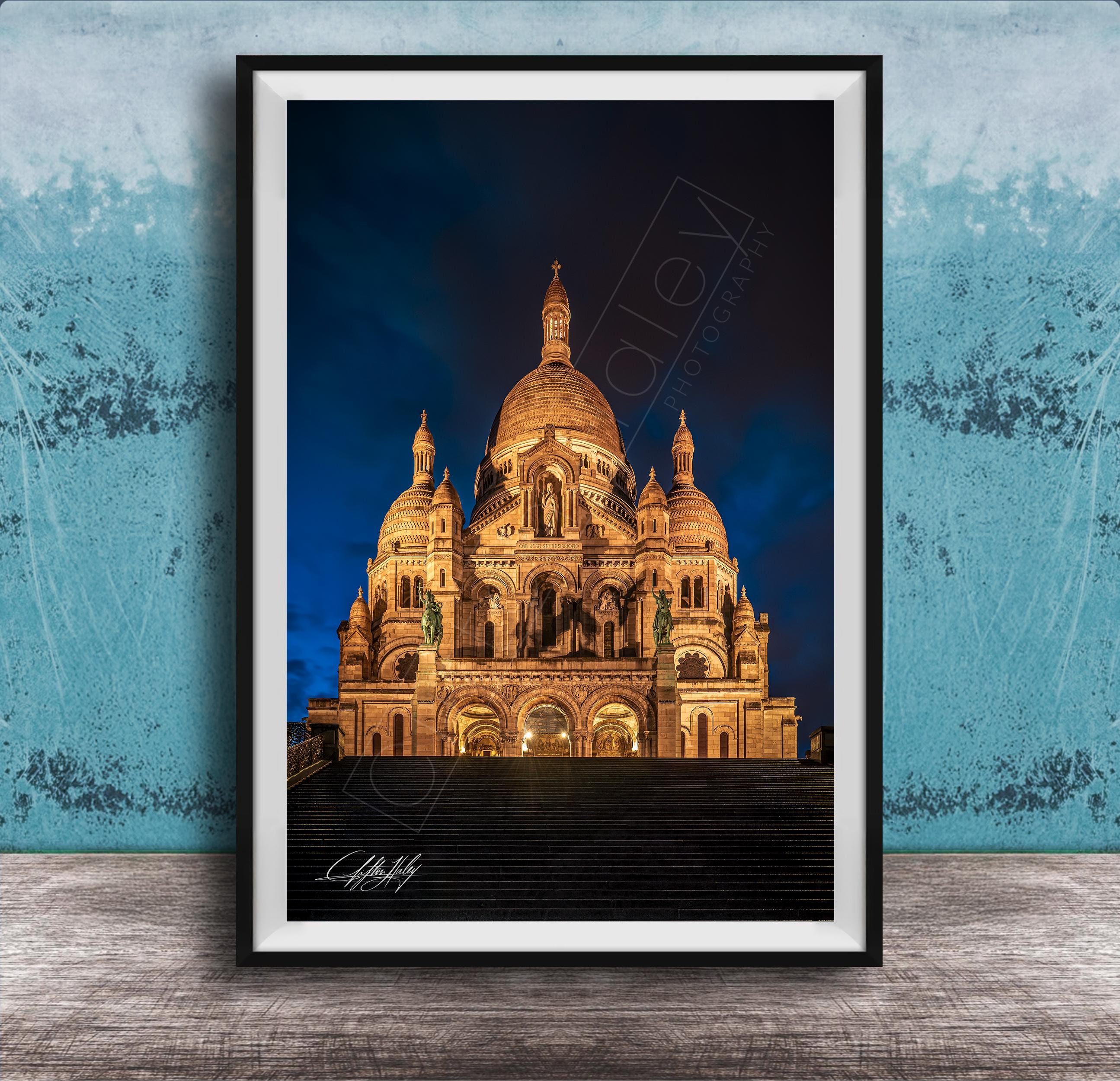 Montmartre Parvis, Sacre Coeur Paris, and Big Meringue Paris come alive in this stunning Paris street print capturing the iconic Parvis du Sacre-Coeur during the magical blue hour.