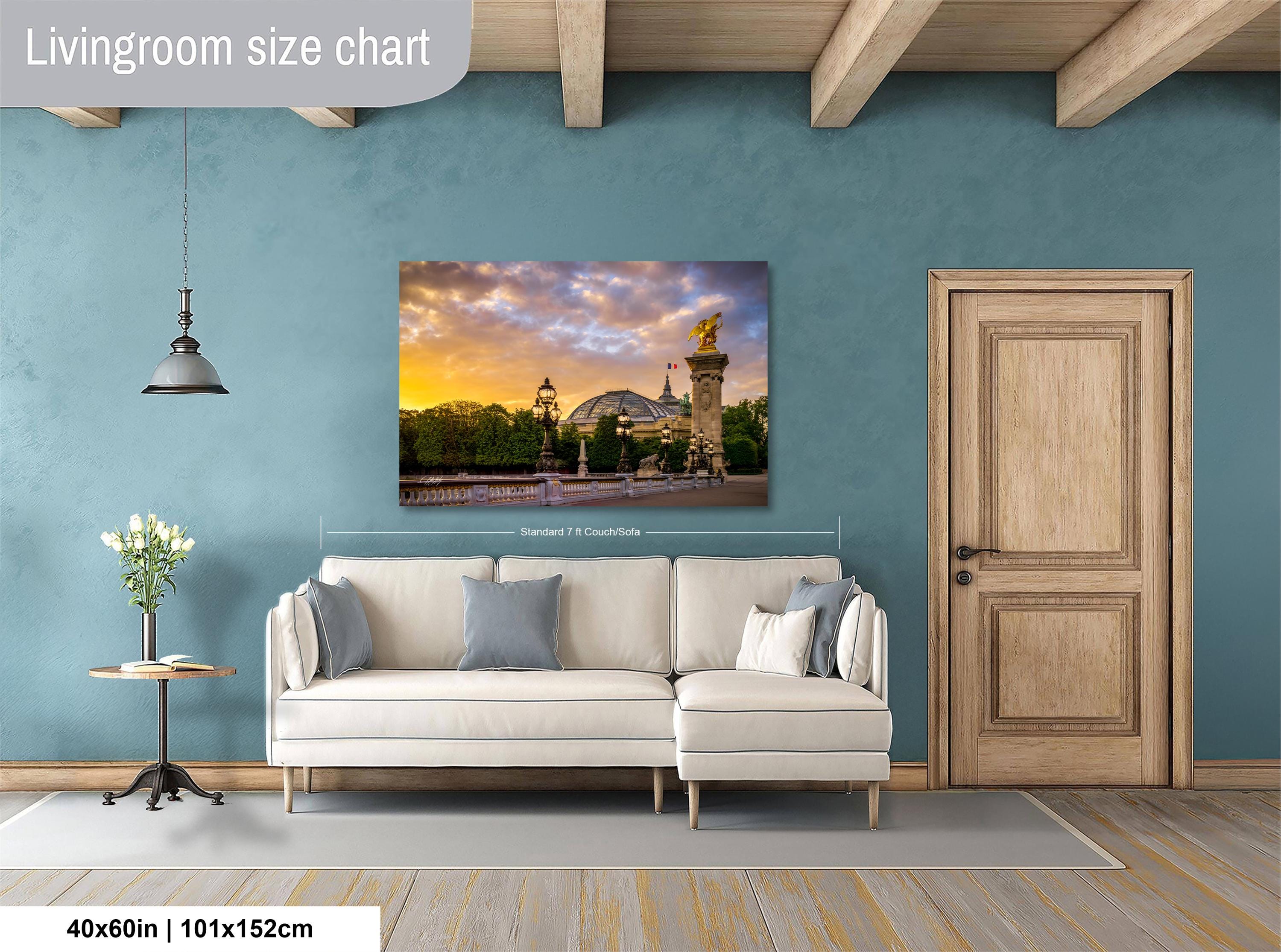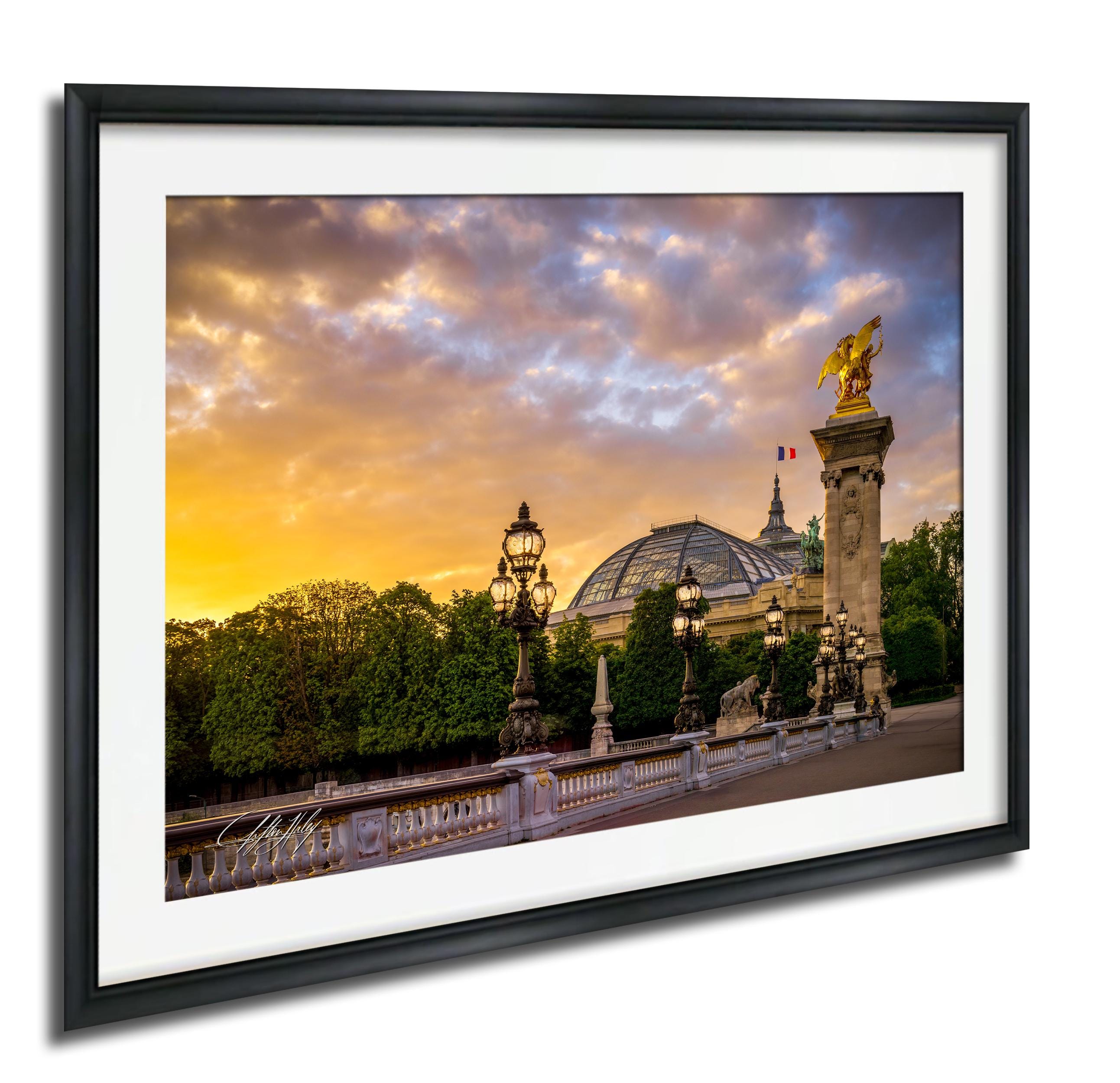 This fine art photograph brings the romance and charm of Paris right into your space. Taken during the fleeting golden hour, the image showcases the iconic Alexander 3rd Bridge alongside the majestic L'Art et la Nature Paradiso Grand Palai, bathed in warm sunset light. Perfect for lovers of Paris travel gifts and romantic wall art, this piece adds sophistication and a touch of history to any room.