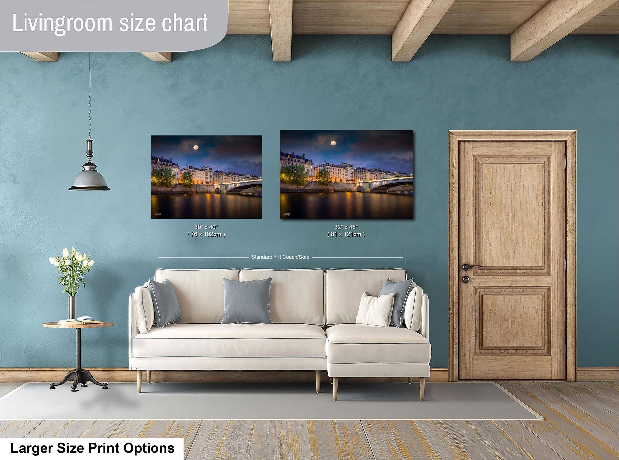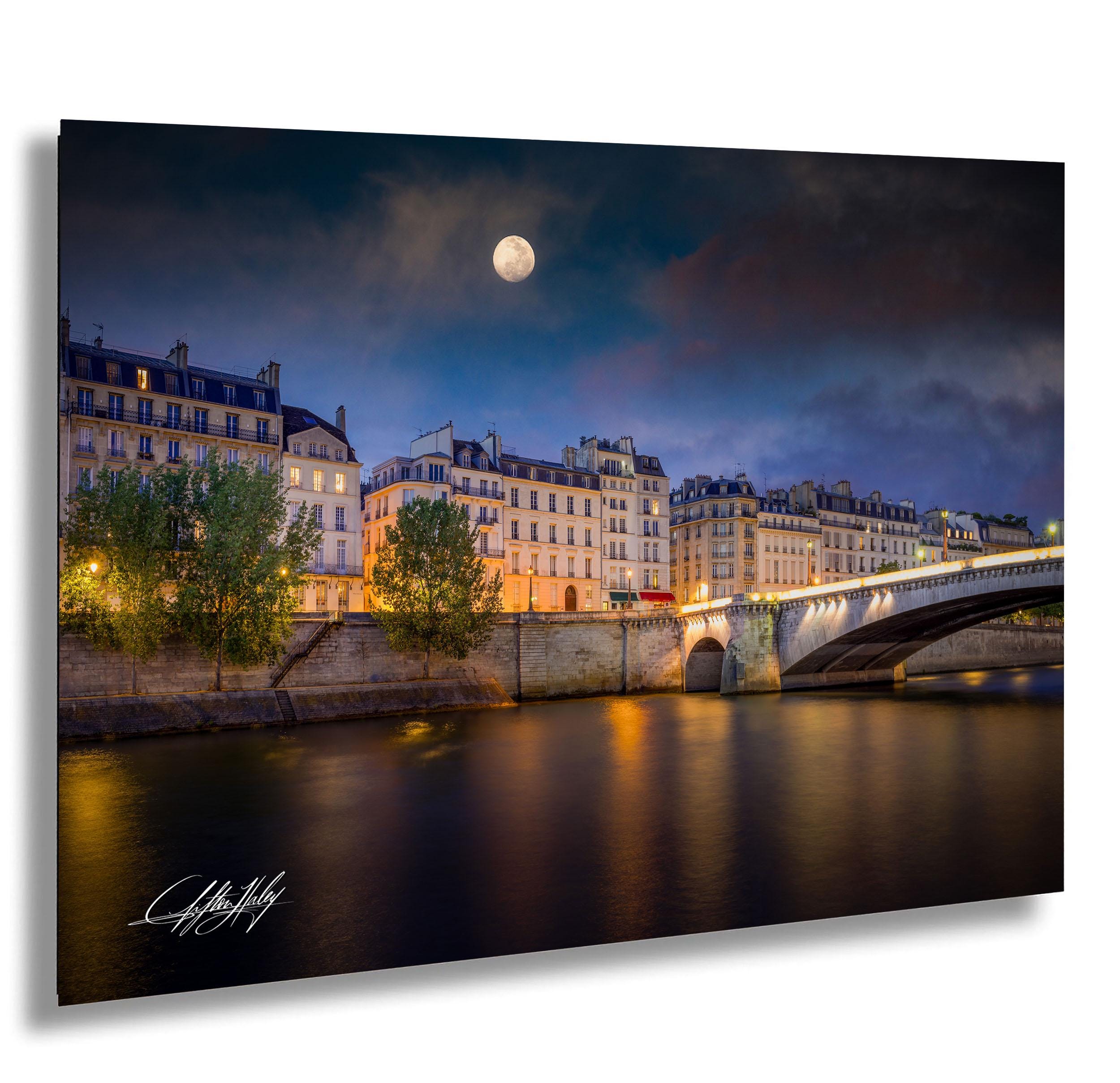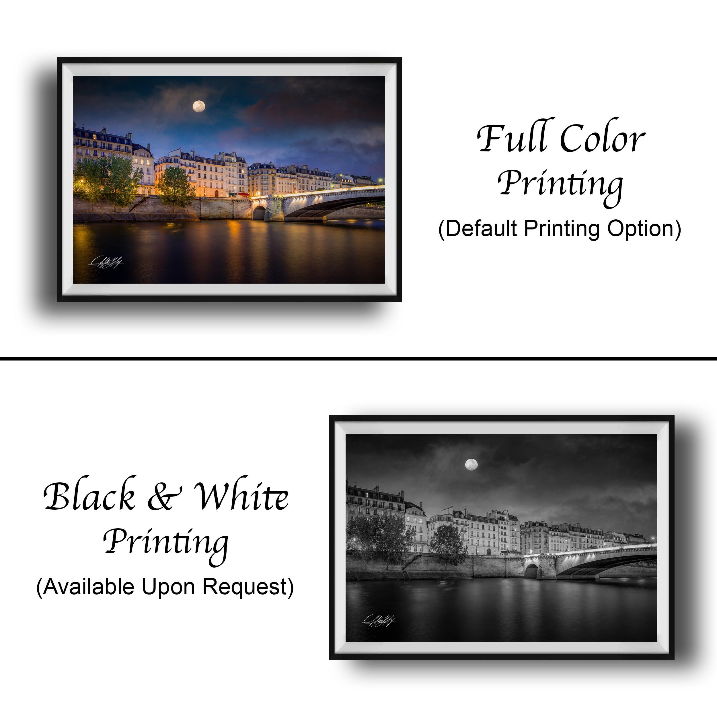 Celebrate the allure of Paris with this exceptional travel decor that captures a fleeting moment of harmony between history and nature. Whether displayed in your living room, office, or gallery wall, this fine art photograph invites you to dream of moonlit strolls along the Seine.