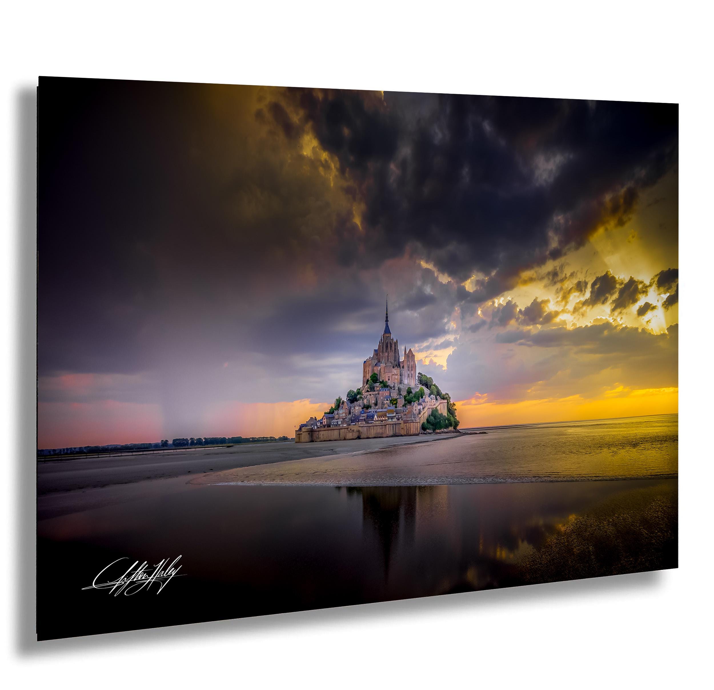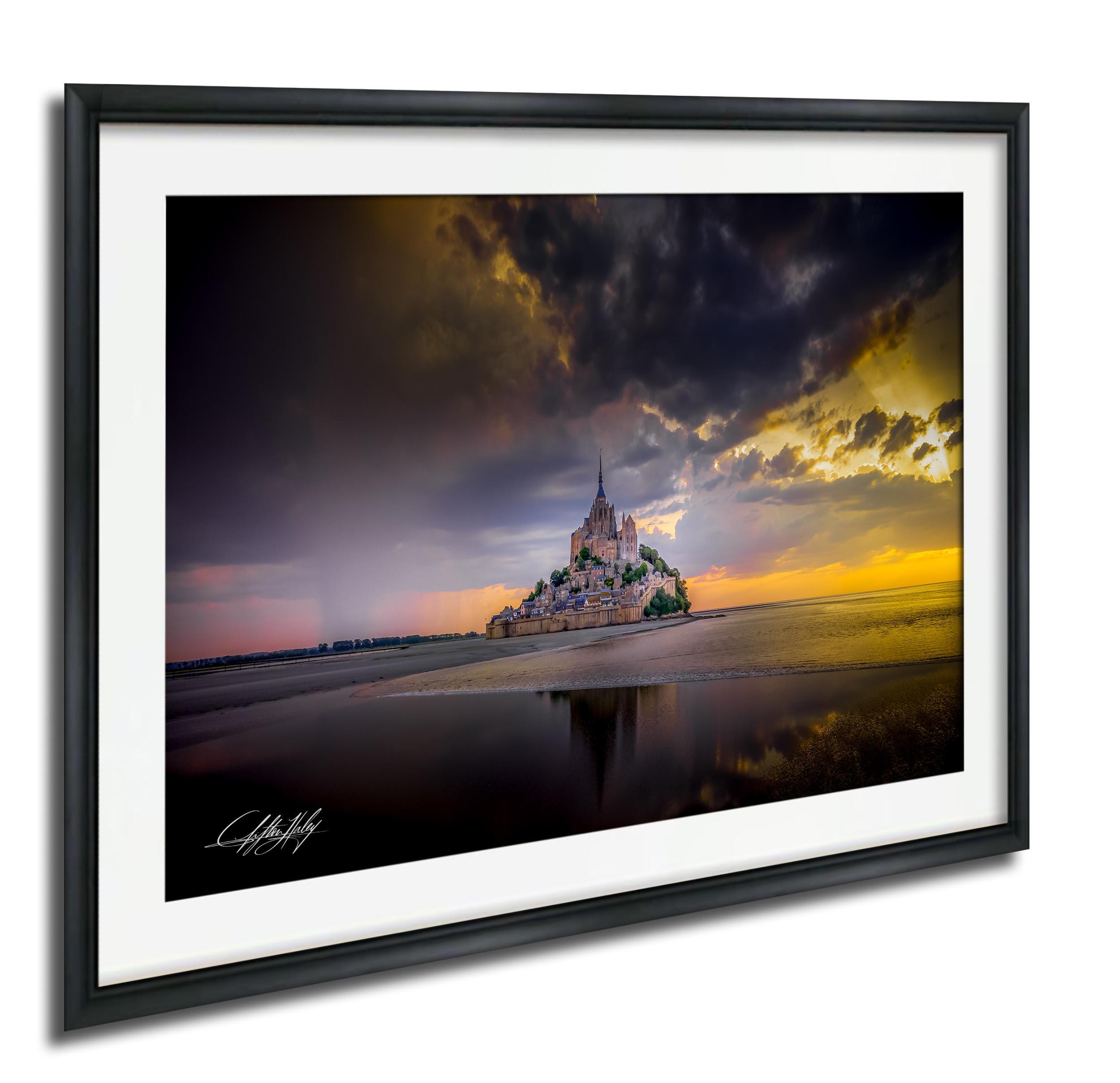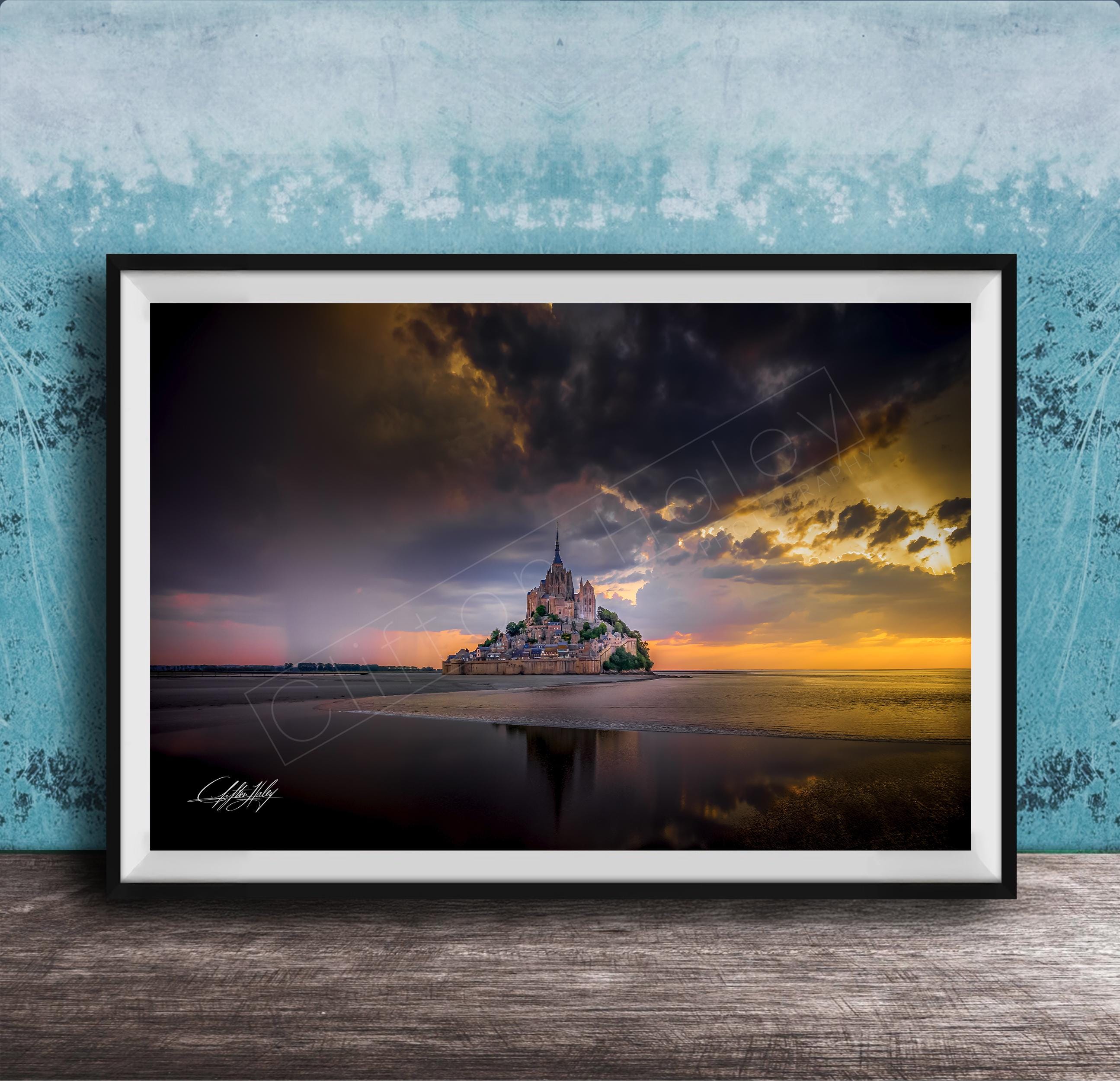 Embark on a visual journey to the iconic Mont Saint-Michel, Normandy, through this exquisite fine art print. Captured moments after a dramatic lightning storm at sunset, this photograph immortalizes the majestic abbey perched atop its rocky island. The image reflects the rich history and natural beauty of this ancient castle landmark, making it a perfect addition for lovers of Europe travel art and coastal landscapes.
