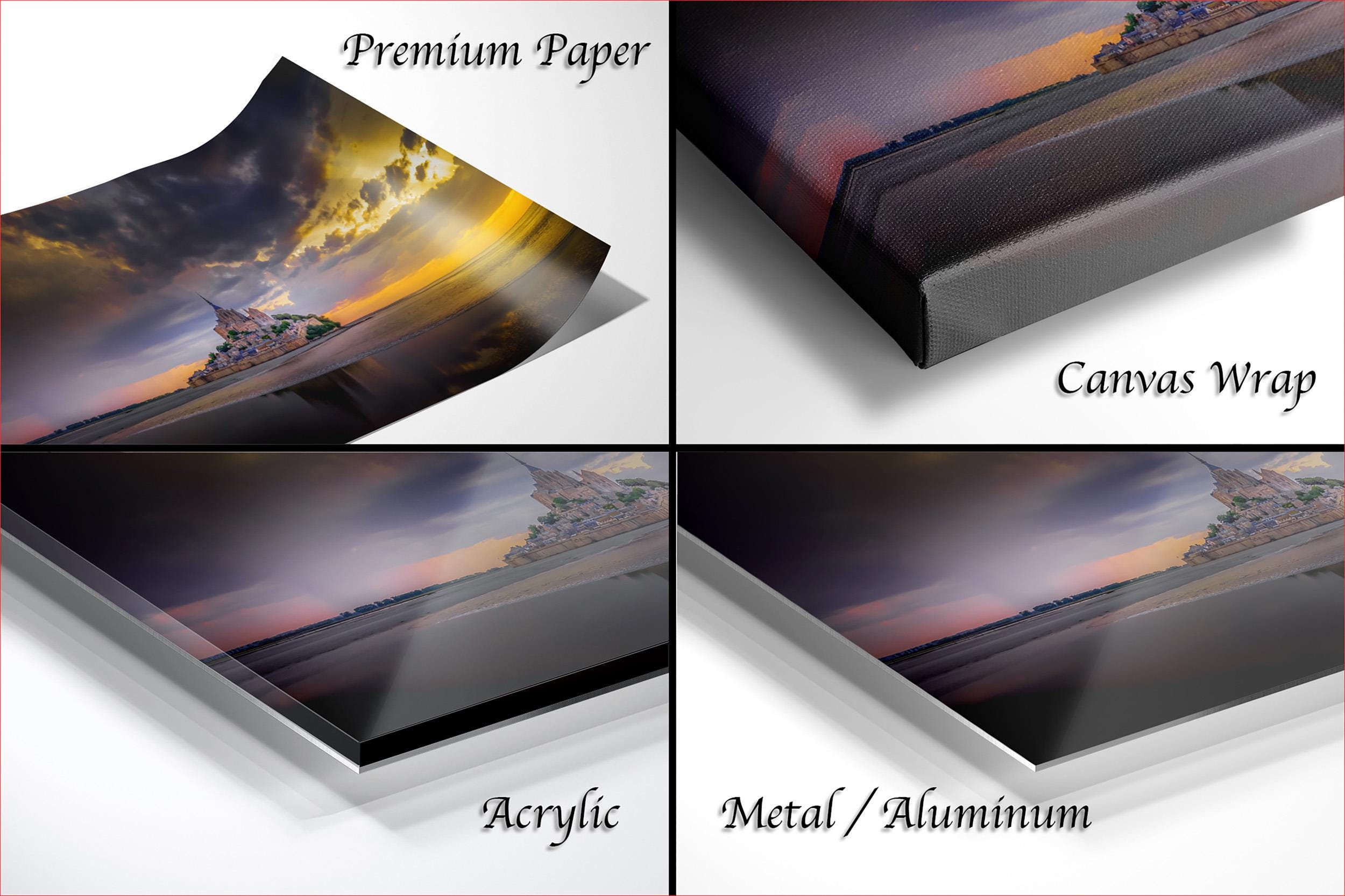 3.1) Only framed paper prints, acrylics and aluminum/metal prints will have a 2" white mat border. 3.2) Canvas prints will be a flush mounted (no mat border) to the frame.