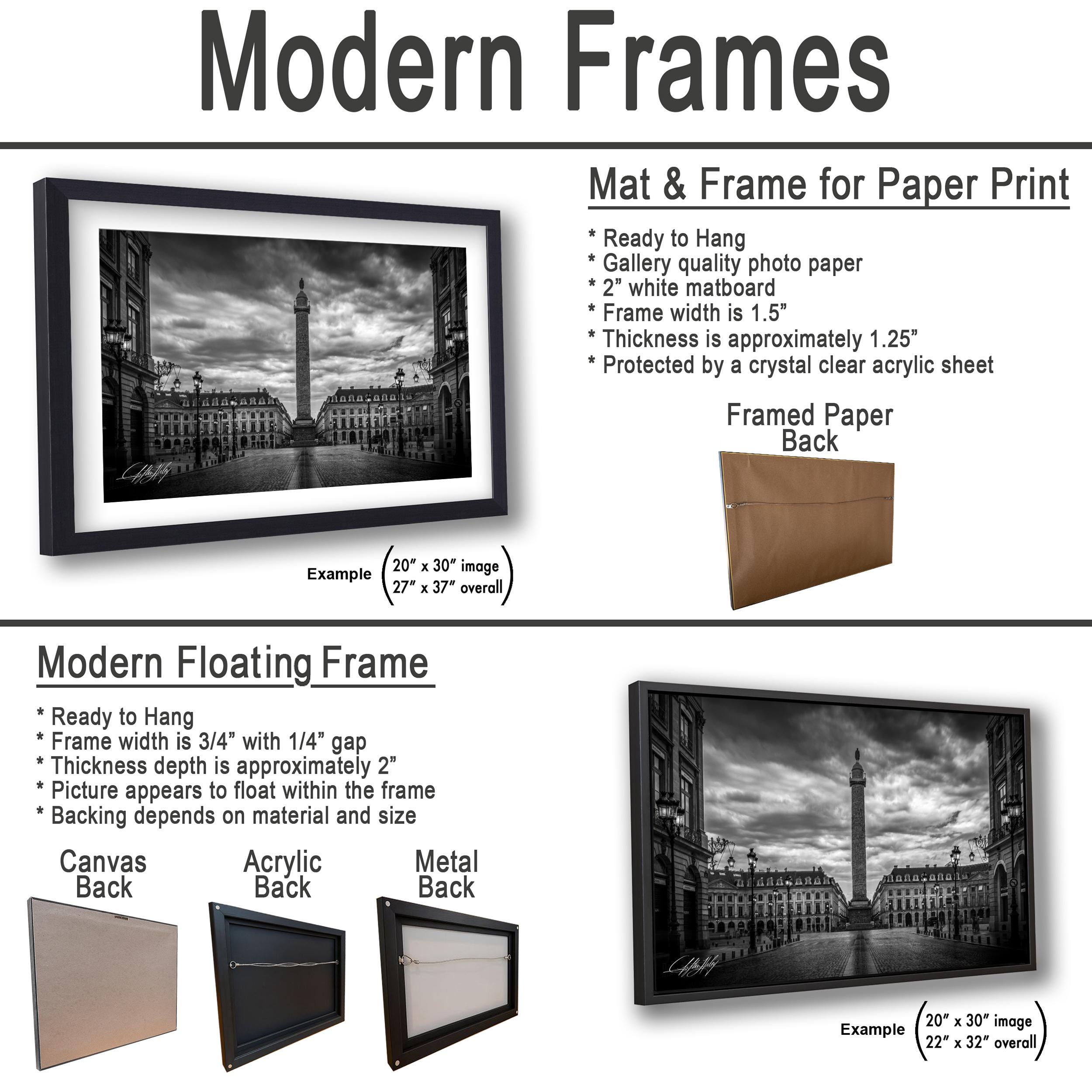 3.1) Only framed paper prints, acrylics and aluminum/metal prints will have a 2" white mat border. 3.2) Canvas prints will be a flush mounted (no mat border) to the frame.