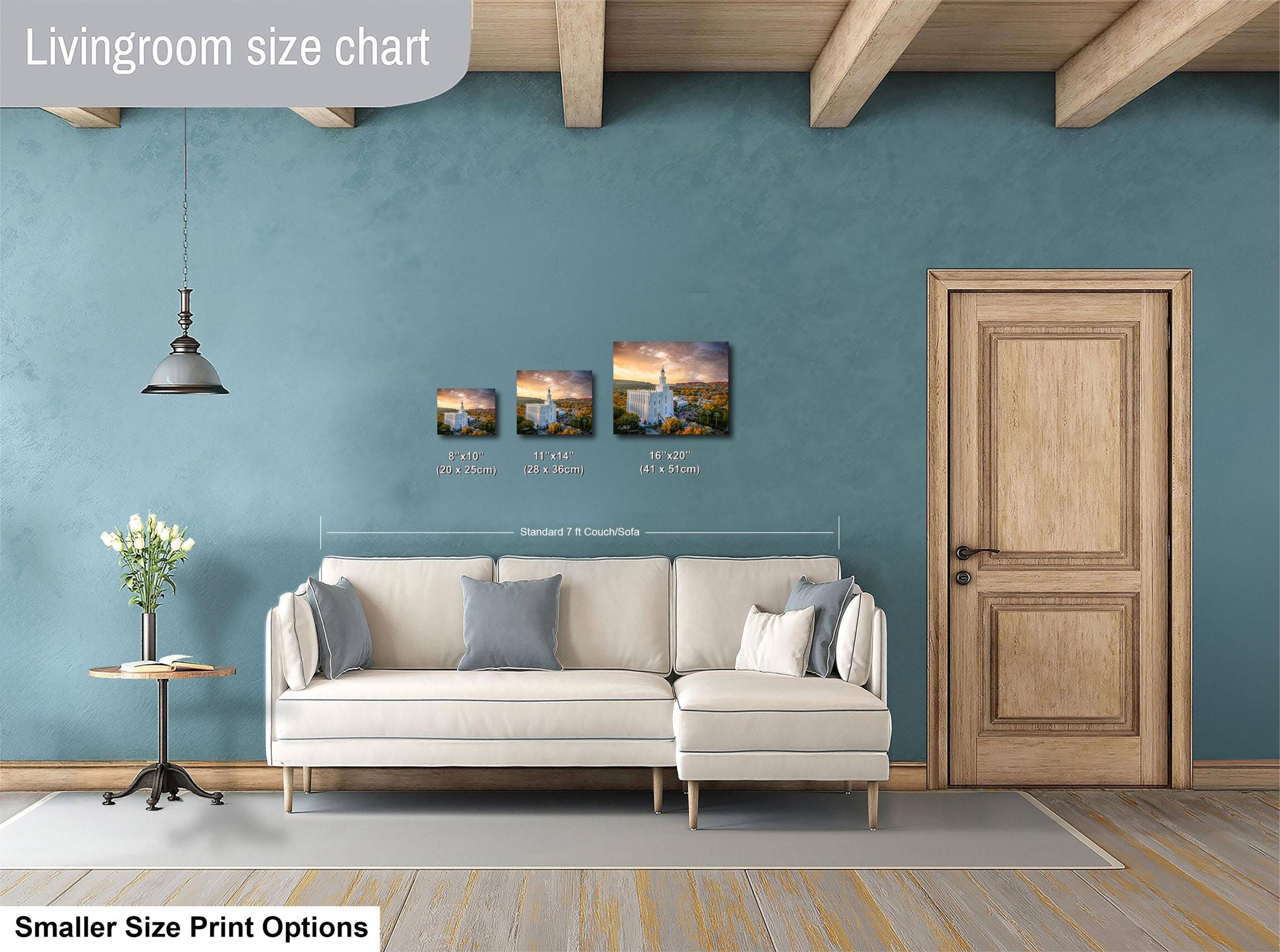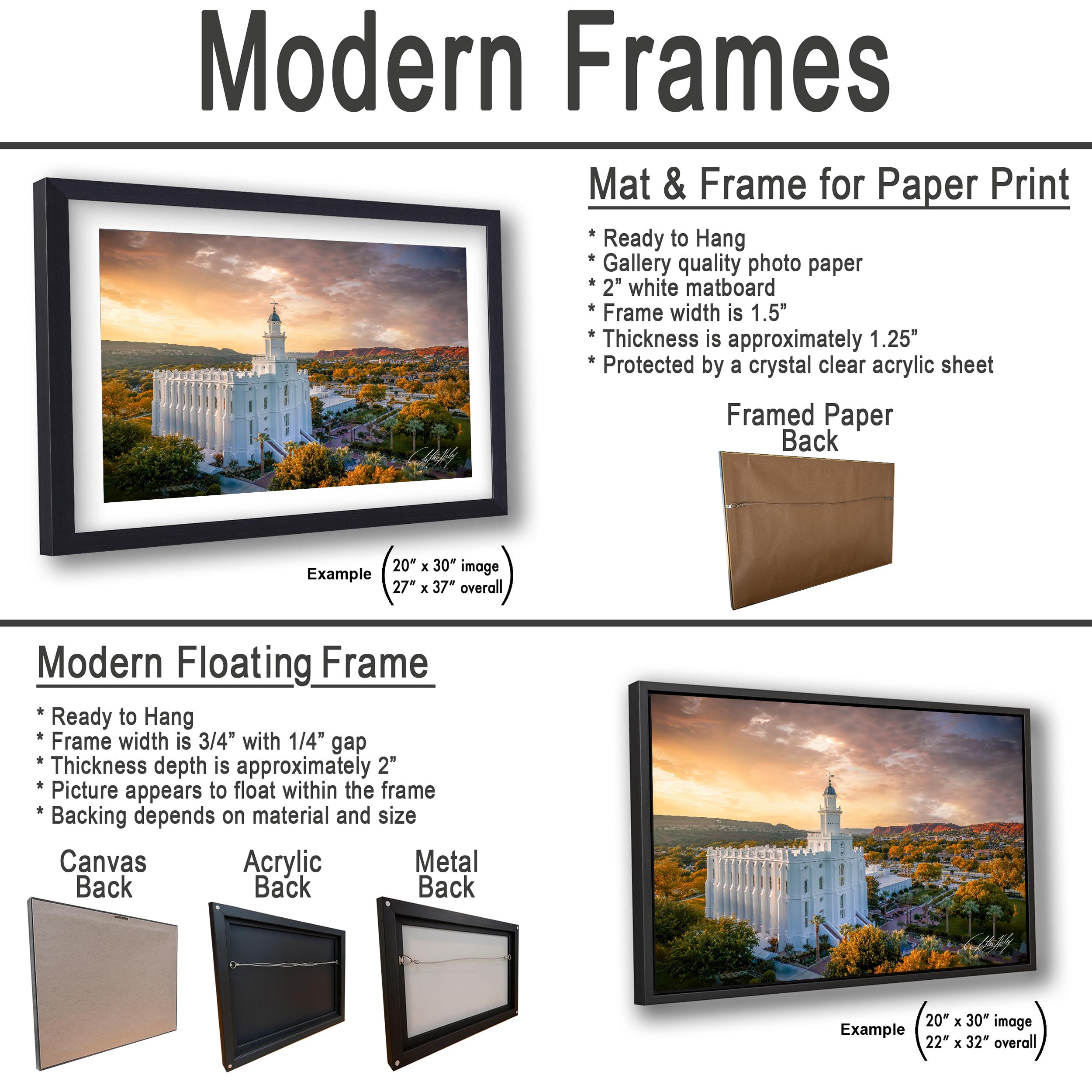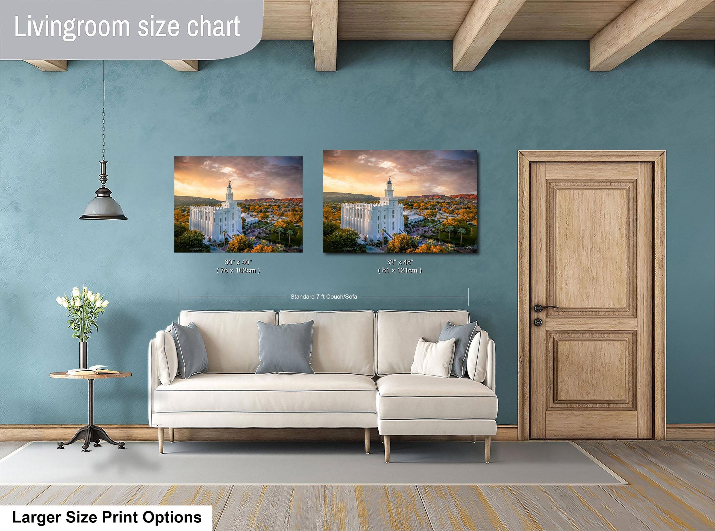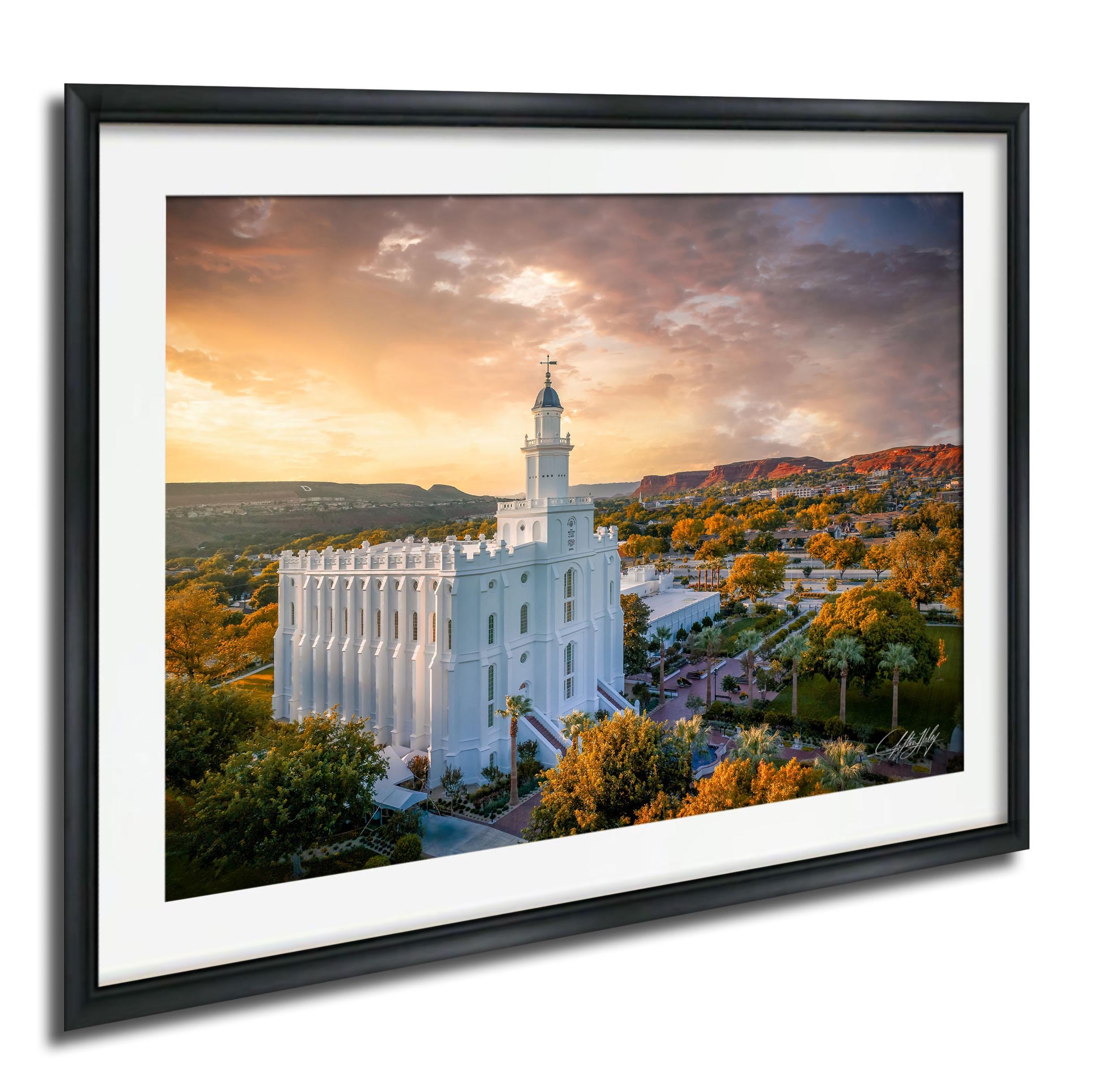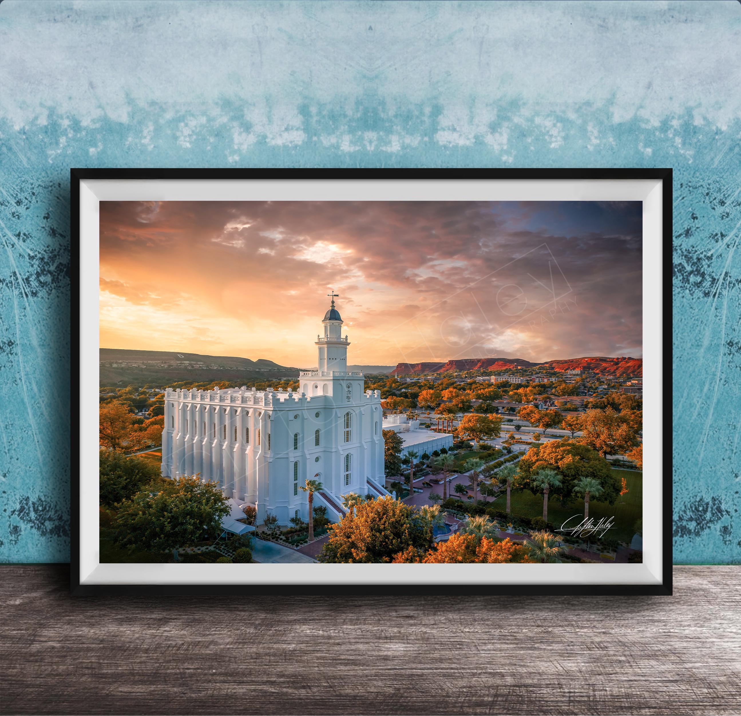 This LDS temple art captures the essence of St. George’s vermilion cliffs and desert terrain during the golden hour, bringing warmth and tranquility into your home or office. Whether displayed as a sunset temple photo or Utah sunrise photo, it serves as a meaningful reminder of faith, endurance, and heritage.
