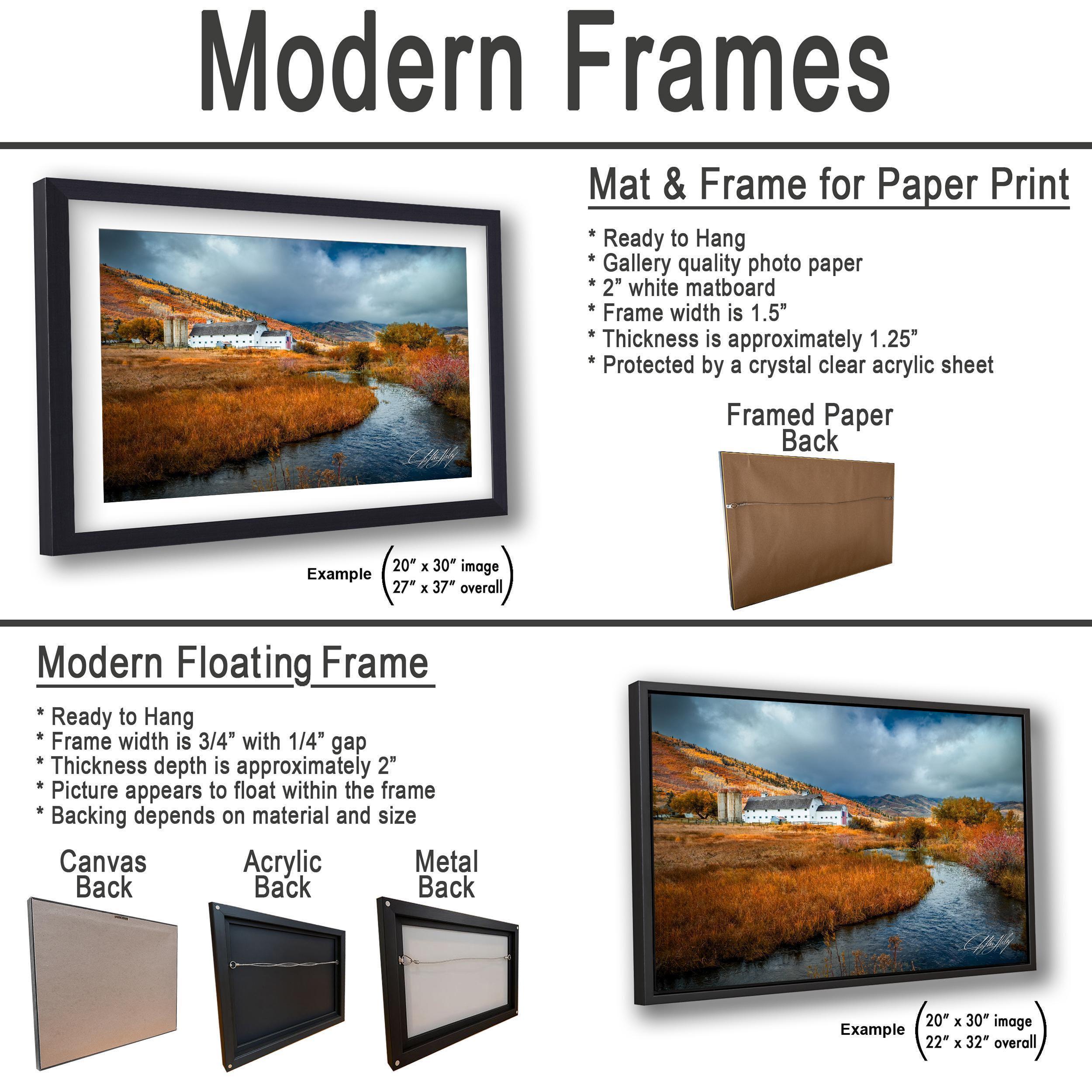 - ✅ Available in framed paper prints with a 2" white mat border or canvas, acrylic, and metal prints mounted on floating frames