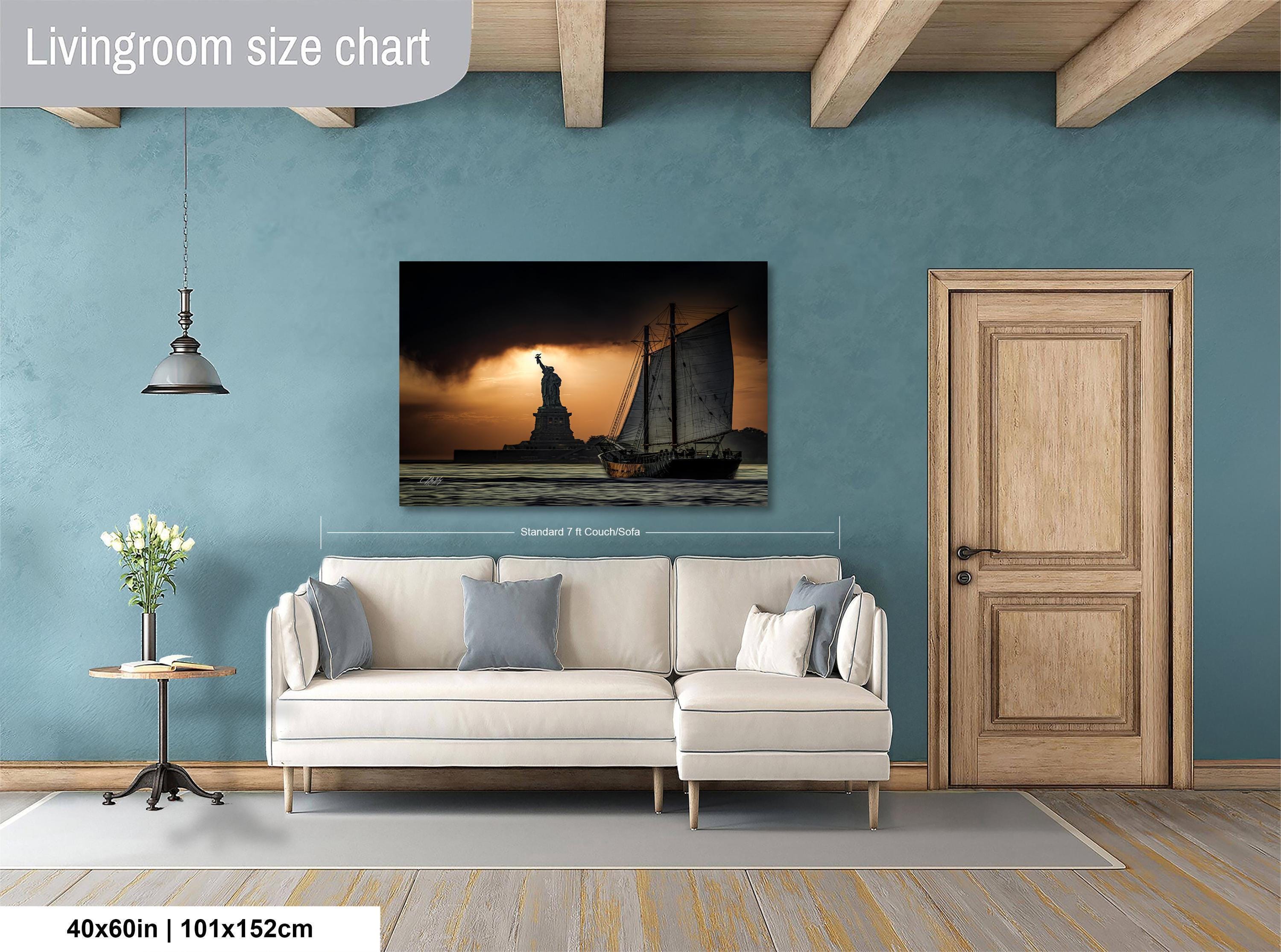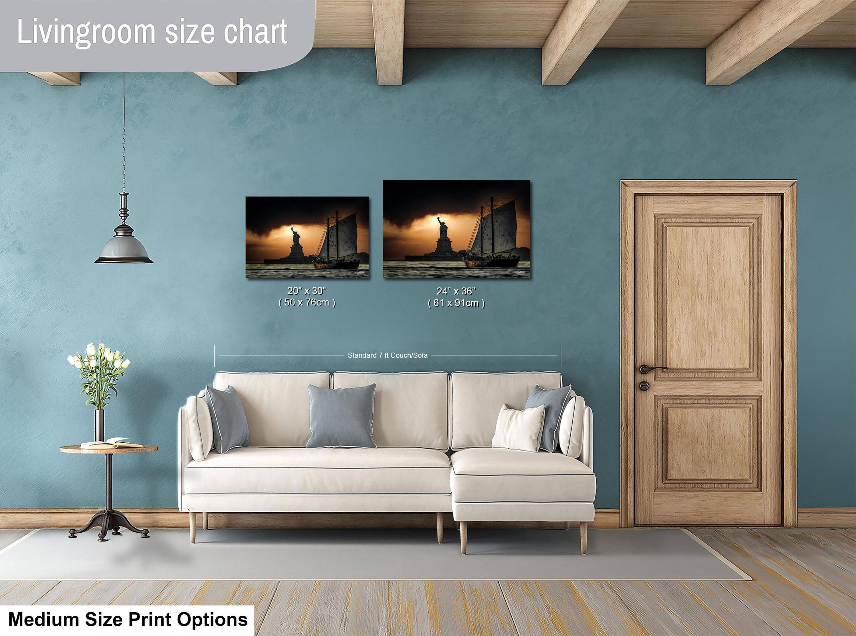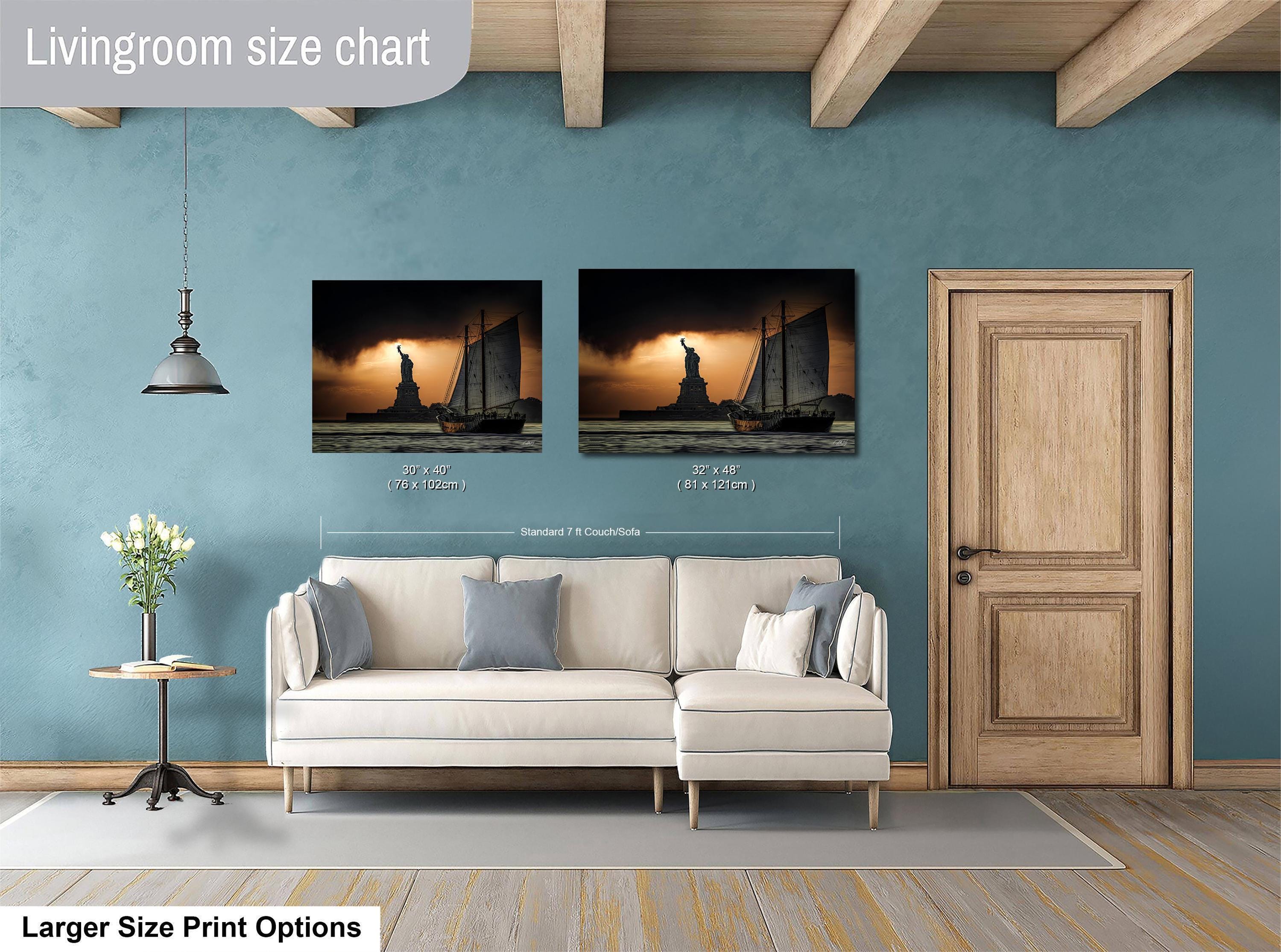 Add a touch of New York City charm to your space with this bold “Lady by the Door” Statue of Liberty wall art. Blending vintage pop art with maritime flair, it features Lady Liberty aglow in sunset light, a sailboat drifting by, and a detailed NYC map backdrop. Ideal for fans of urban art, nautical scenes, or midcentury decor, this print brings the spirit of the city to life.