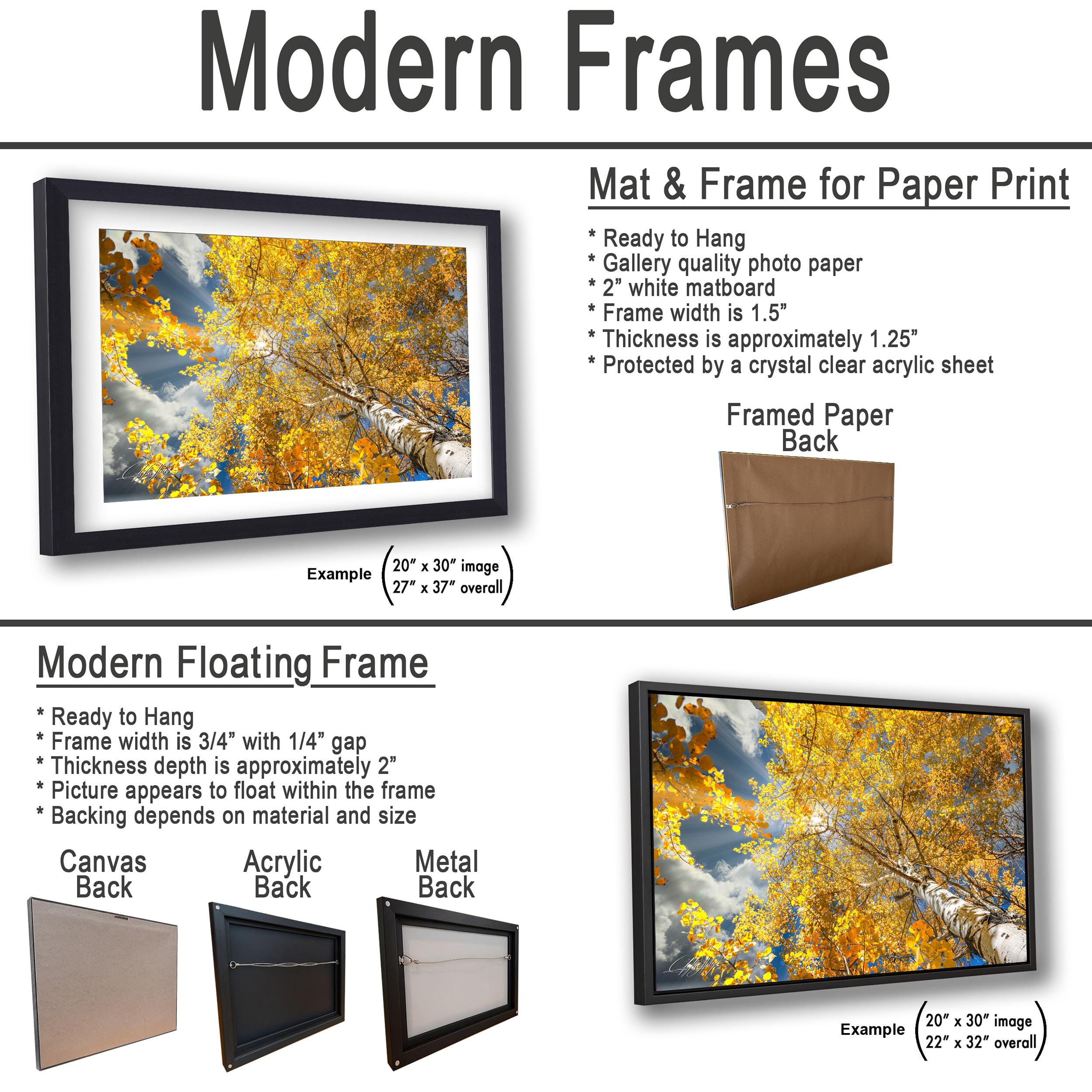 • Hand signed artwork authenticates each print, making every piece unique and personal. • Available as fine art paper print, aluminum metal print, or canvas with flush mounting for a sleek finish. • Framed paper prints, acrylics, and metal options include a 2" white mat border enhancing the visual appeal. • Dimensions can be customized to fit your space and style needs.