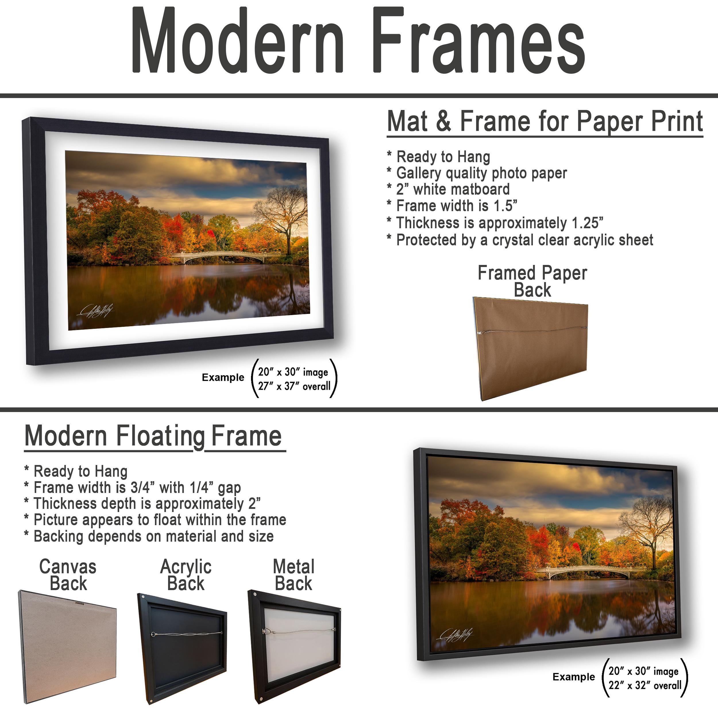 3.1) Only framed paper prints, acrylics and aluminum/metal prints will have a 2" white mat border. 3.2) Canvas prints will be a flush mounted (no mat border) to the frame.