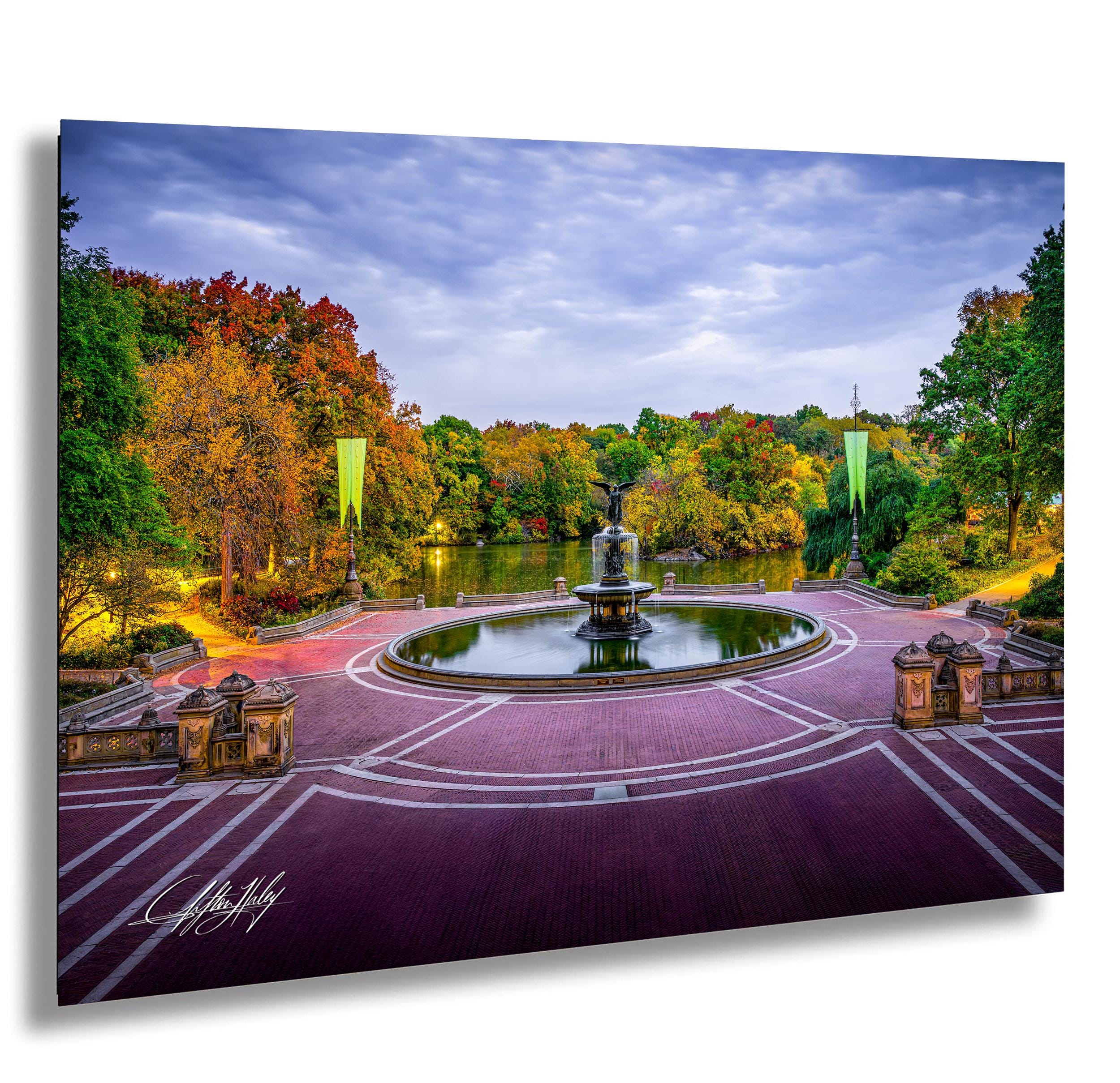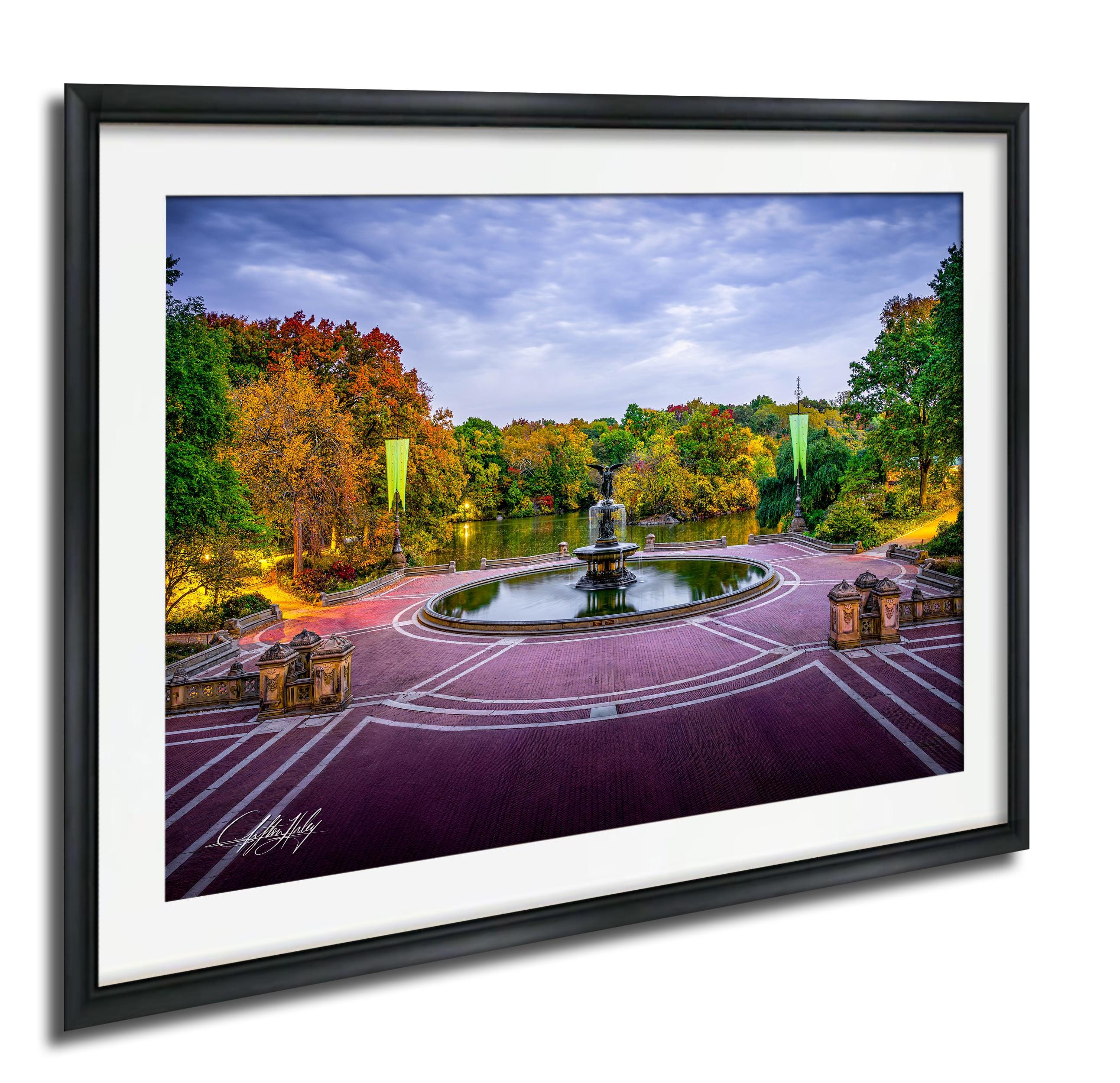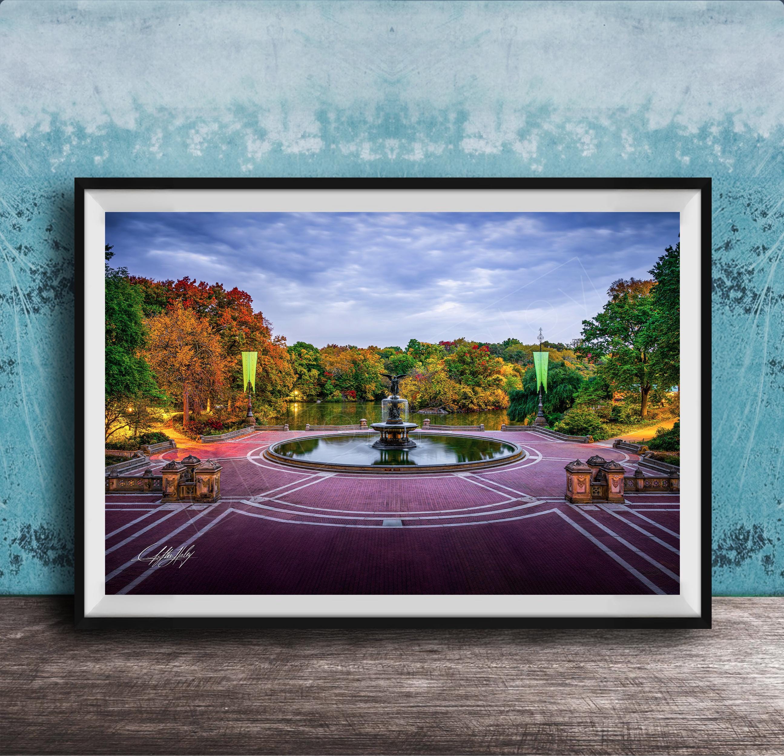 Experience the serene beauty of Bethesda Terrace Fountain in Central Park, captured at sunrise in this artist signed print that brings NYC's peaceful park scene into your home.