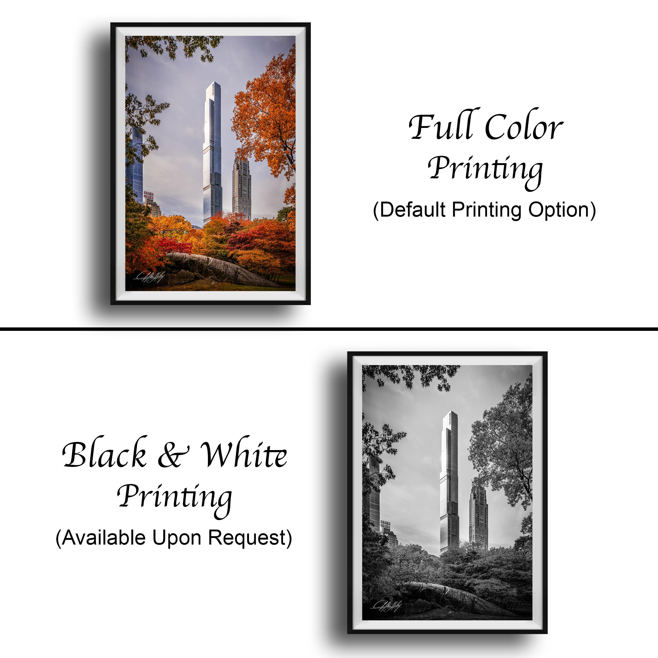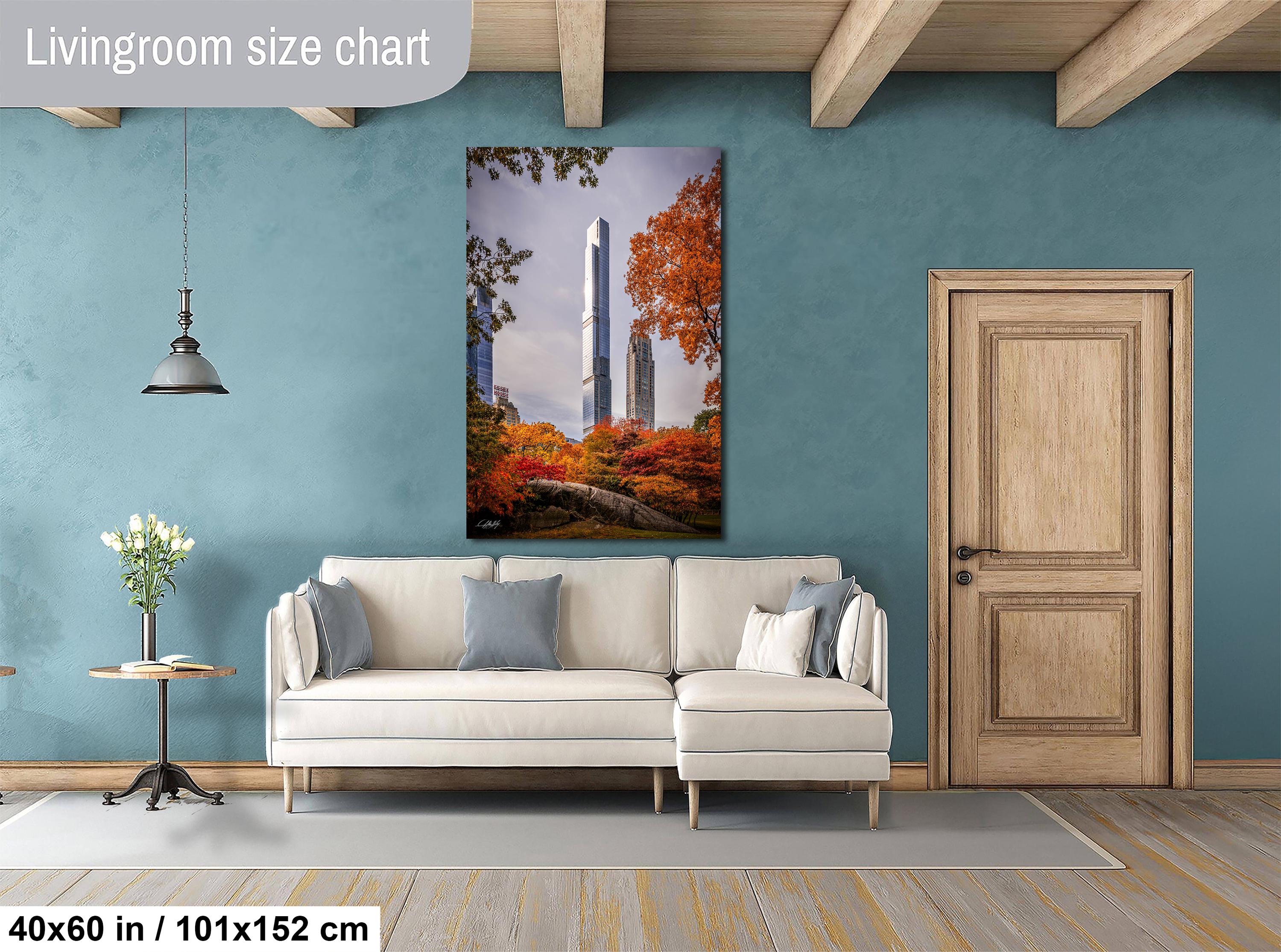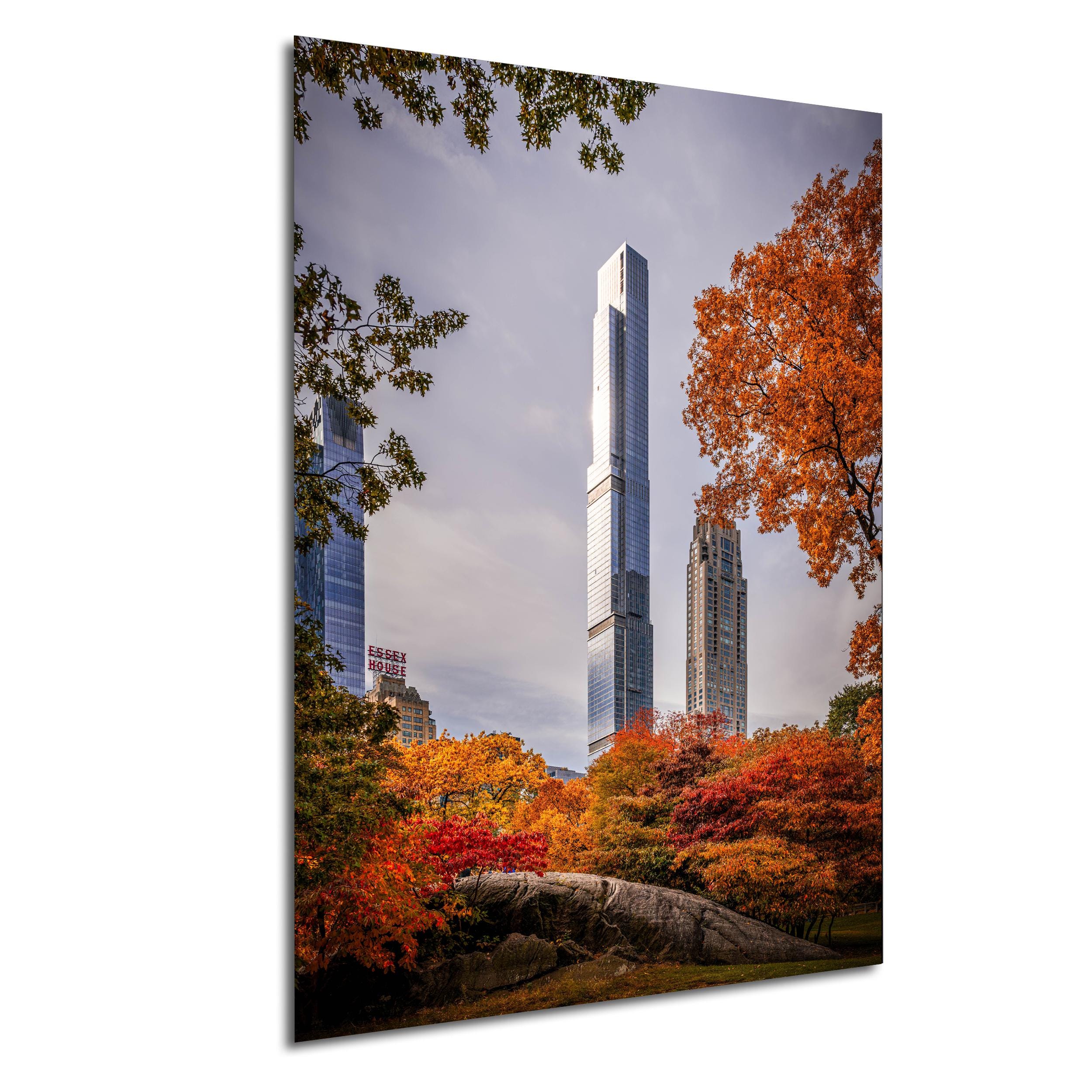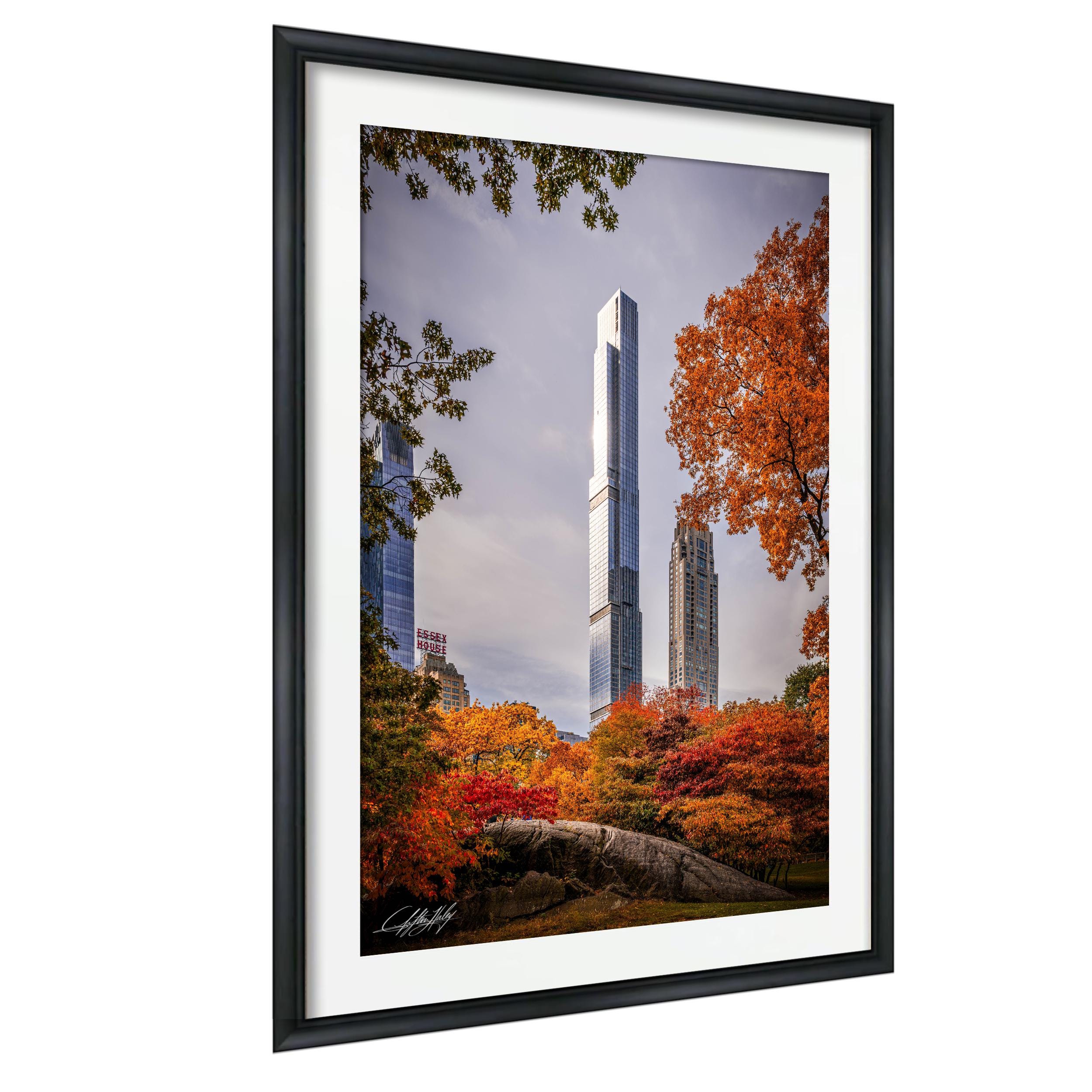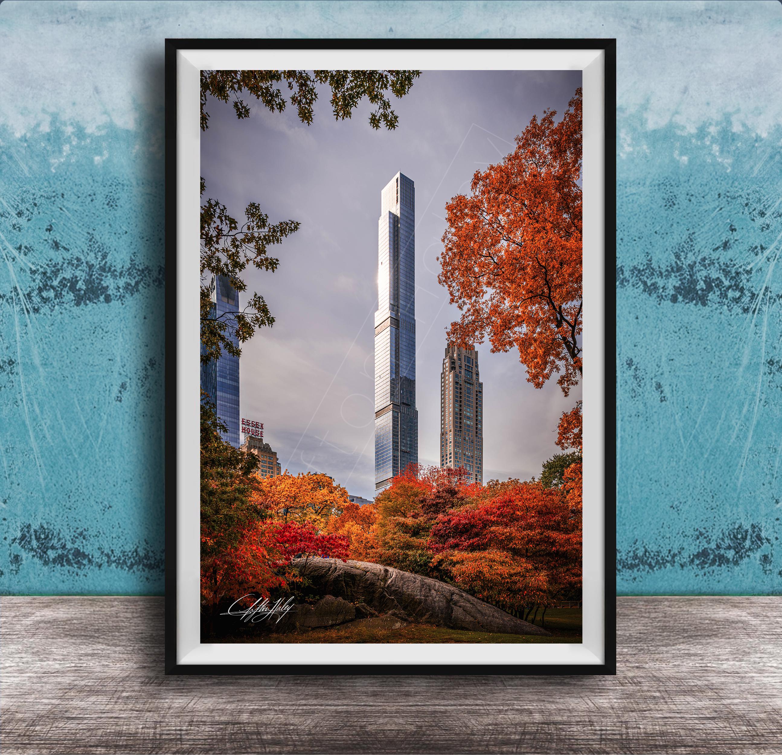Central Park Tower rises majestically against the vibrant hues of autumn in Manhattan, capturing the city's unique blend of urban elegance and natural beauty. This fine art photo print celebrates the golden hour glow that transforms New York City’s skyline into a breathtaking scene.