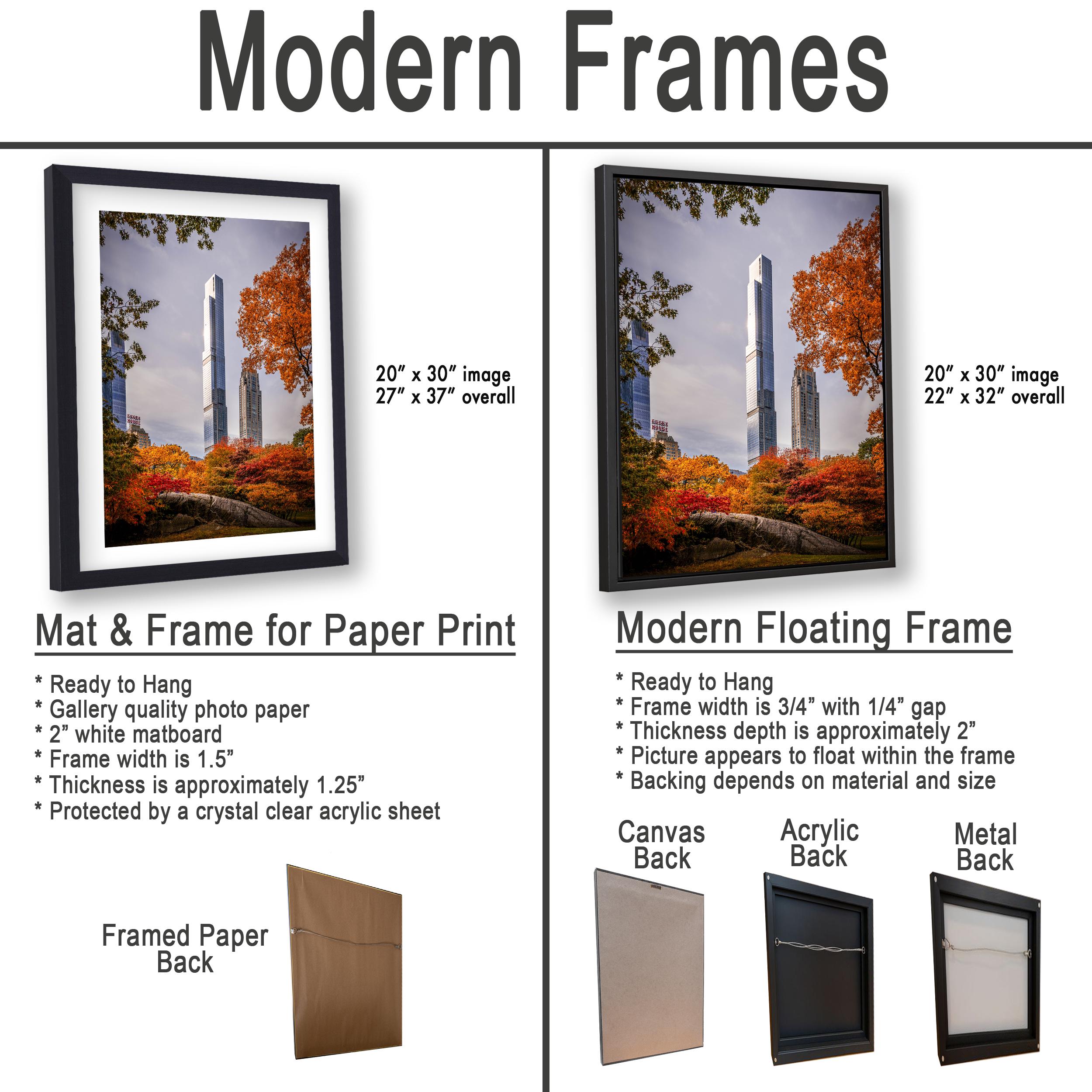 - Choose from framed paper prints, acrylics, or aluminum/metal prints featuring a 2" white mat border for elegant presentation. - Canvas prints are flush mounted without a mat border for a sleek look.