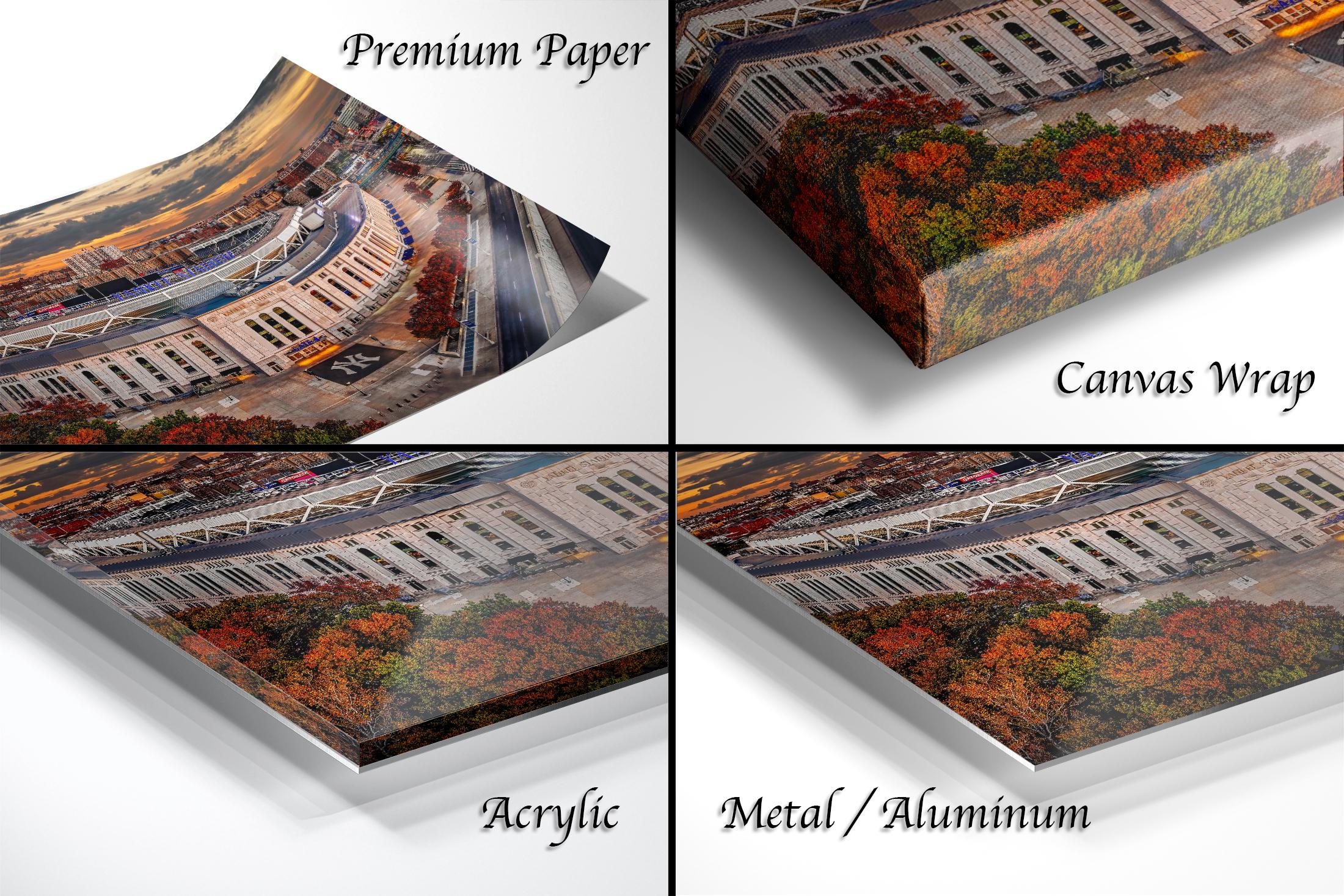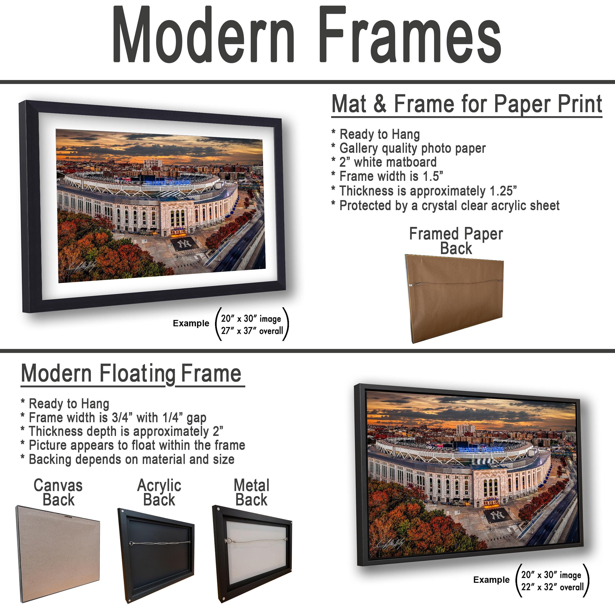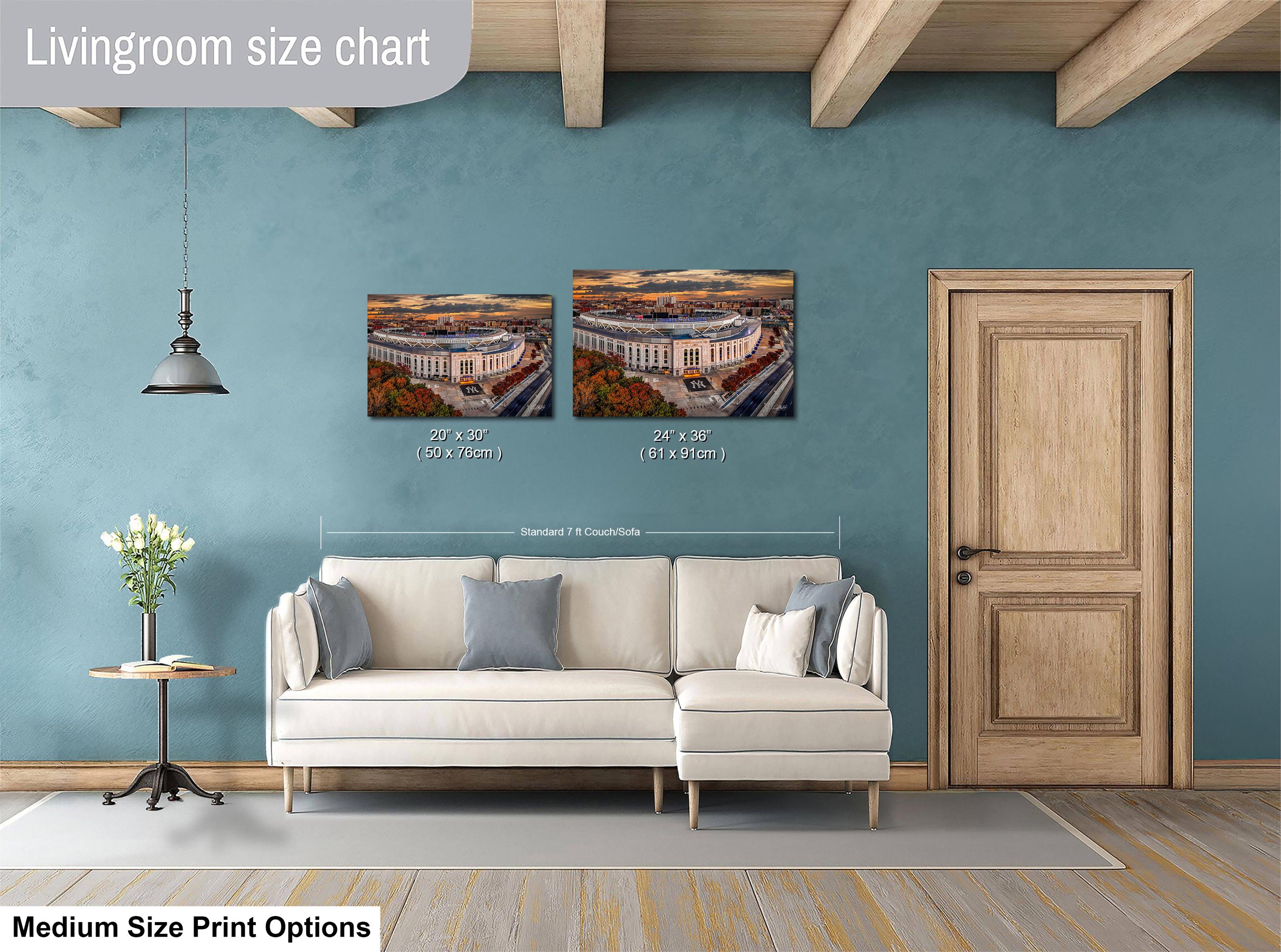 • Made-to-order fine art, ensuring your piece is unique and tailored just for you. • Available in framed paper prints, acrylics, aluminum metal prints with a 2" white mat border, or canvas prints with flush mounting—choose the perfect style for your man cave wall art or home. • Dimensions and materials vary by format; please select your preferred option when ordering. • This autumn baseball art beautifully blends urban landscape art with the crisp hues of fall stadium print imagery.