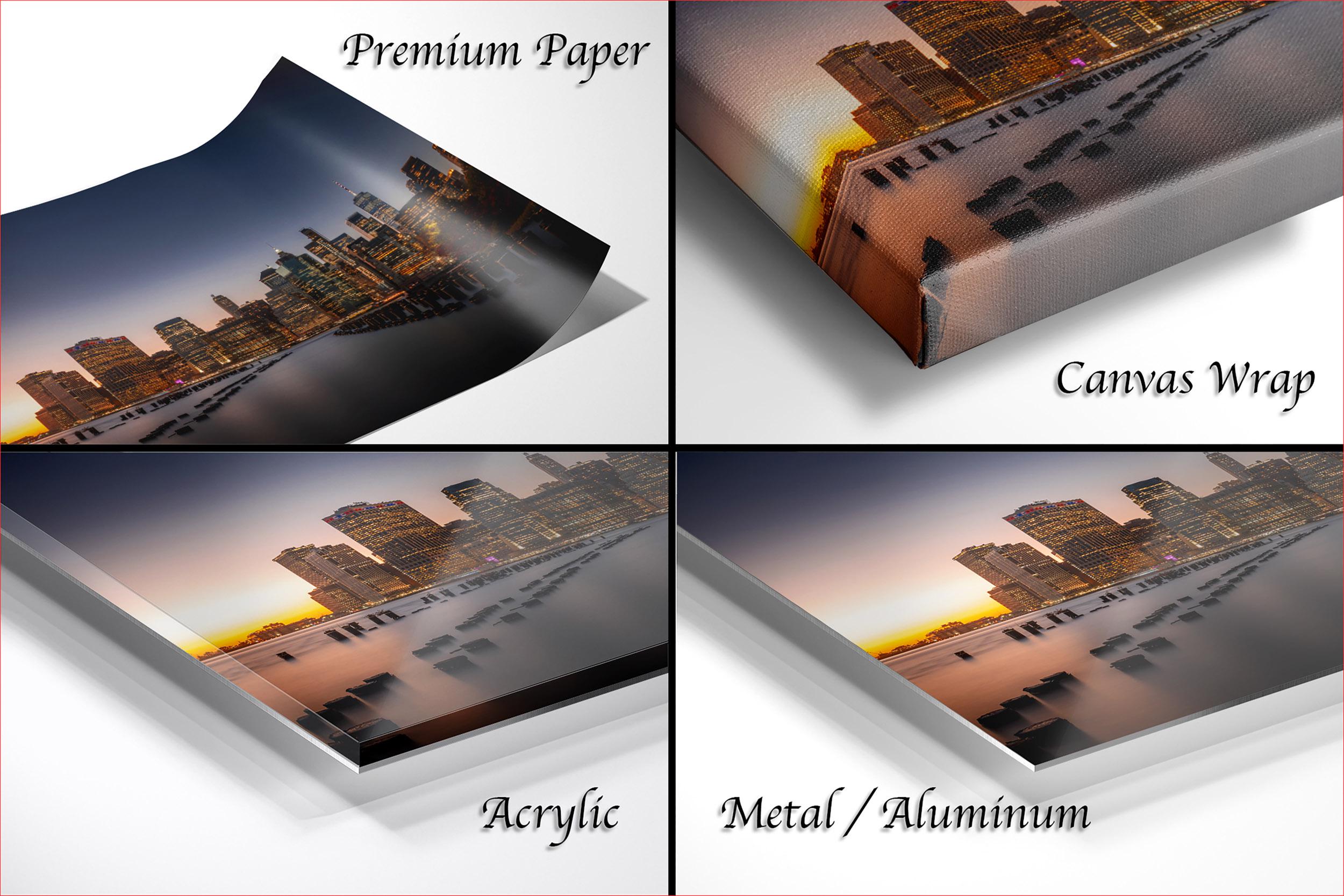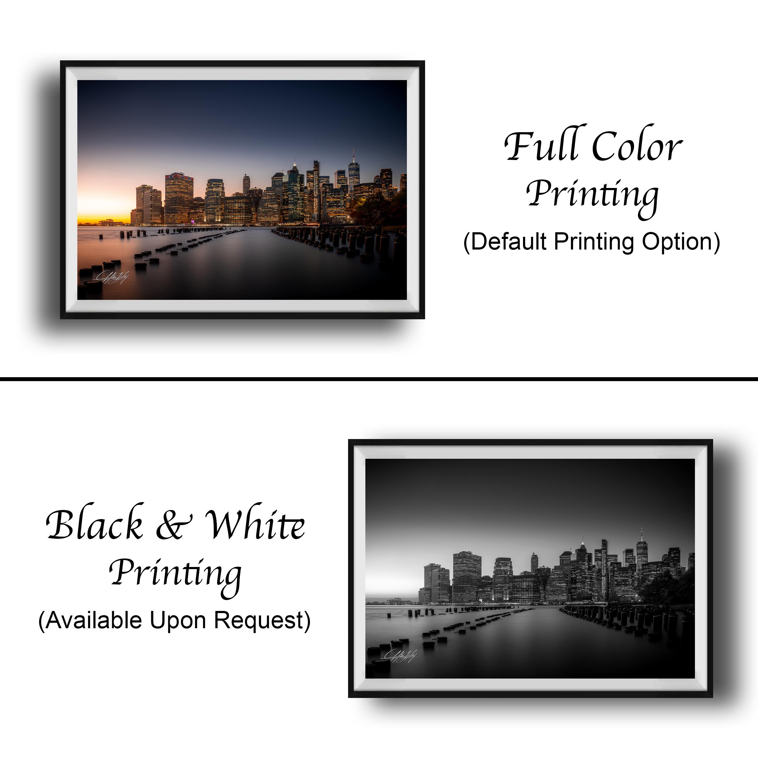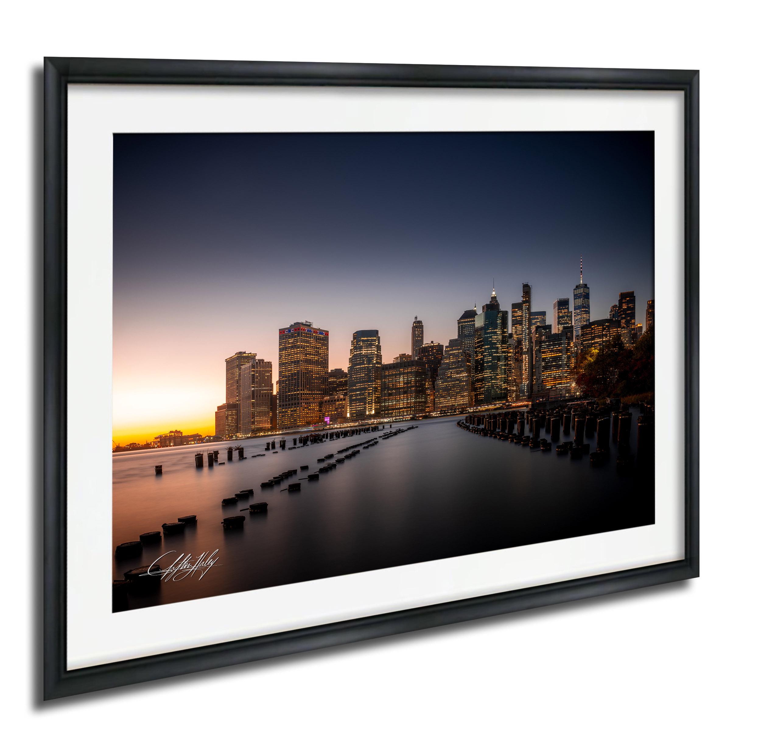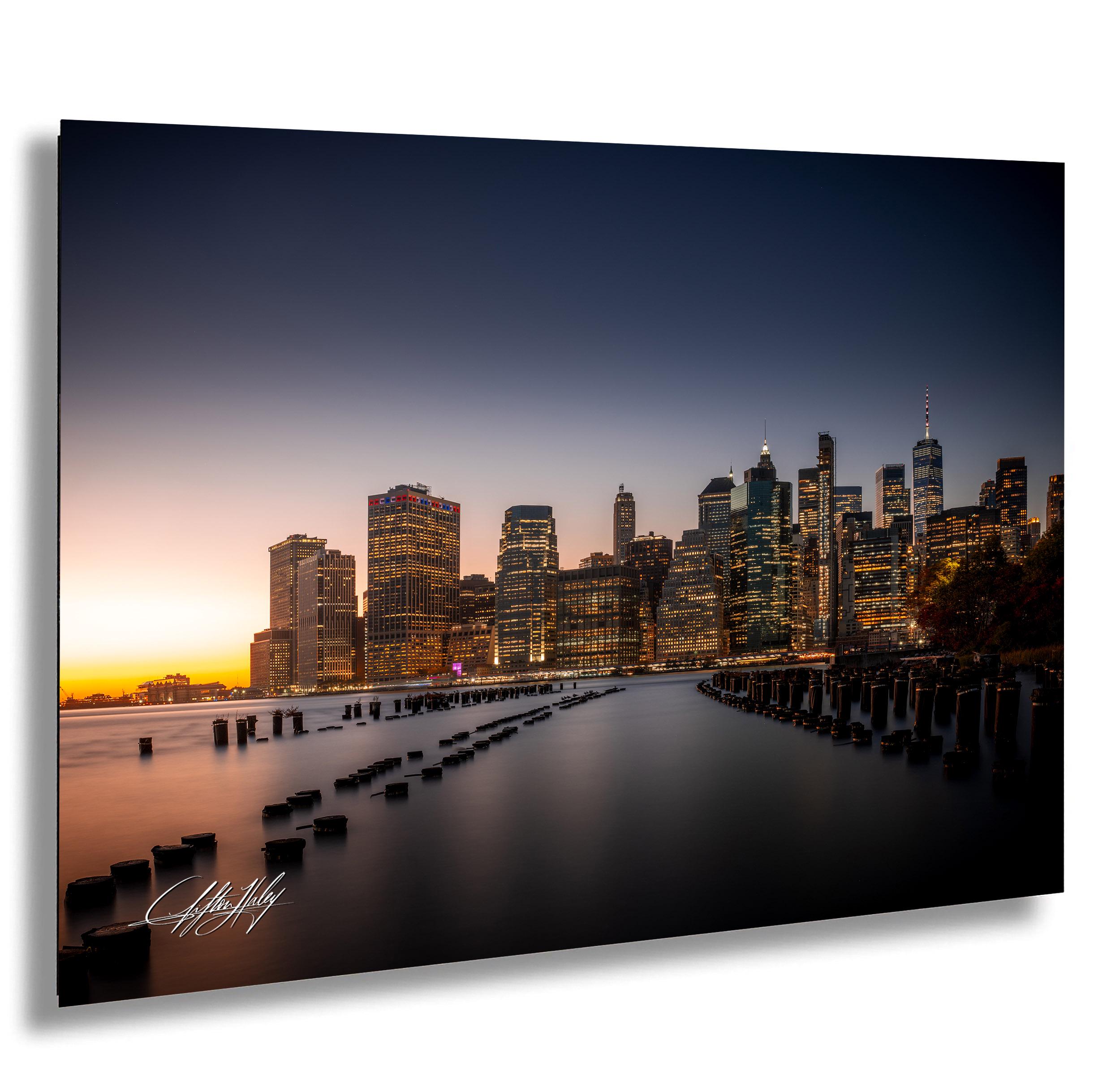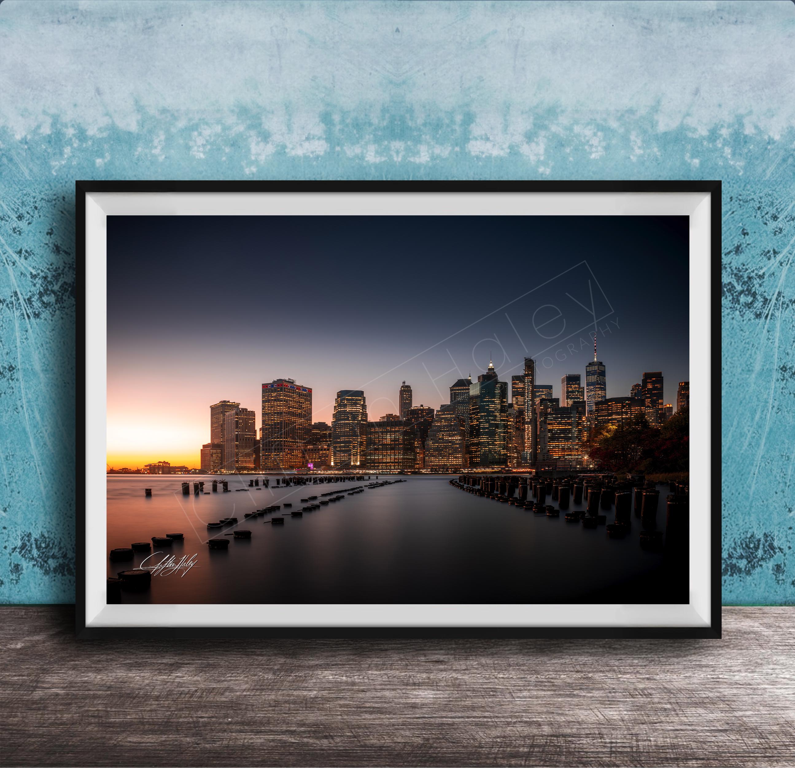 This fine art print immortalizes a breathtaking moment where long exposure photography reveals the city silhouette in a magical dance of light and shadow. Taken from Old Pier One, the image showcases NYC’s vibrant energy as day transitions to night, highlighting the Brooklyn Bridge and skyline bathed in golden hues.