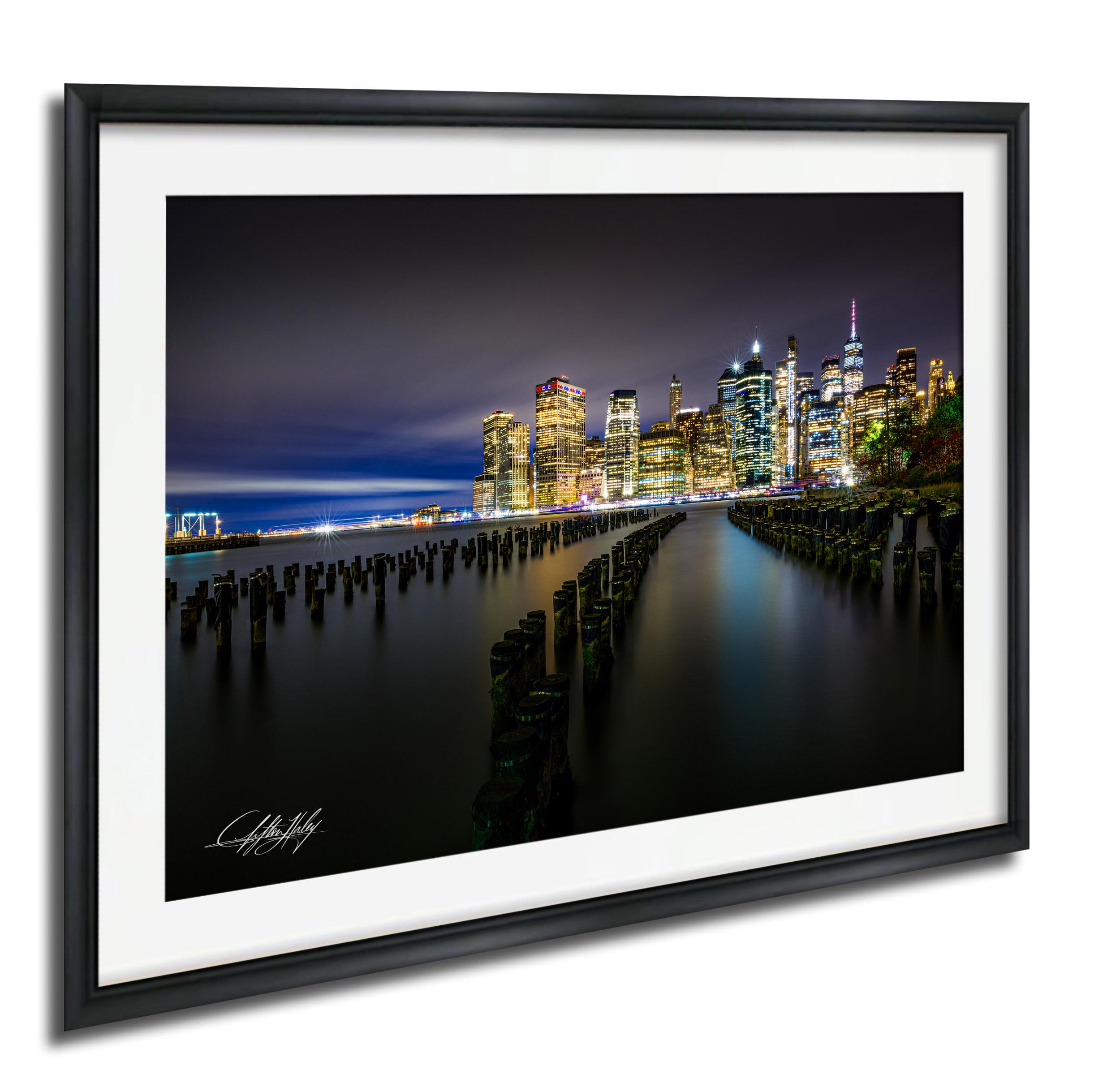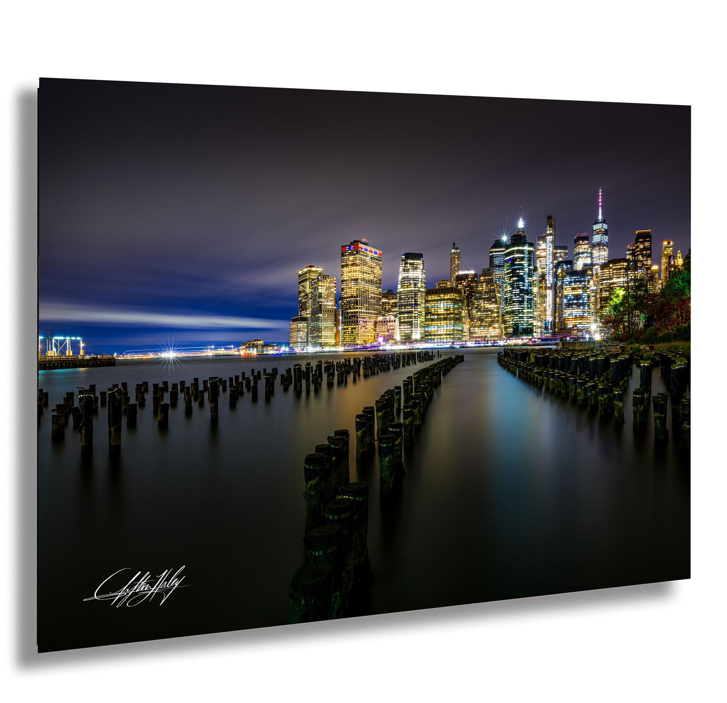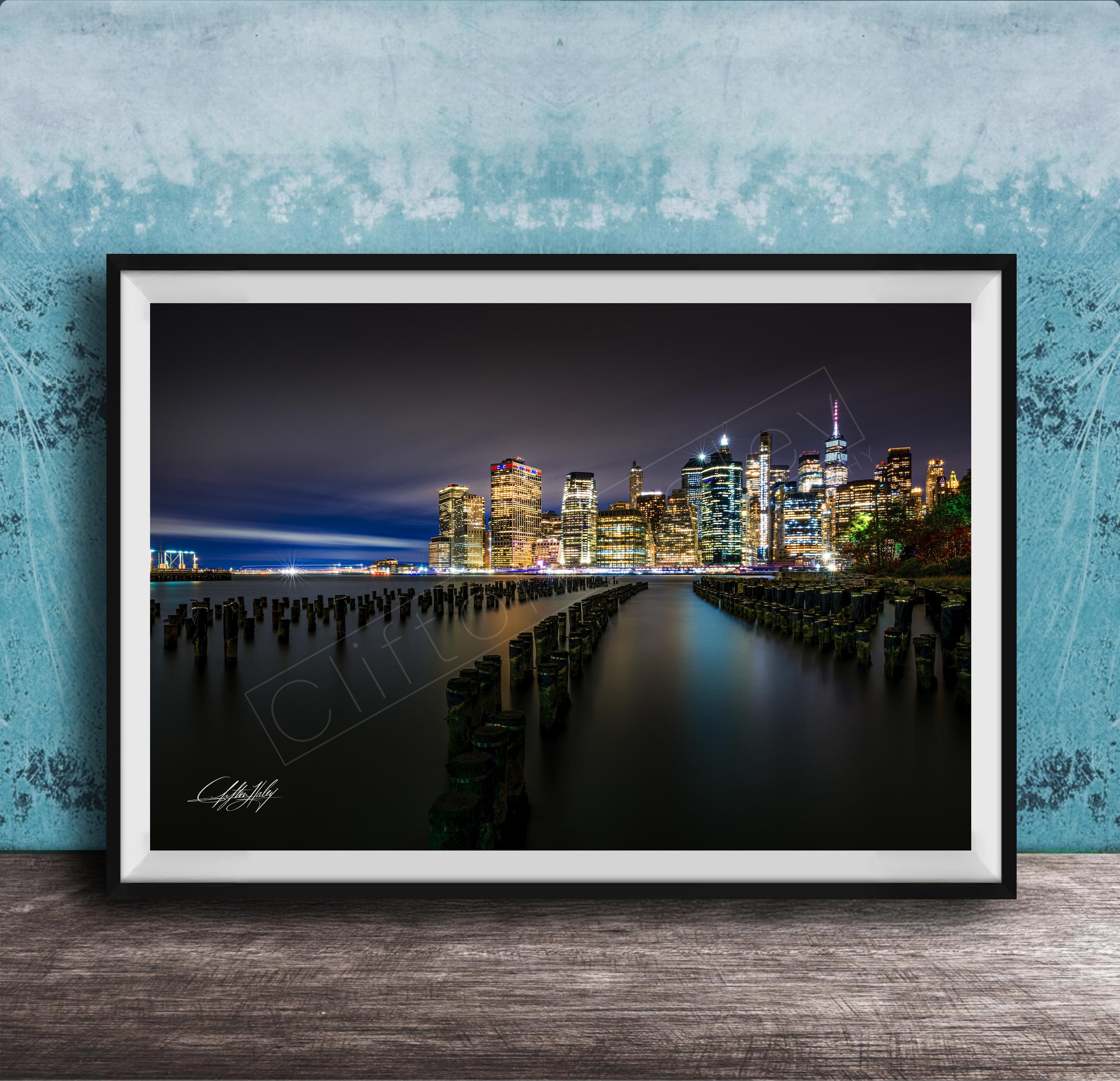 Experience the captivating beauty of old pier one, New York City, and the NYC skyline during the magical blue hour and twilight. This fine art print captures the Brooklyn Bridge and Big Apple in stunning long exposure detail.