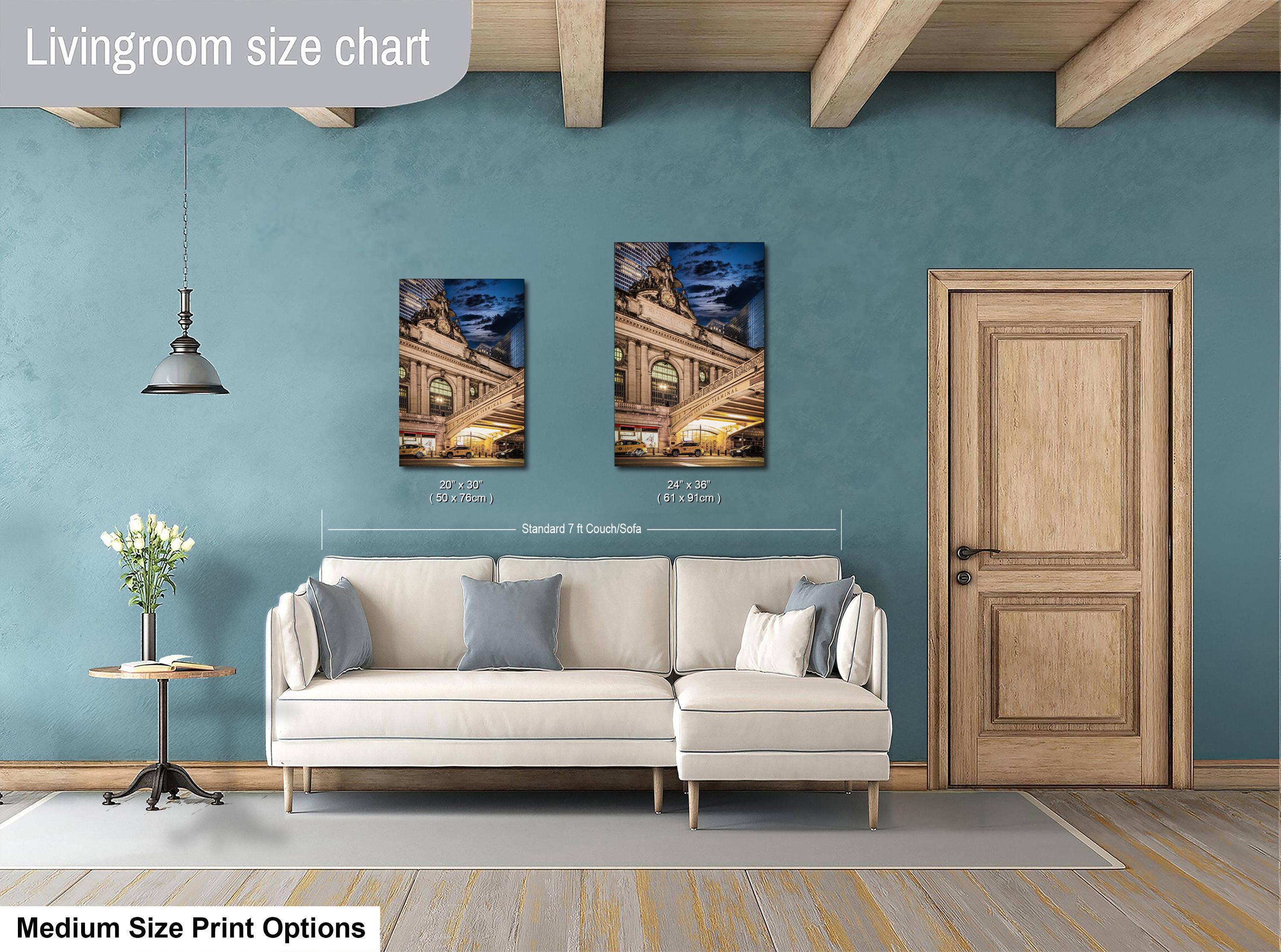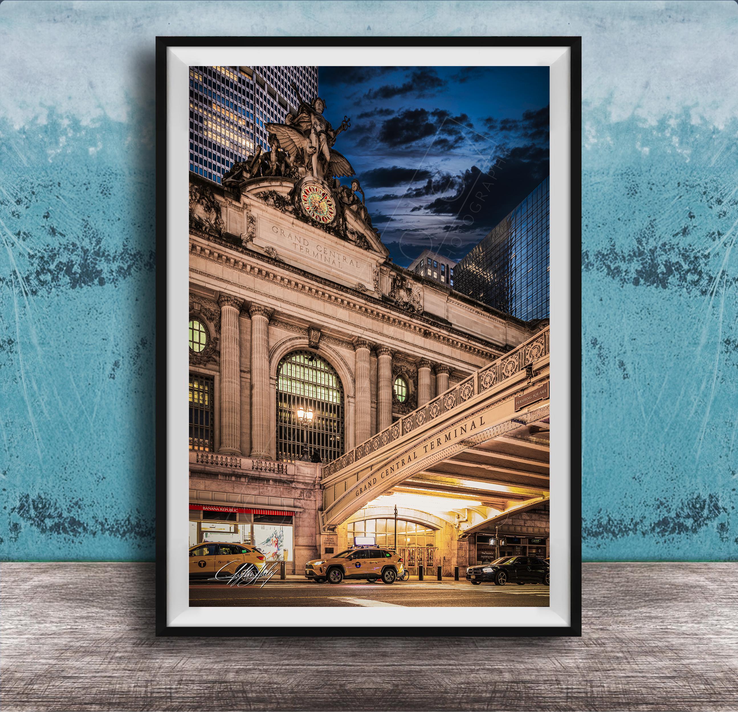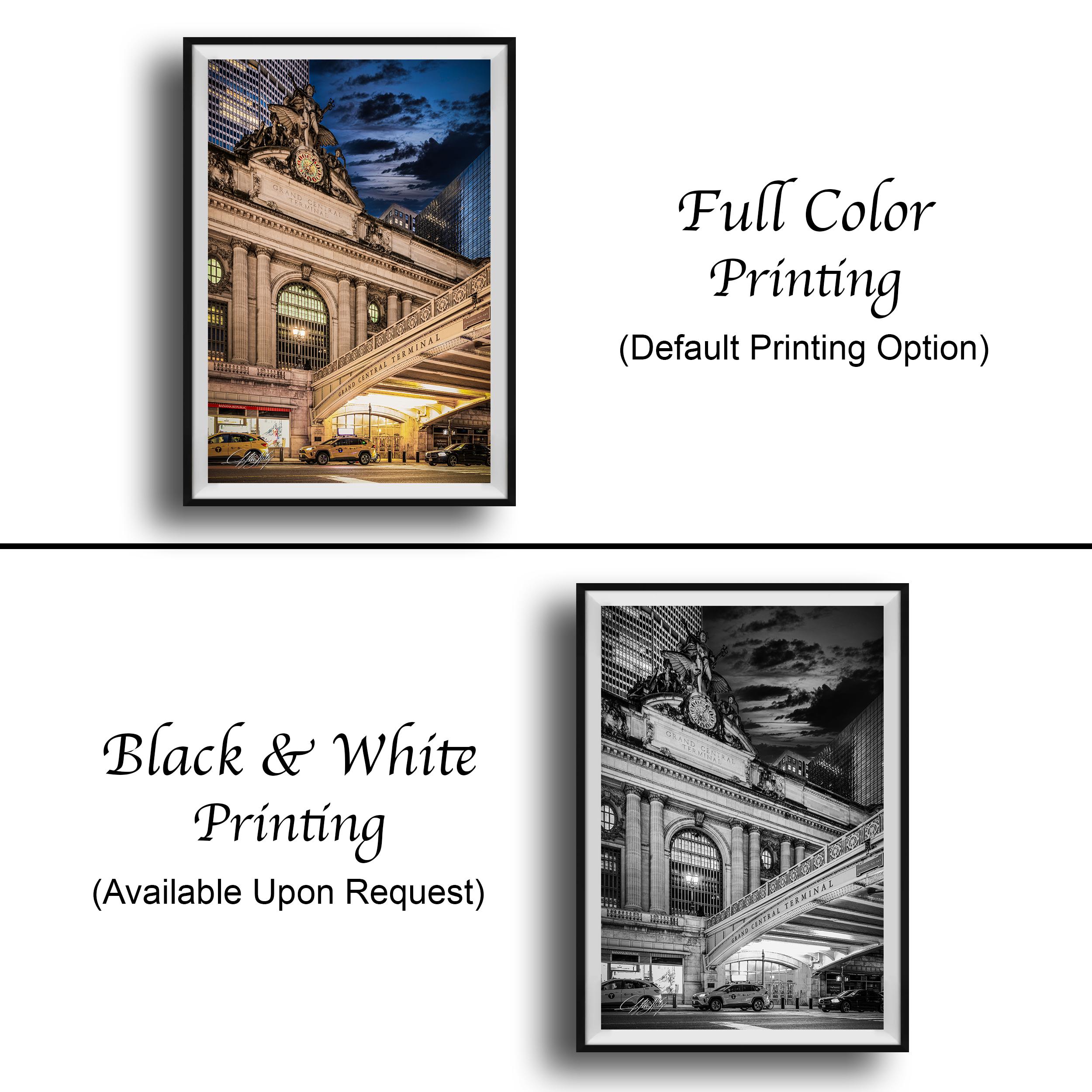 Capture the timeless beauty of New York City with this stunning vintage black and white photo print of Grand Central Station. Perfect for NYC lovers and train station enthusiasts, this wall art showcases the iconic NYC train terminal at night, highlighting its majestic architecture illuminated against a dramatic evening sky.
