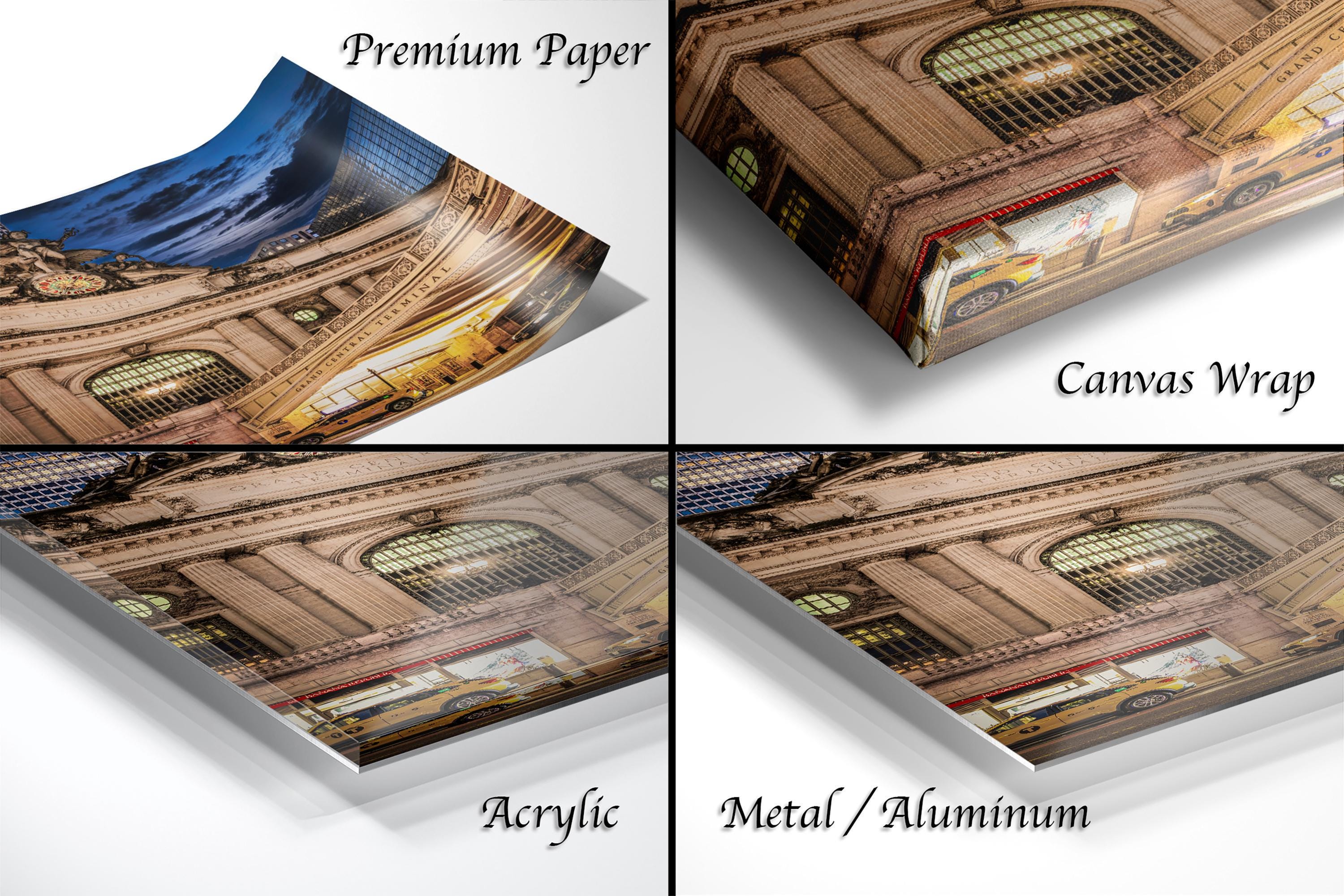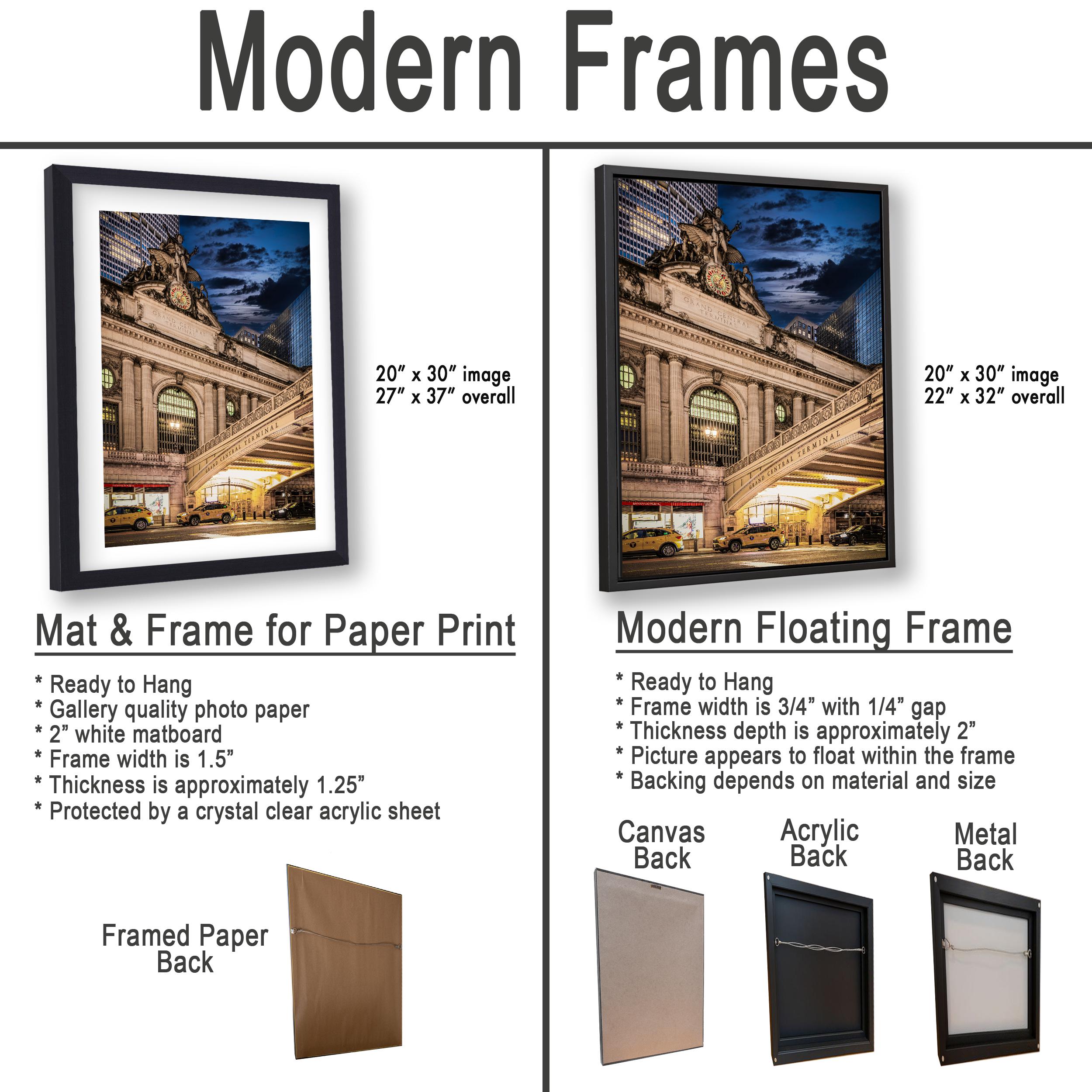 3.1) Only framed paper prints, acrylics and aluminum/metal prints will have a 2" white mat border. 3.2) Canvas prints will be a flush mounted (no mat border) to the frame.