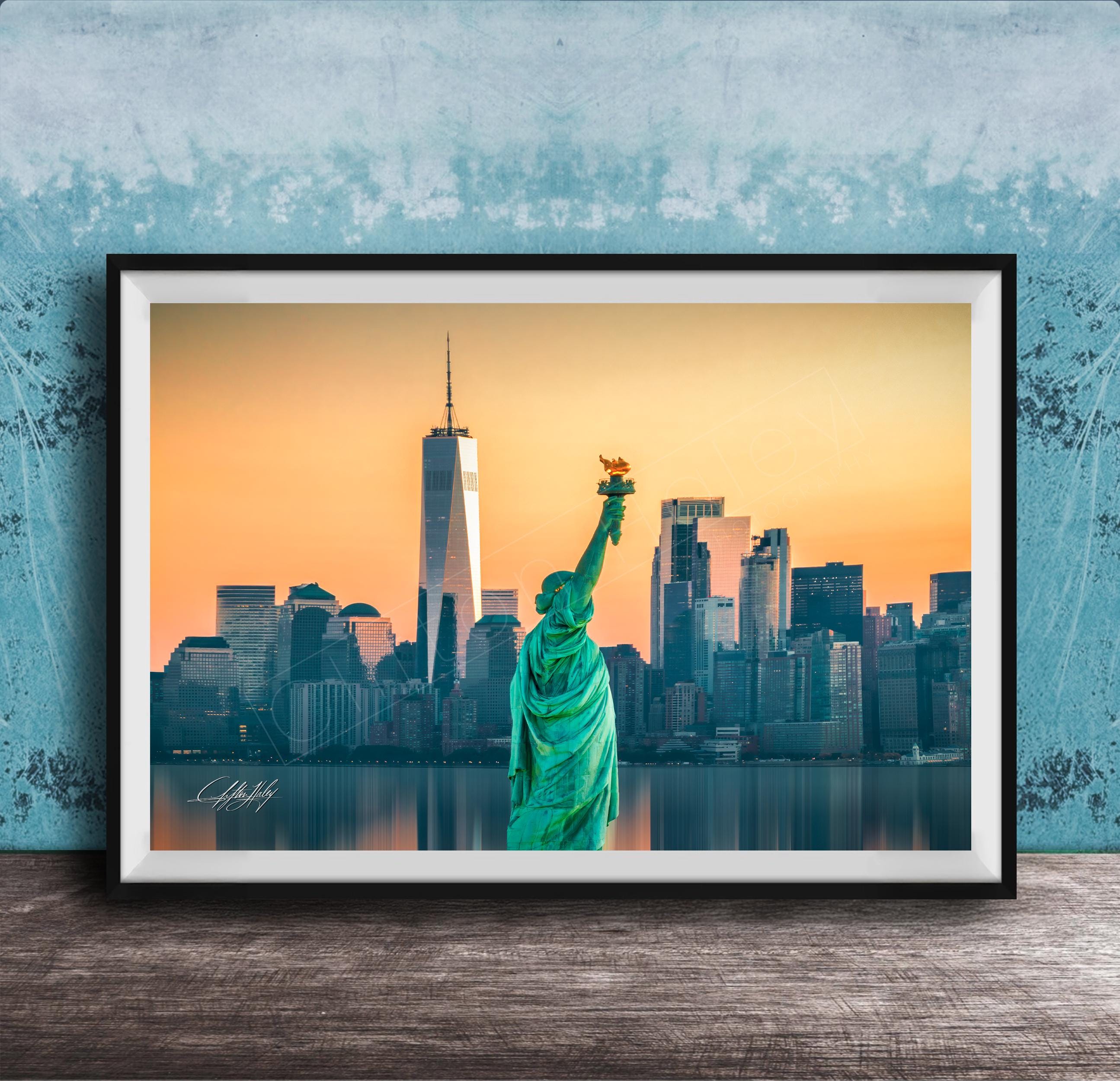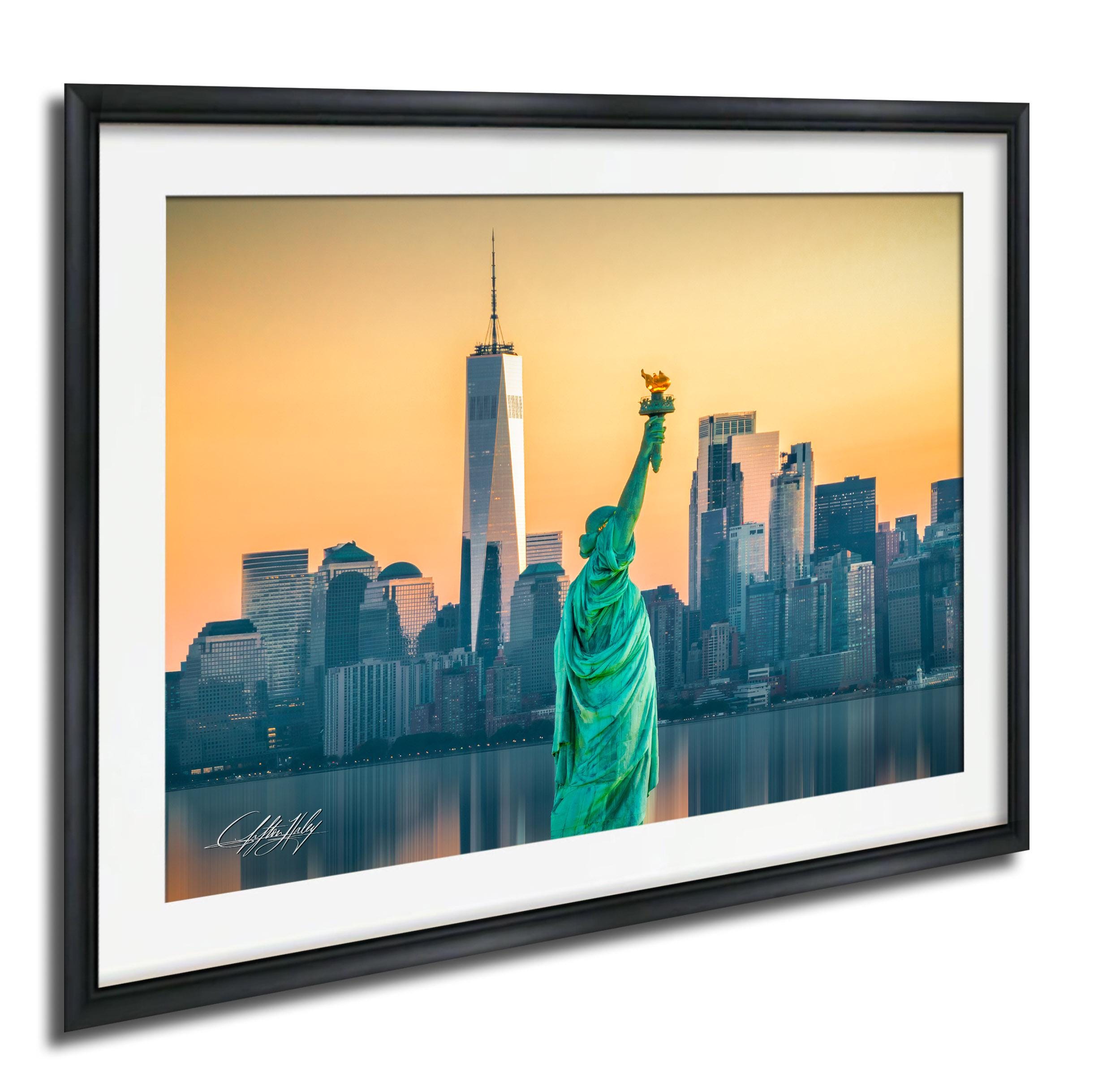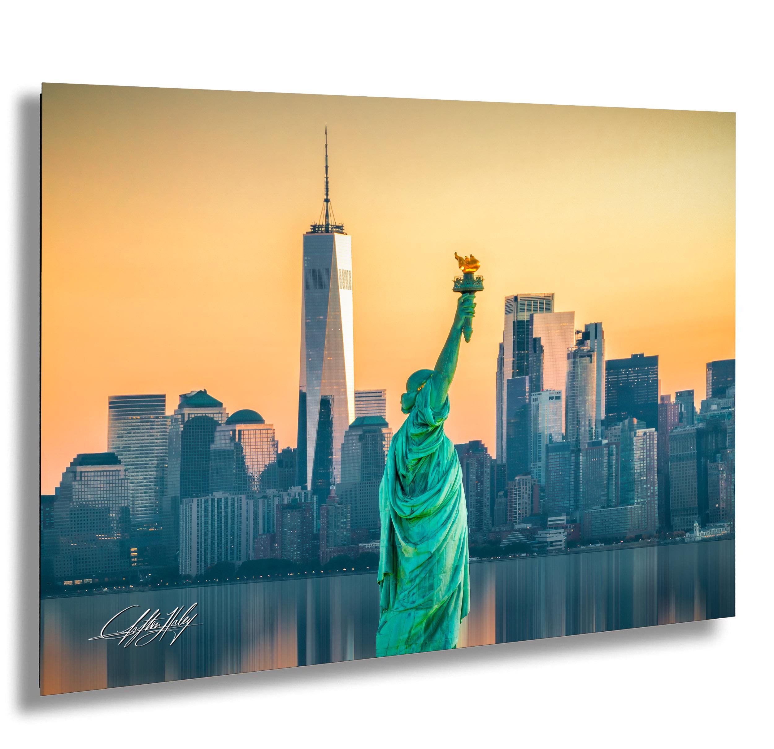 Infuse your space with the energy of New York City through this striking sunrise cityscape print. Featuring the Statue of Liberty framed by the glowing NYC skyline at dawn, this artwork blends bold urban charm with golden morning light. A perfect piece for fans of city art, vintage maps, or pop culture, it captures the enduring magic of the Big Apple.