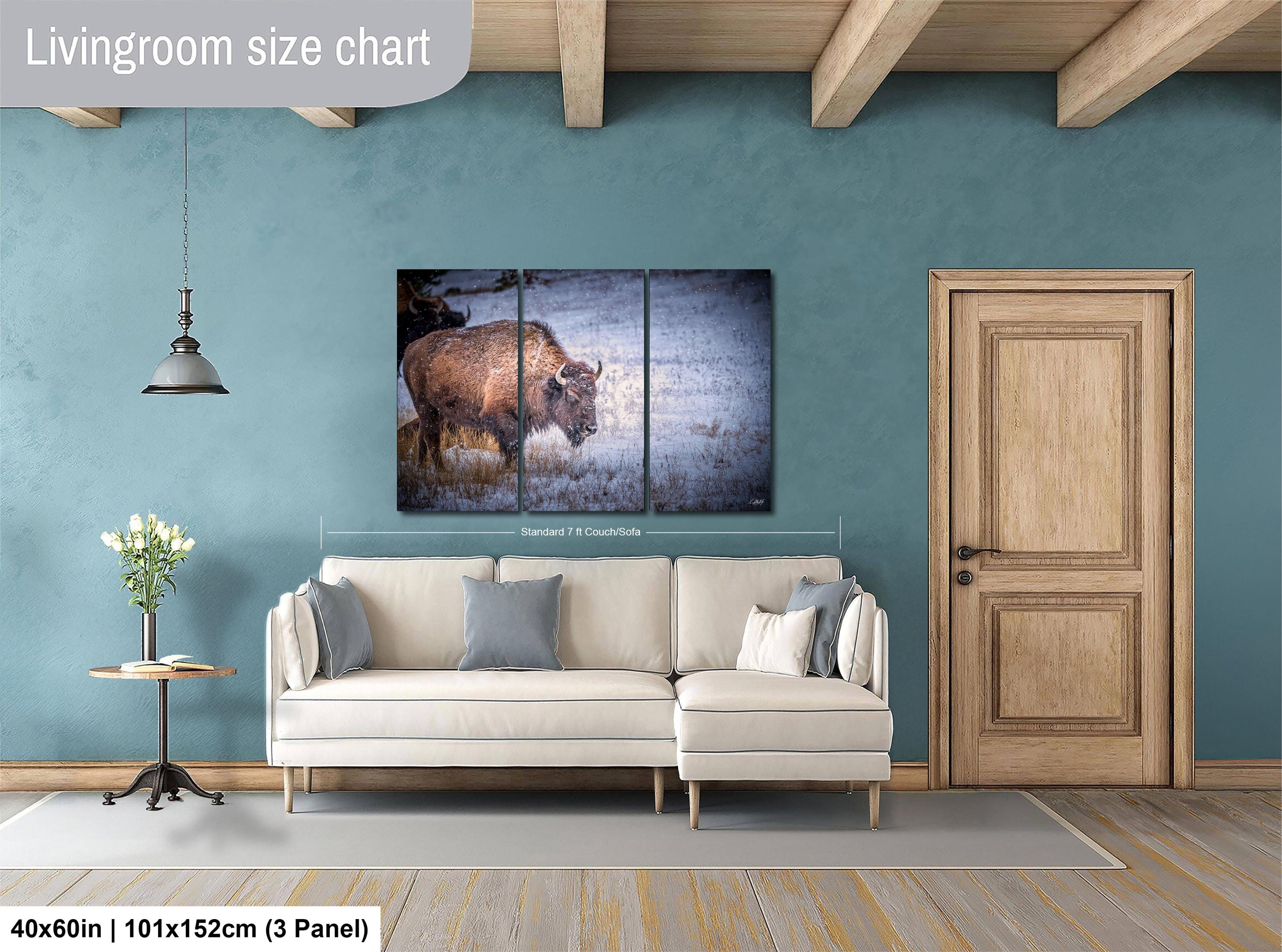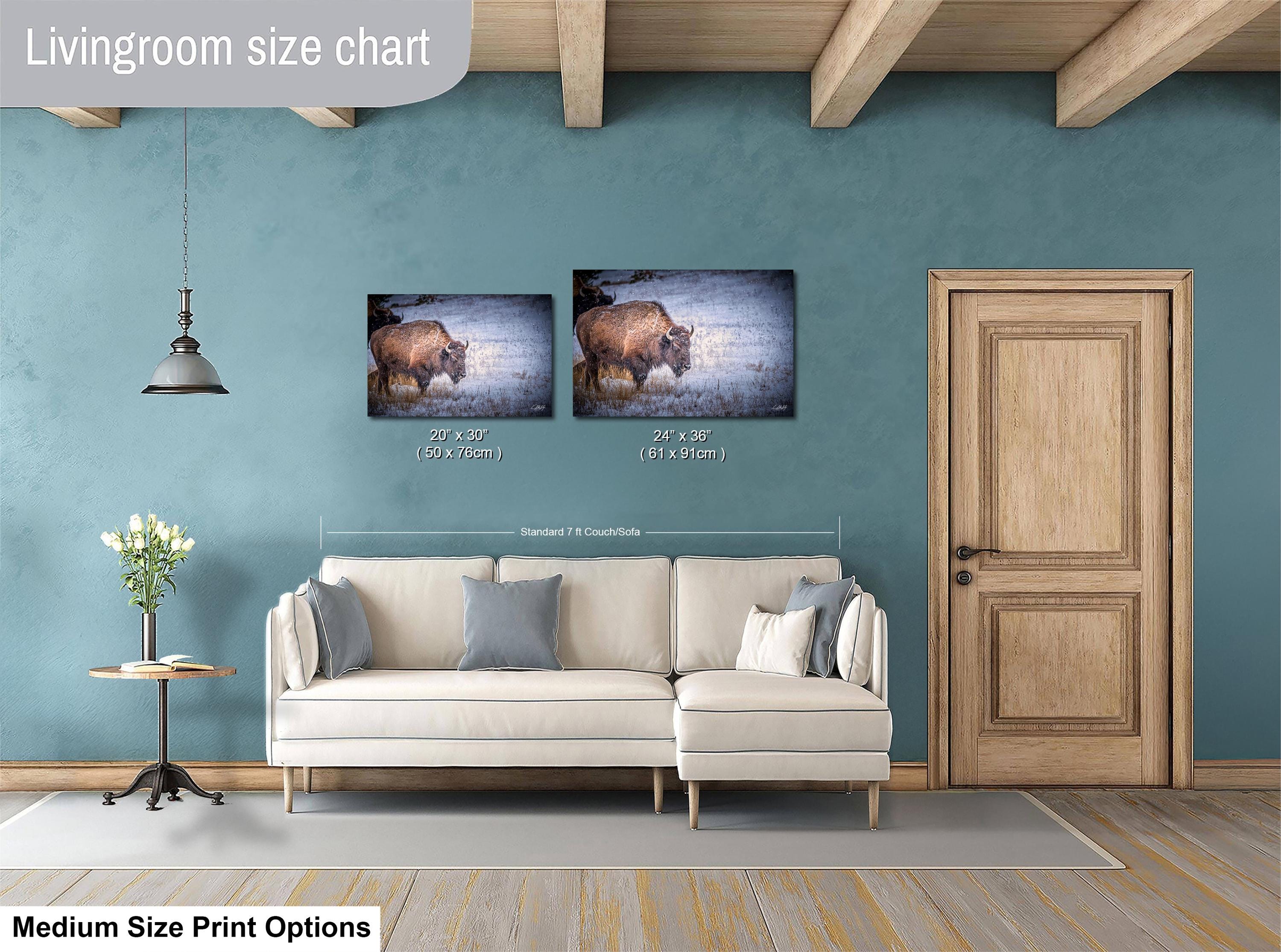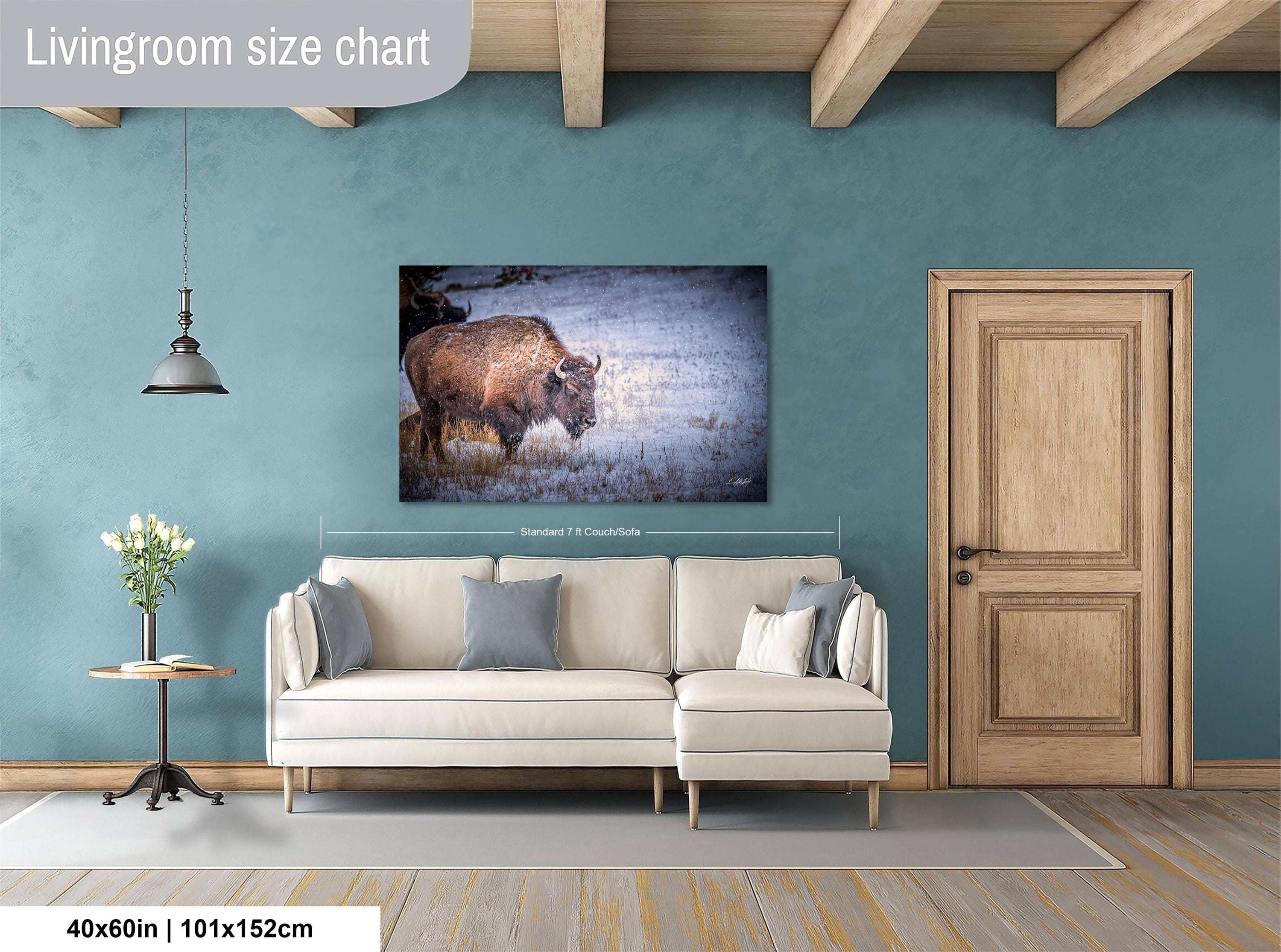 • Made to order fine art canvas print featuring a snow-dusted bison in its natural habitat • Flush mounted canvas with no mat border for a sleek, modern presentation • Artist's signature authenticates each piece, adding exclusive value and charm • Dimensions optimized for large wall spaces—ideal for rustic office decor or cozy mountain cabin settings • Perfect gift for wildlife lovers and those who appreciate earth tone wall art