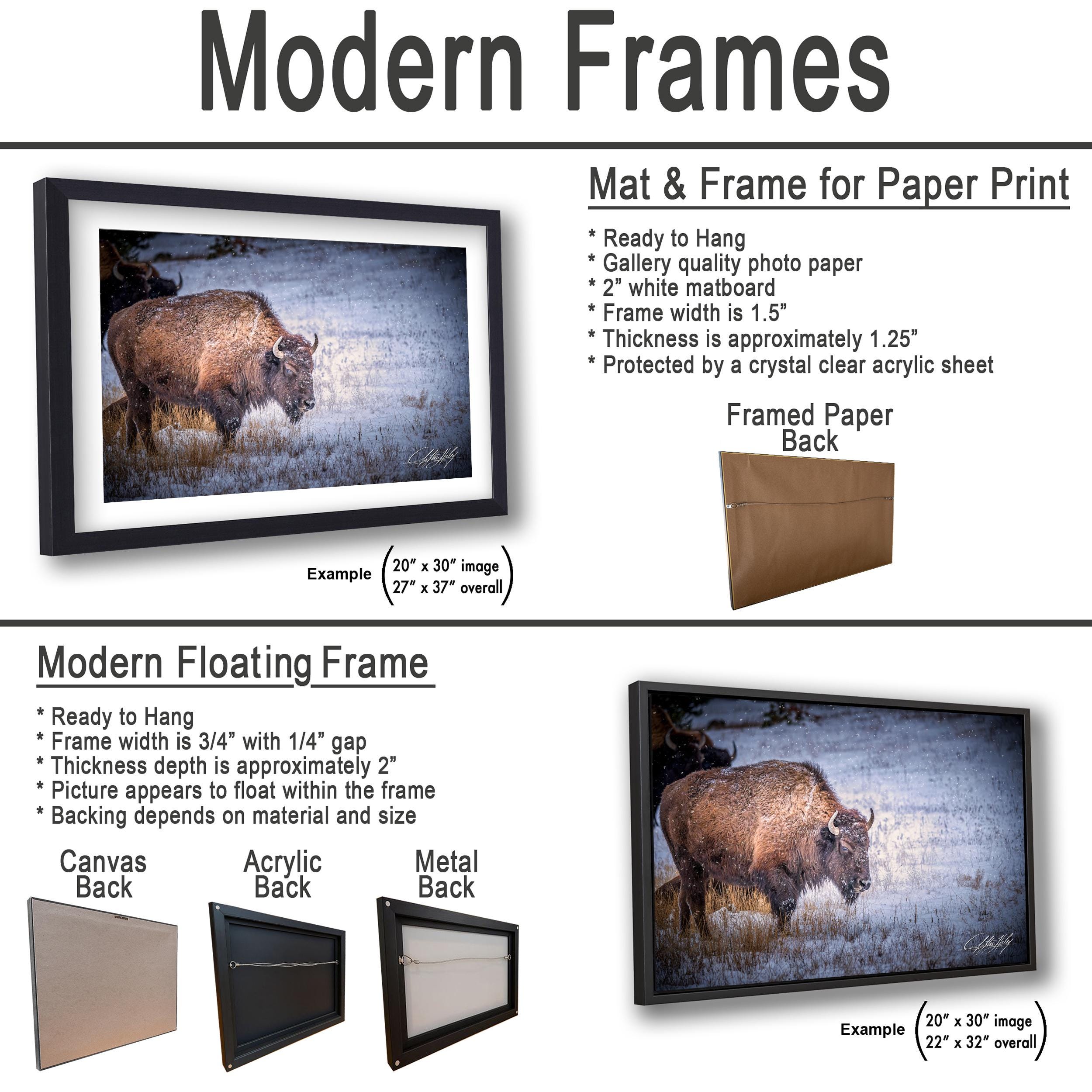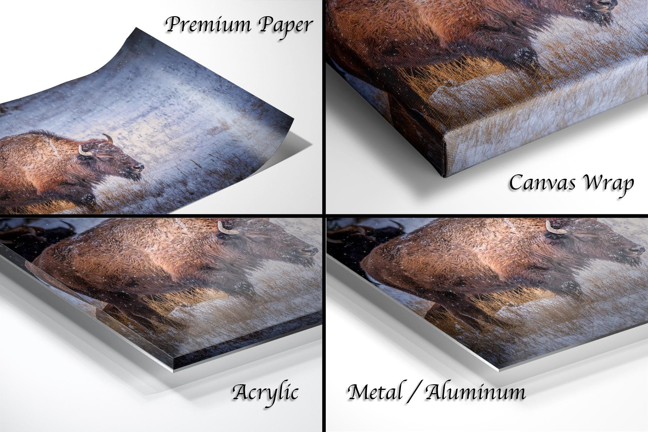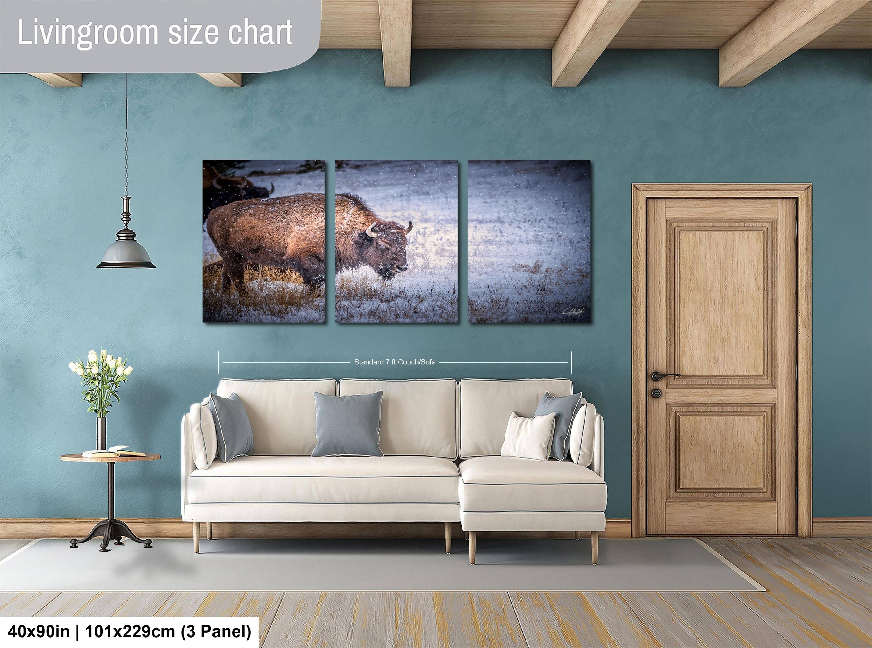 • Made to order fine art canvas print featuring a snow-dusted bison in its natural habitat • Flush mounted canvas with no mat border for a sleek, modern presentation • Artist's signature authenticates each piece, adding exclusive value and charm • Dimensions optimized for large wall spaces—ideal for rustic office decor or cozy mountain cabin settings • Perfect gift for wildlife lovers and those who appreciate earth tone wall art