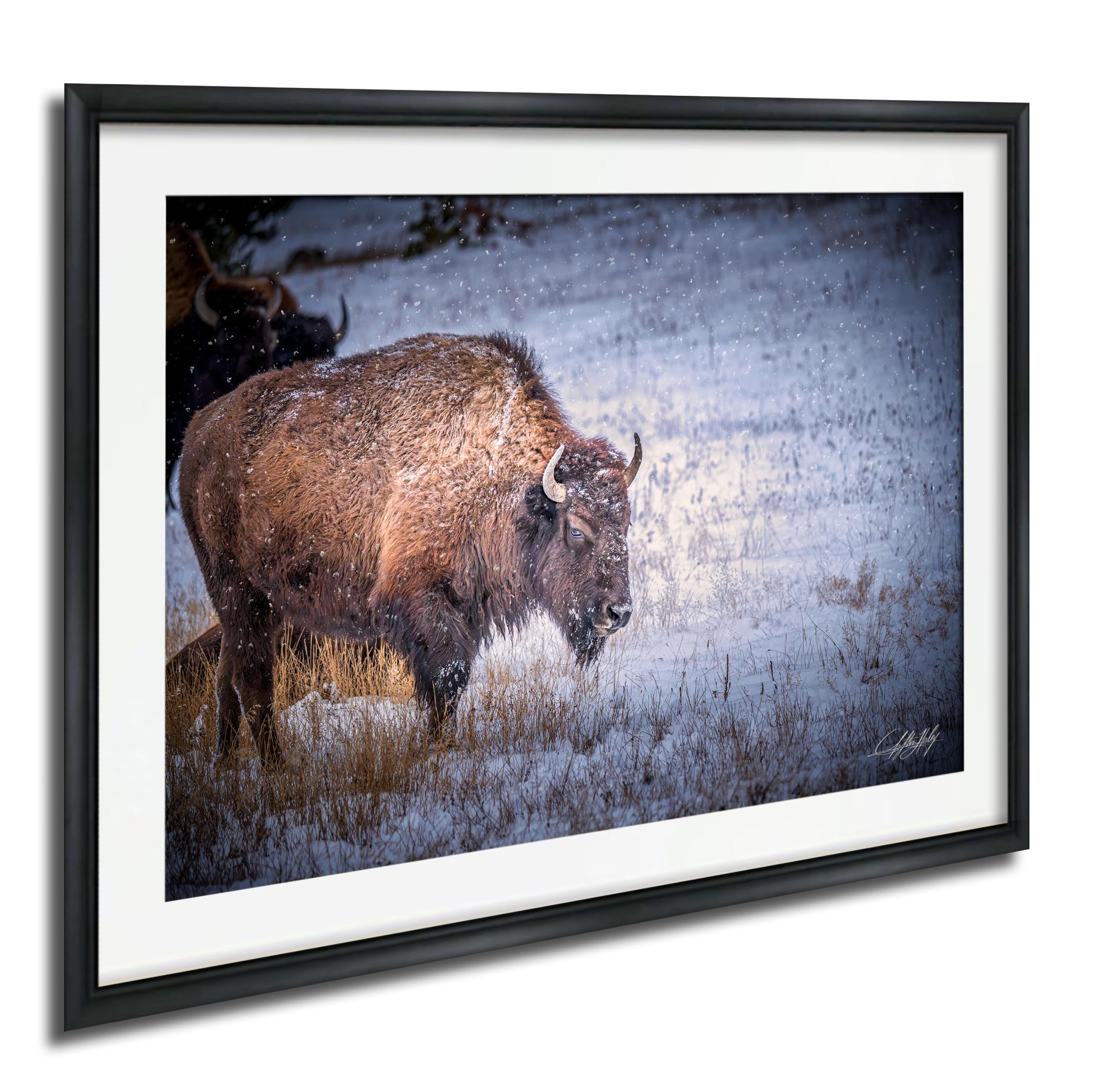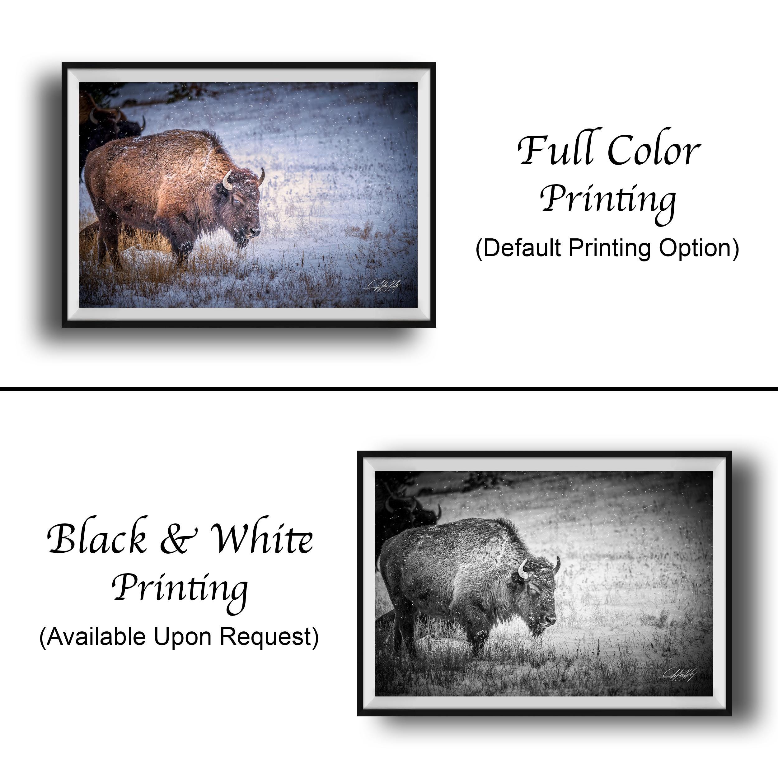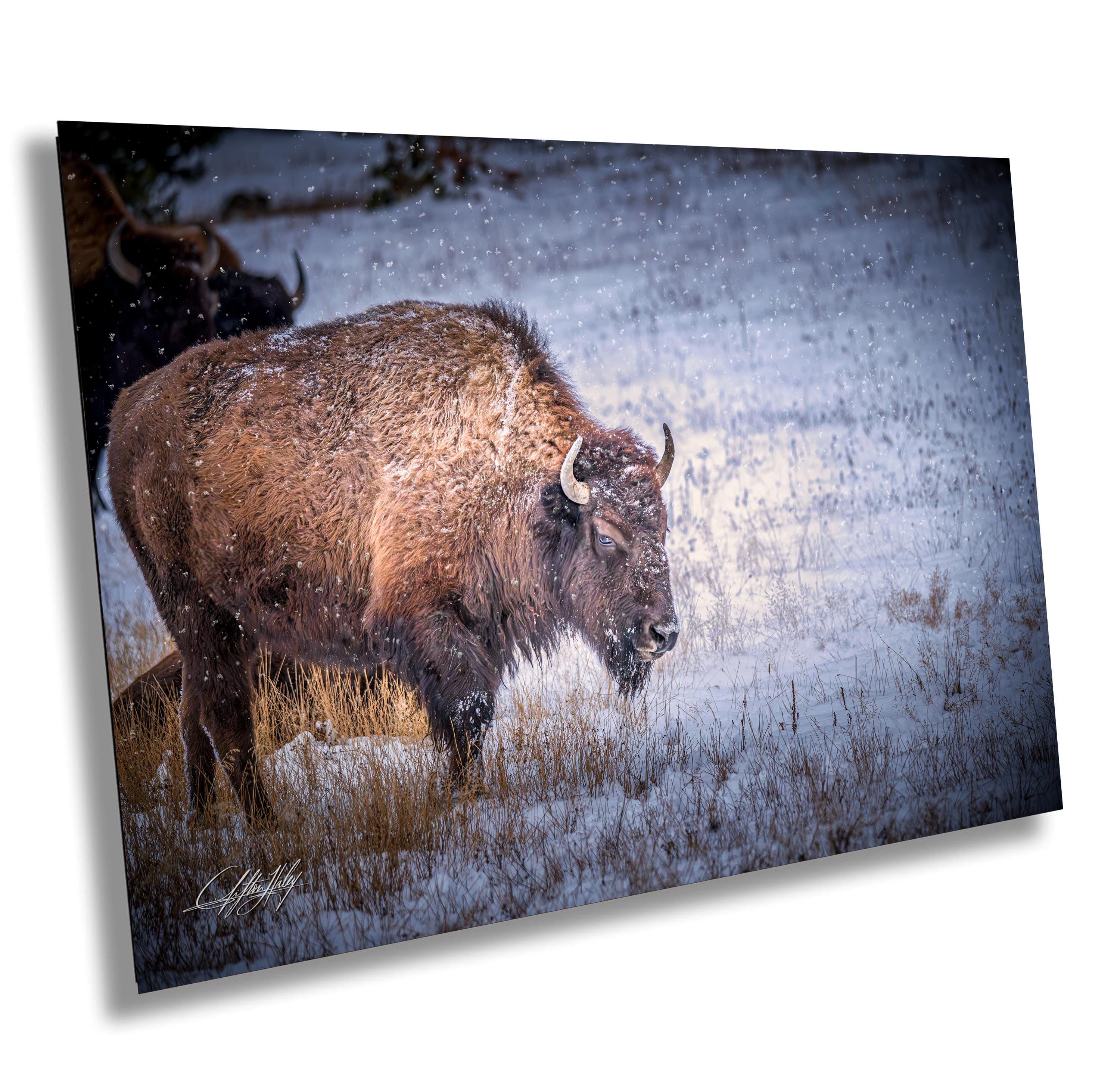 This artwork invites you to bring the serene wilderness indoors, evoking the crisp air of Yellowstone and the peaceful presence of these majestic creatures. The shaggy bison print showcases intricate details from the soft snowflakes to the visible breath in cold air, embodying a moment of stillness and respect for nature.