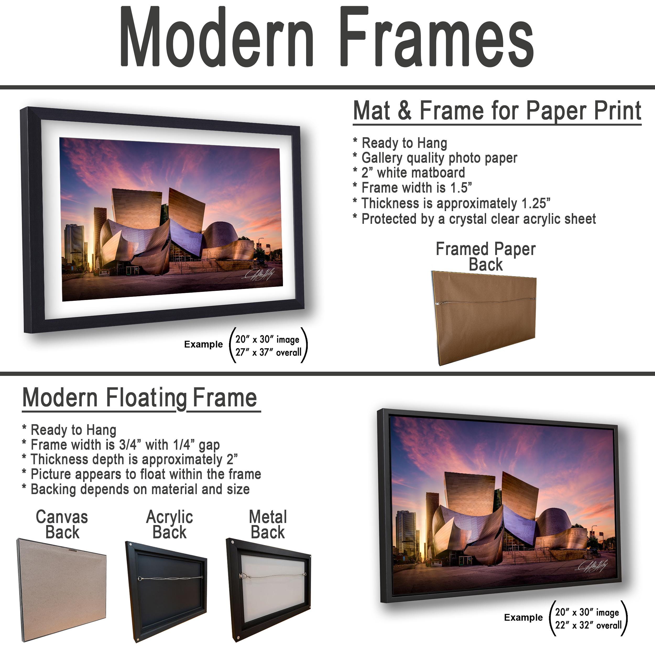 3.1) Only framed paper prints, acrylics and aluminum/metal prints will have a 2" white mat border. 3.2) Canvas prints will be a flush mounted (no mat border) to the frame.