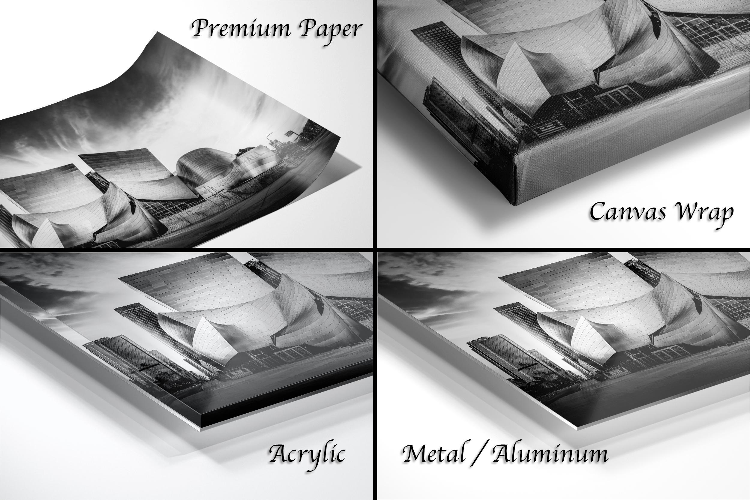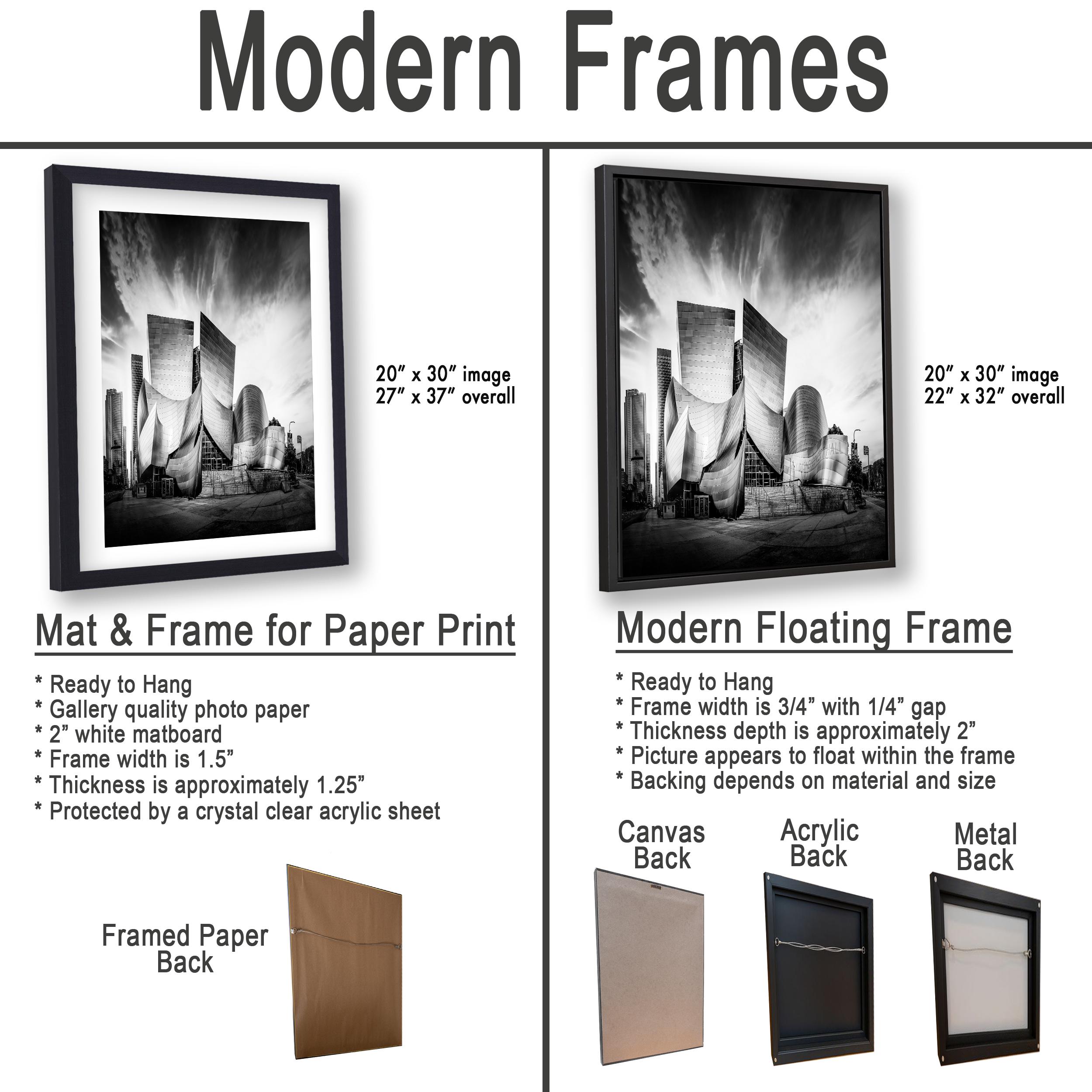 3.1) Only framed paper prints, acrylics and aluminum/metal prints will have a 2" white mat border. 3.2) Canvas prints will be a flush mounted (no mat border) to the frame.