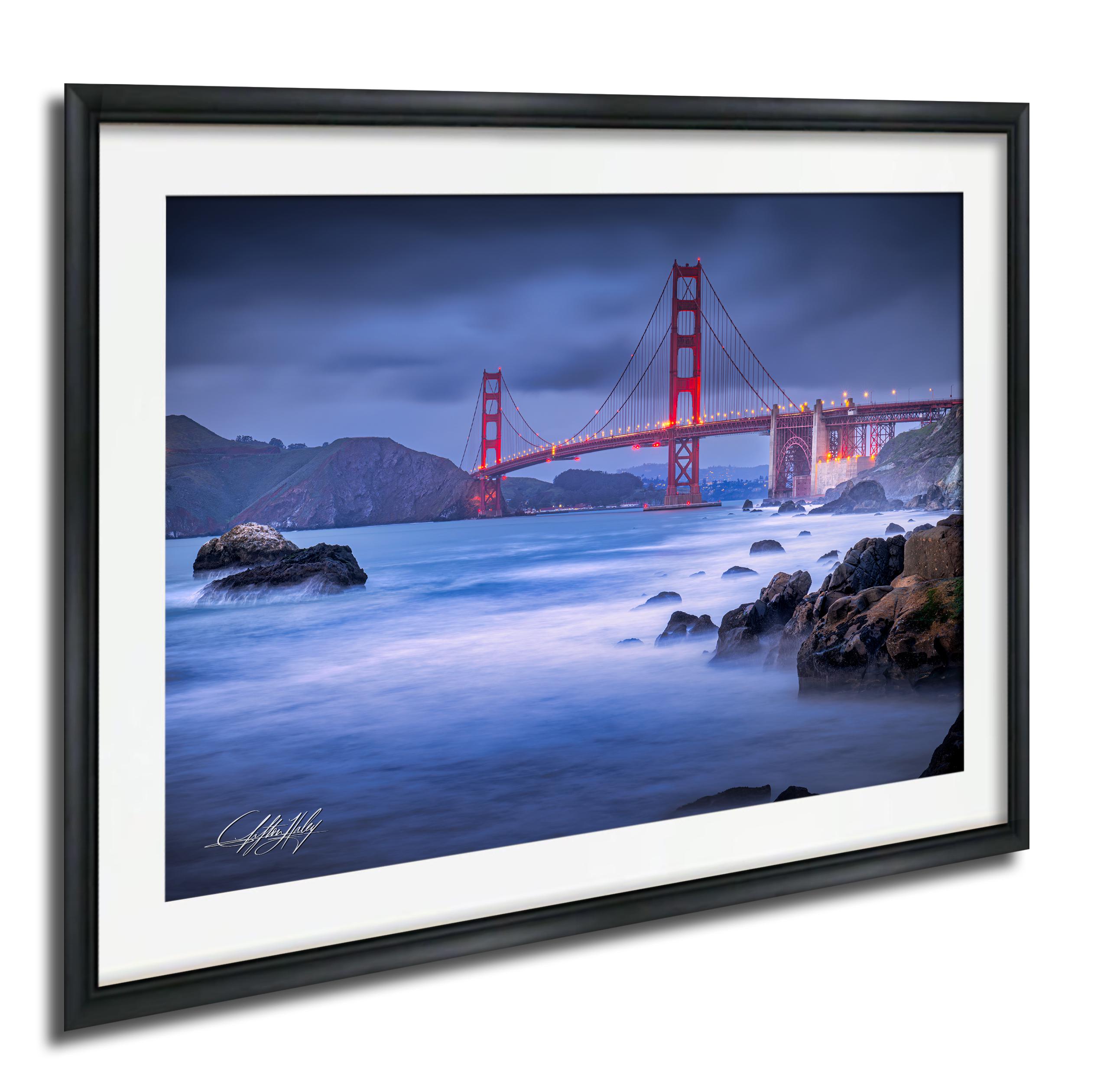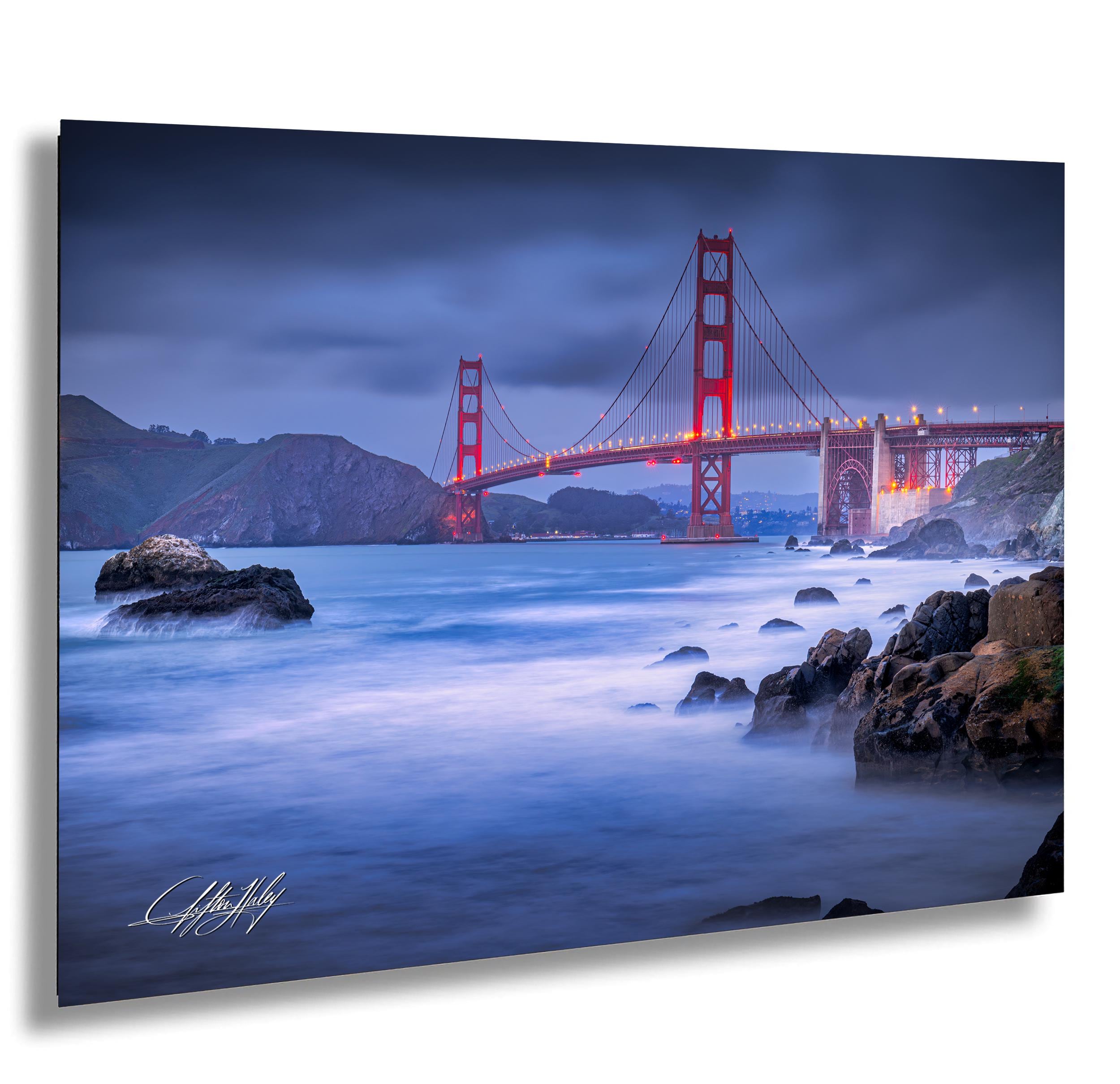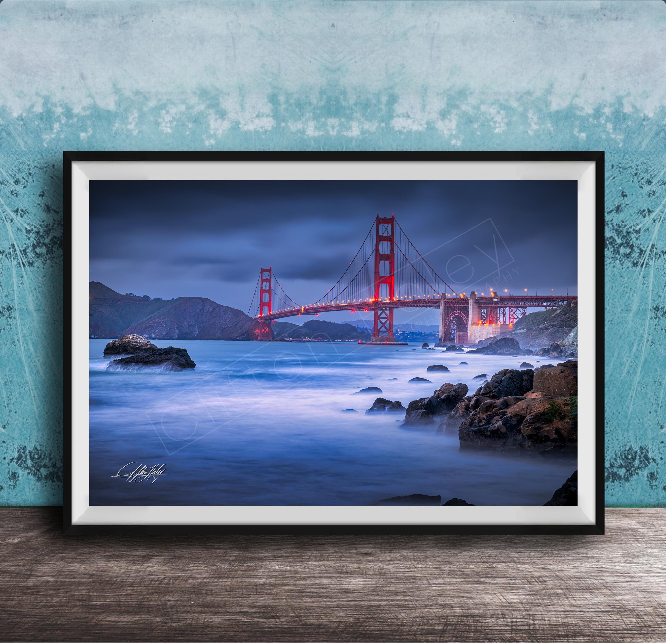 Experience the magic of the Golden Gate Bridge through this San Francisco print, crafted with care to evoke the city's unique spirit. Each vintage travel art piece reflects the tranquil blue hour when the bridge's lights twinkle like distant stars.