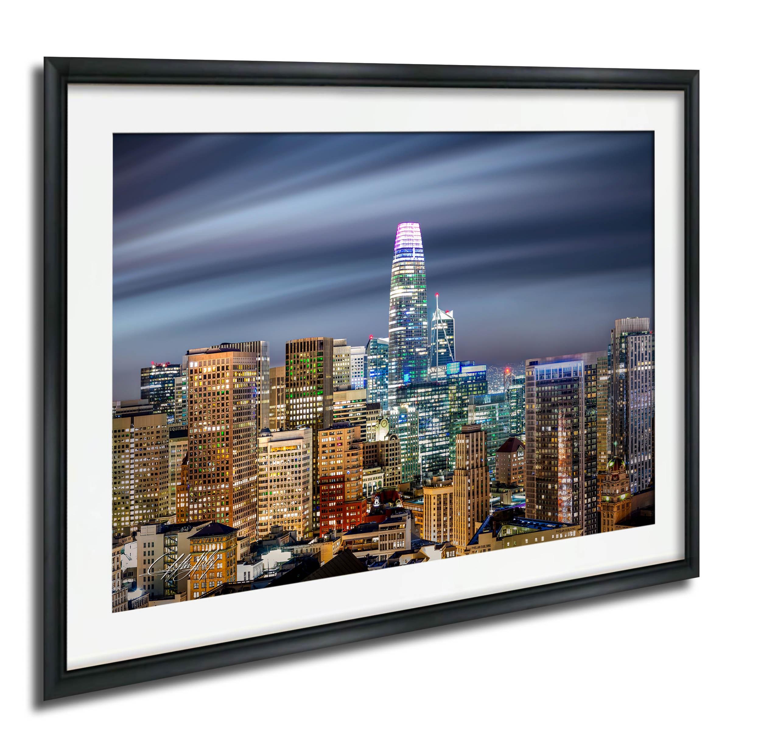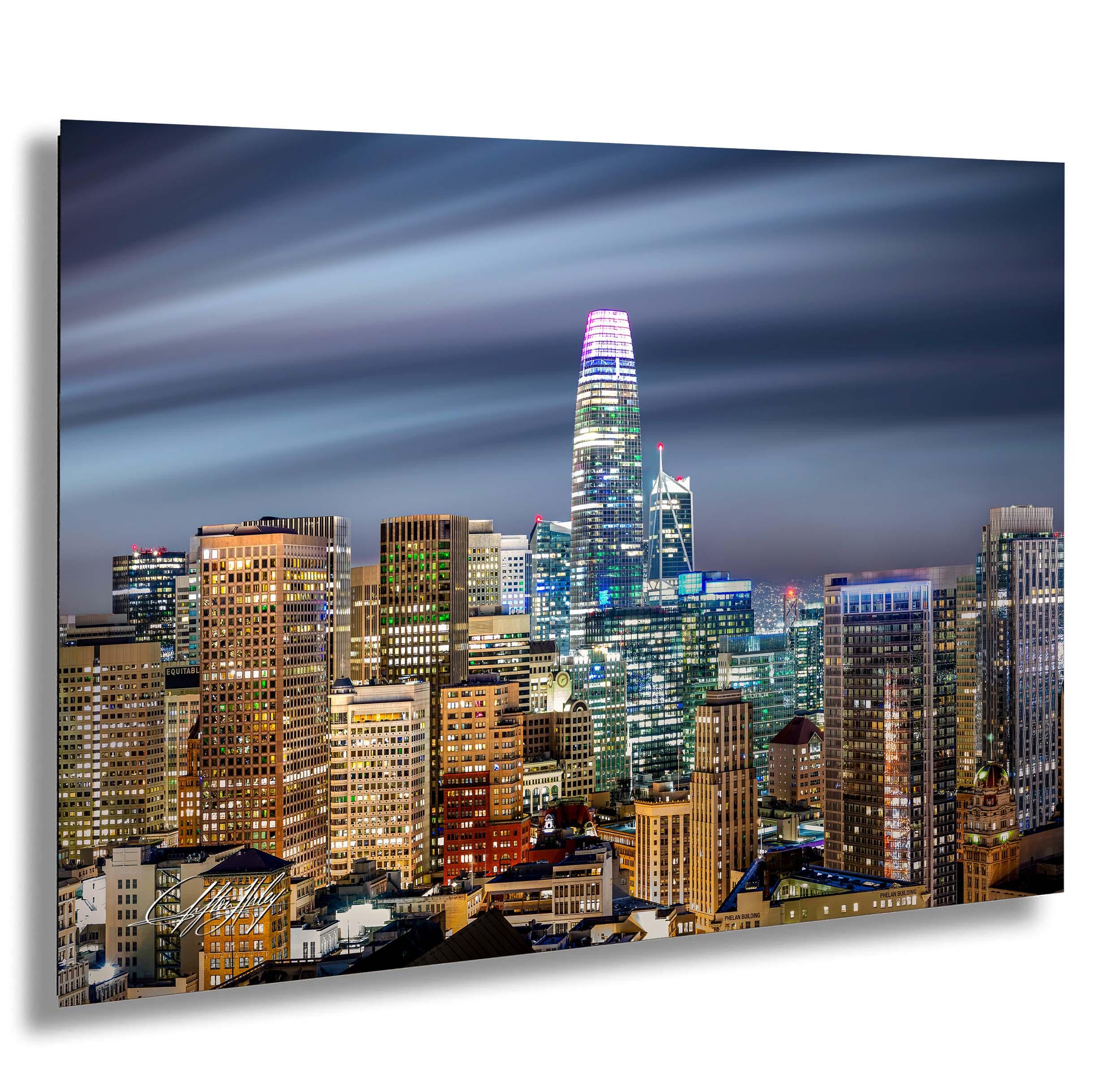 Downtown San Francisco sunset unveils a breathtaking urban cityscape, where the tranquil blue hour meets vibrant city lights. This fine art print captures the peaceful city scene with an artist-signed touch, perfect for lovers of urban landscape art and unique made-to-order wall decor.