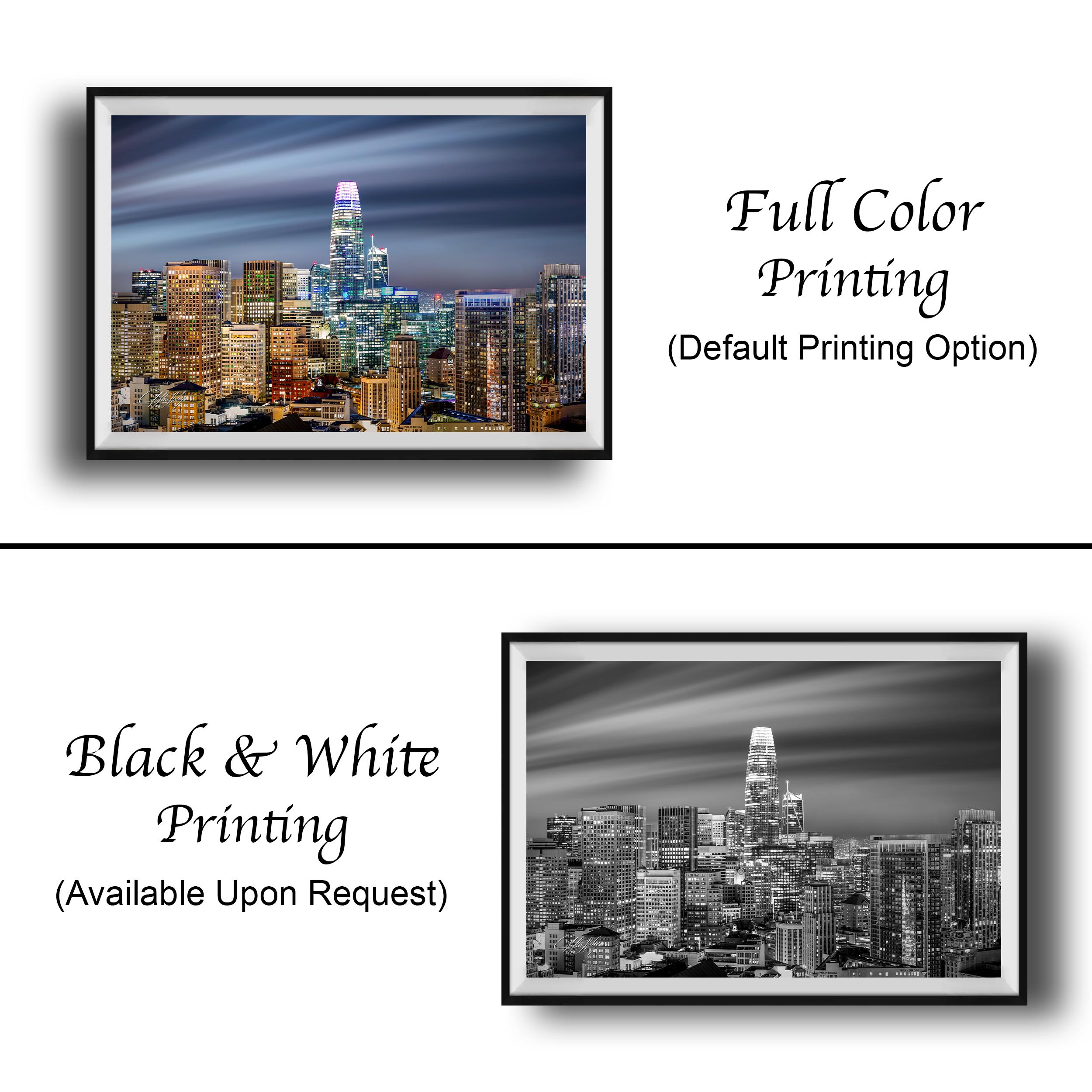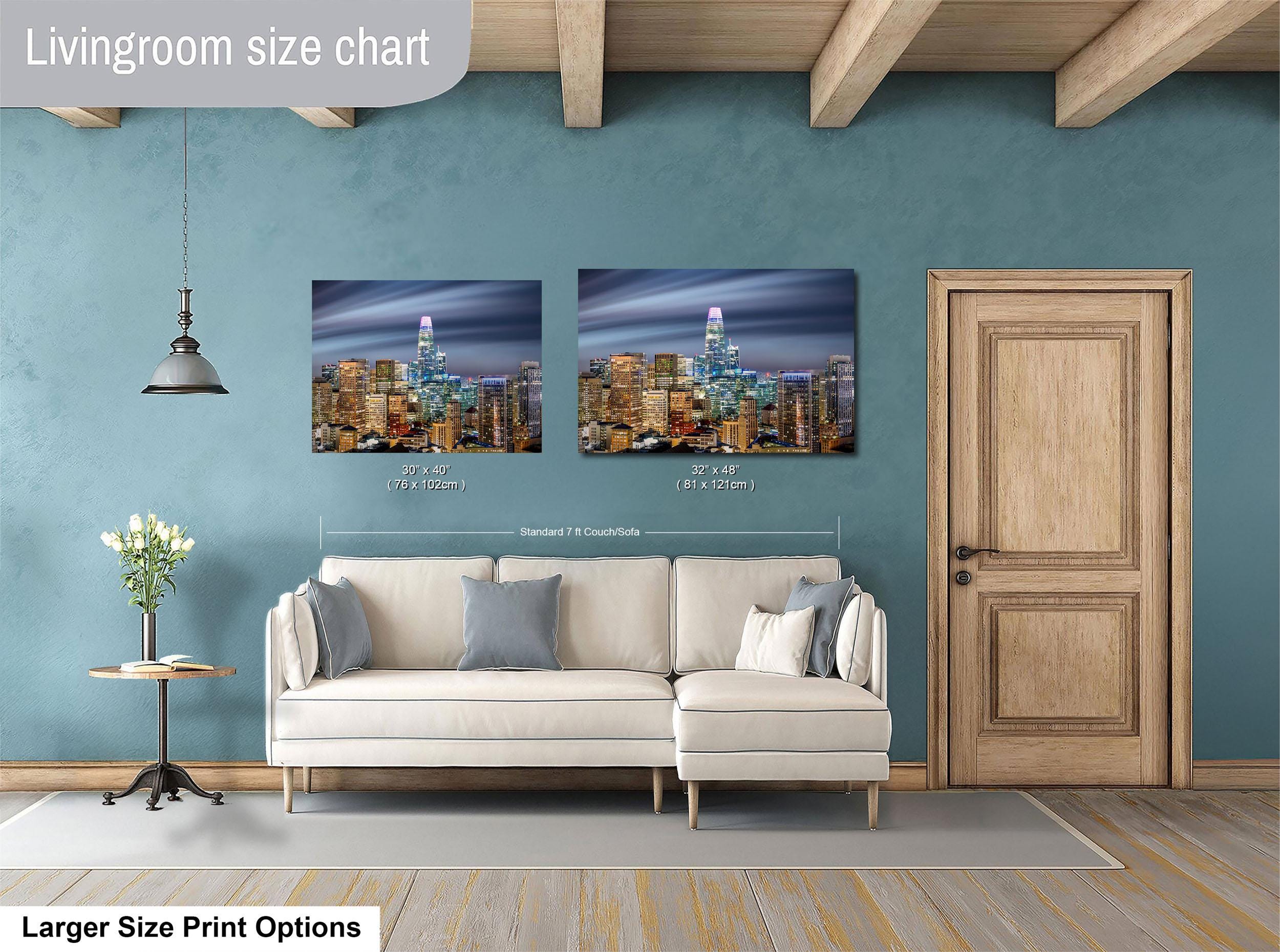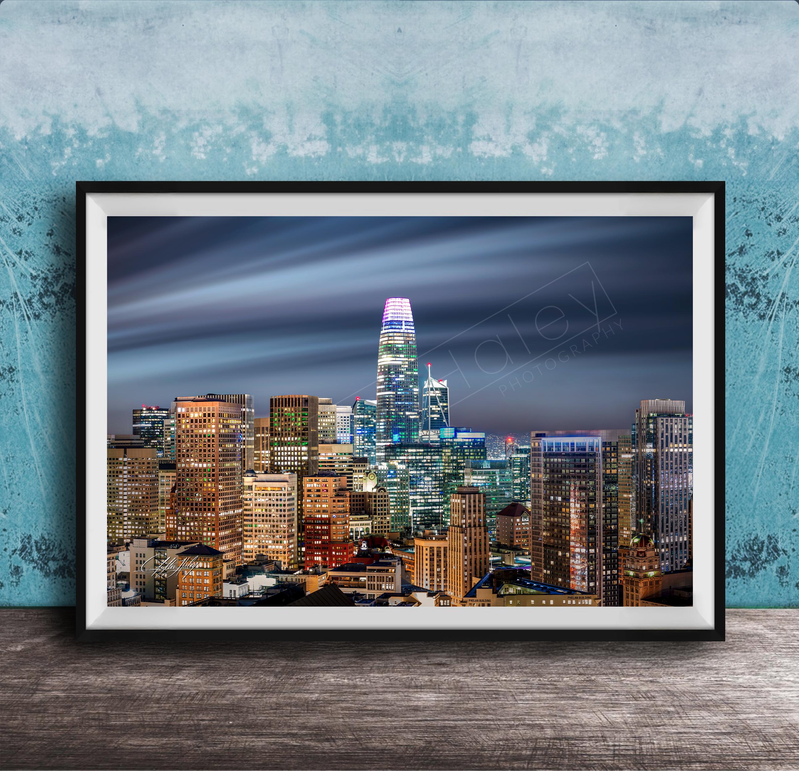 Experience the magic of San Francisco's skyline at dusk with this exclusive fine art photography piece. The image reflects the city's spirit, from the distant clang of cable cars to the aroma of roasted coffee, embodying a serene yet dynamic downtown San Fran atmosphere.