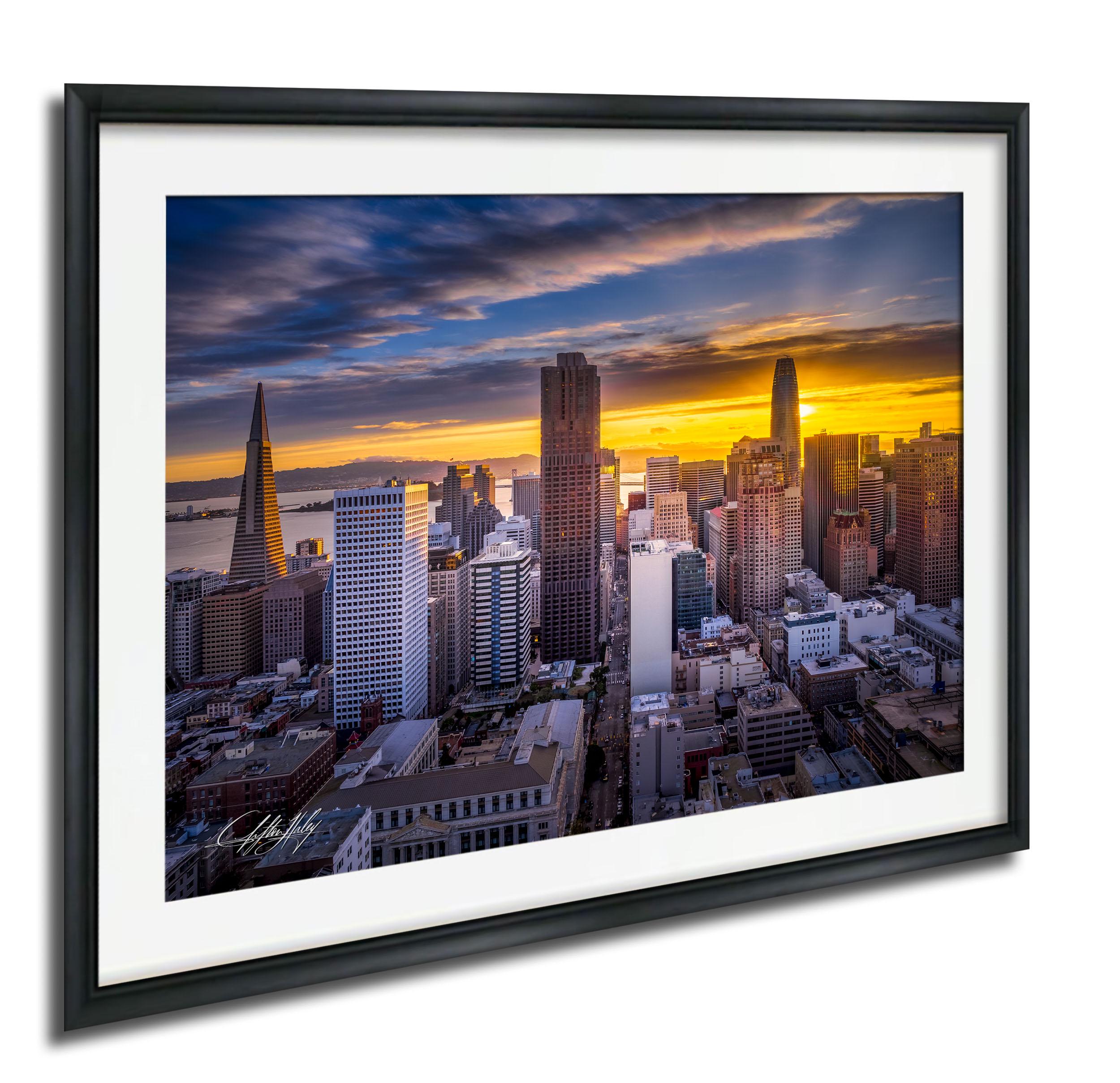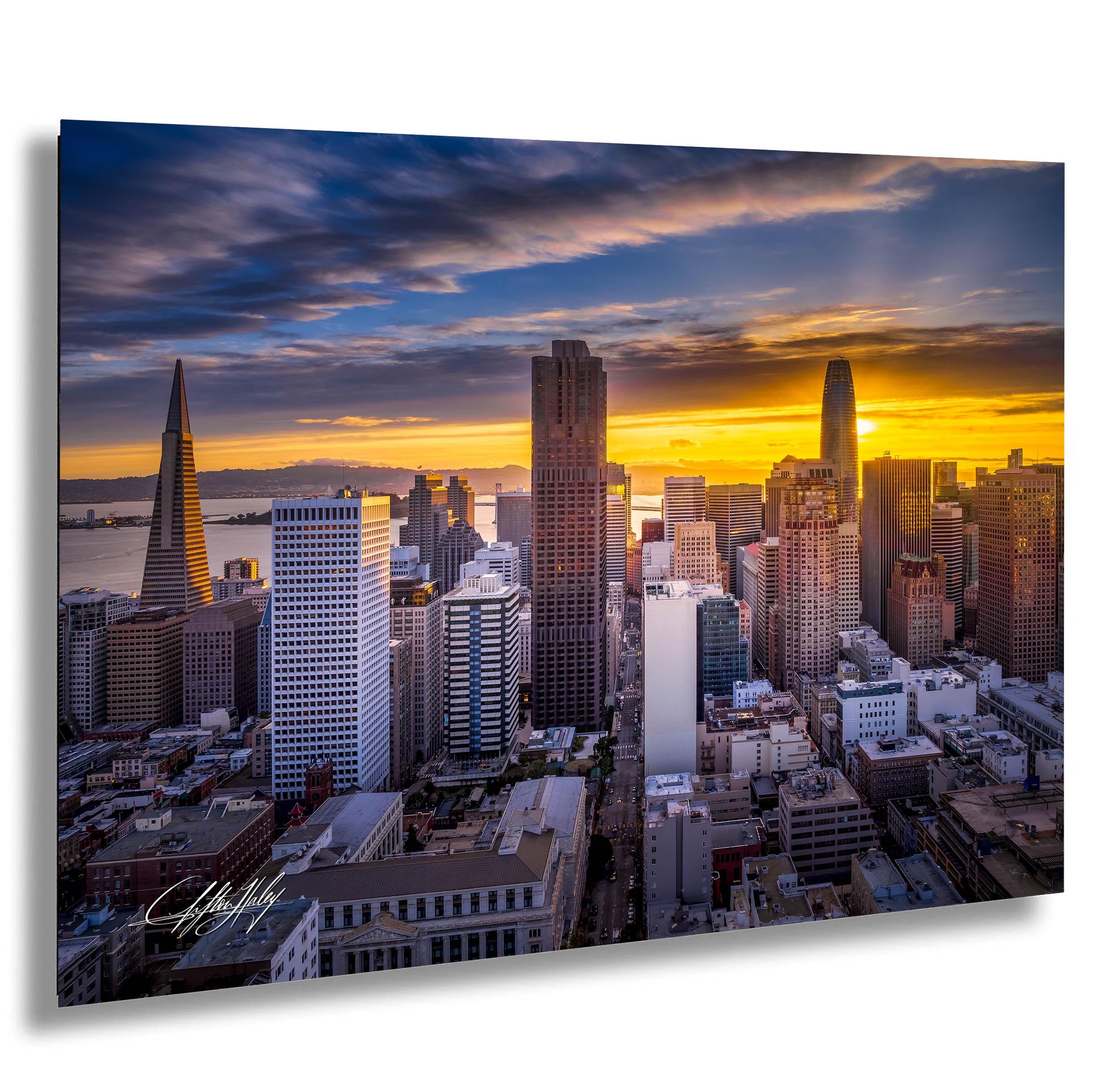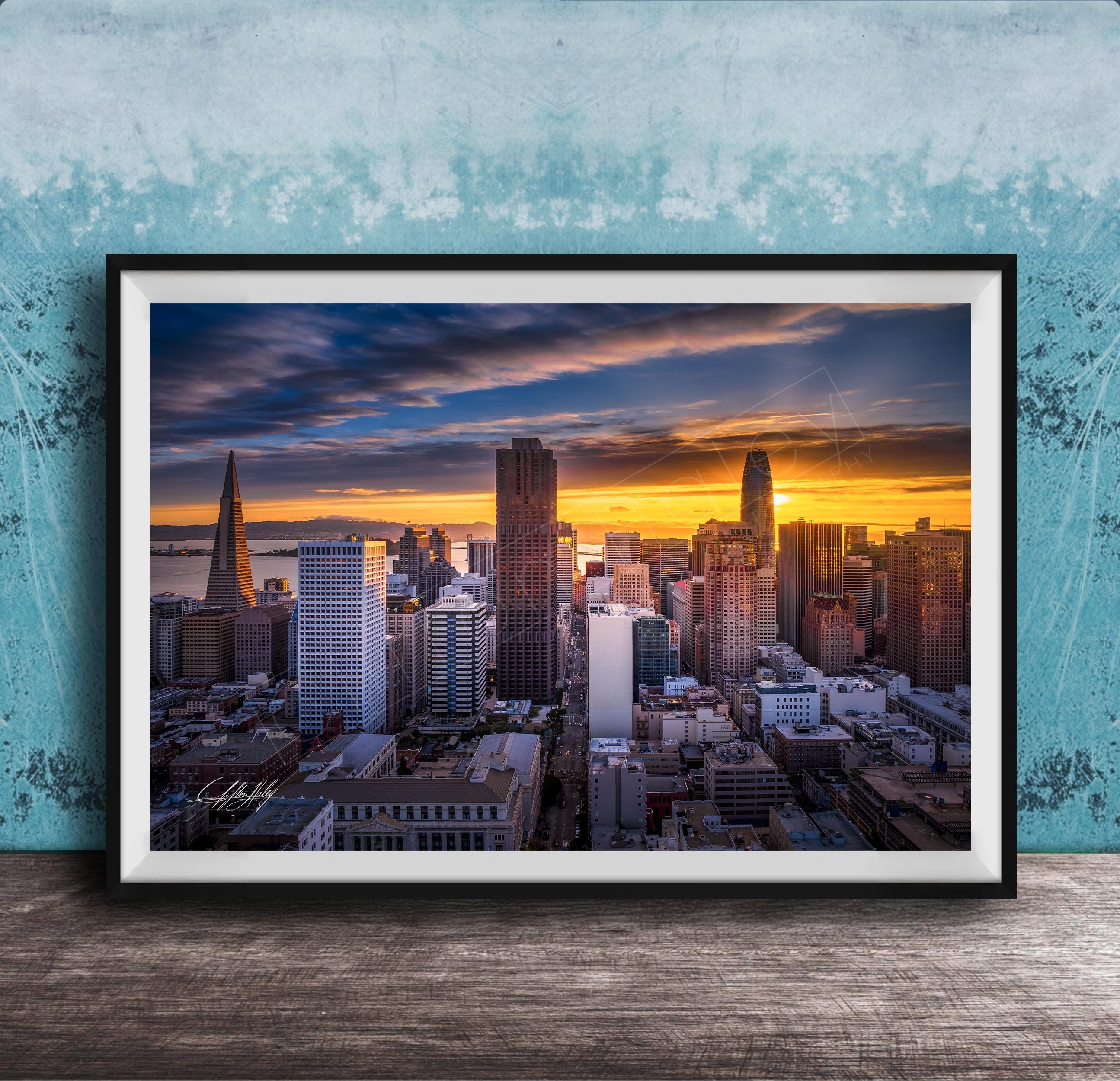 - ✅ Made-to-order fine art print featuring a signature from the artist in the bottom corner for authenticity - ✅ Available as framed paper prints, acrylics, aluminum/metal prints with a 2" white mat border or canvas prints with flush mounted frames - ✅ Dimensions and materials crafted to highlight warm light wall art qualities and preserve image vibrancy - ✅ Captures San Francisco’s iconic skyline with emphasis on golden peace artwork and iron will print themes