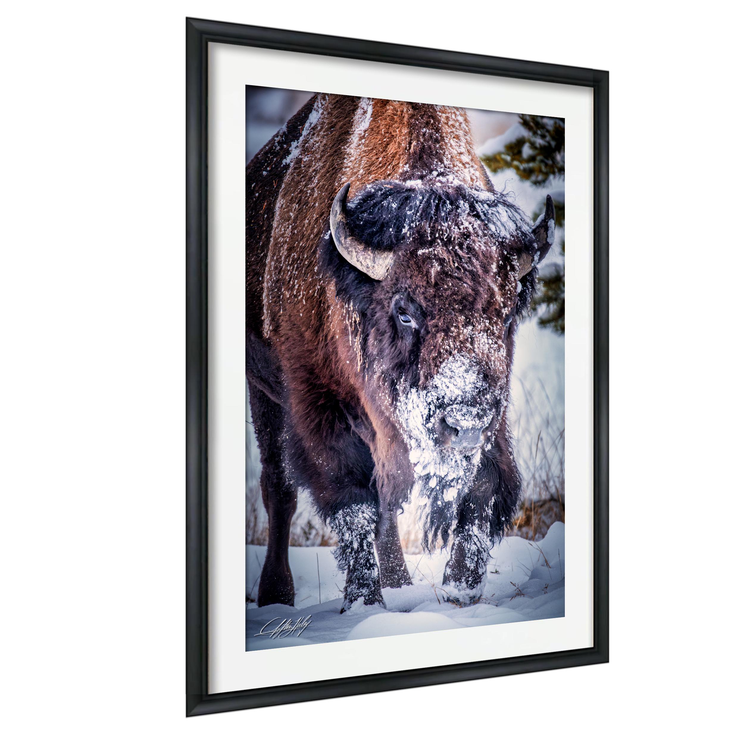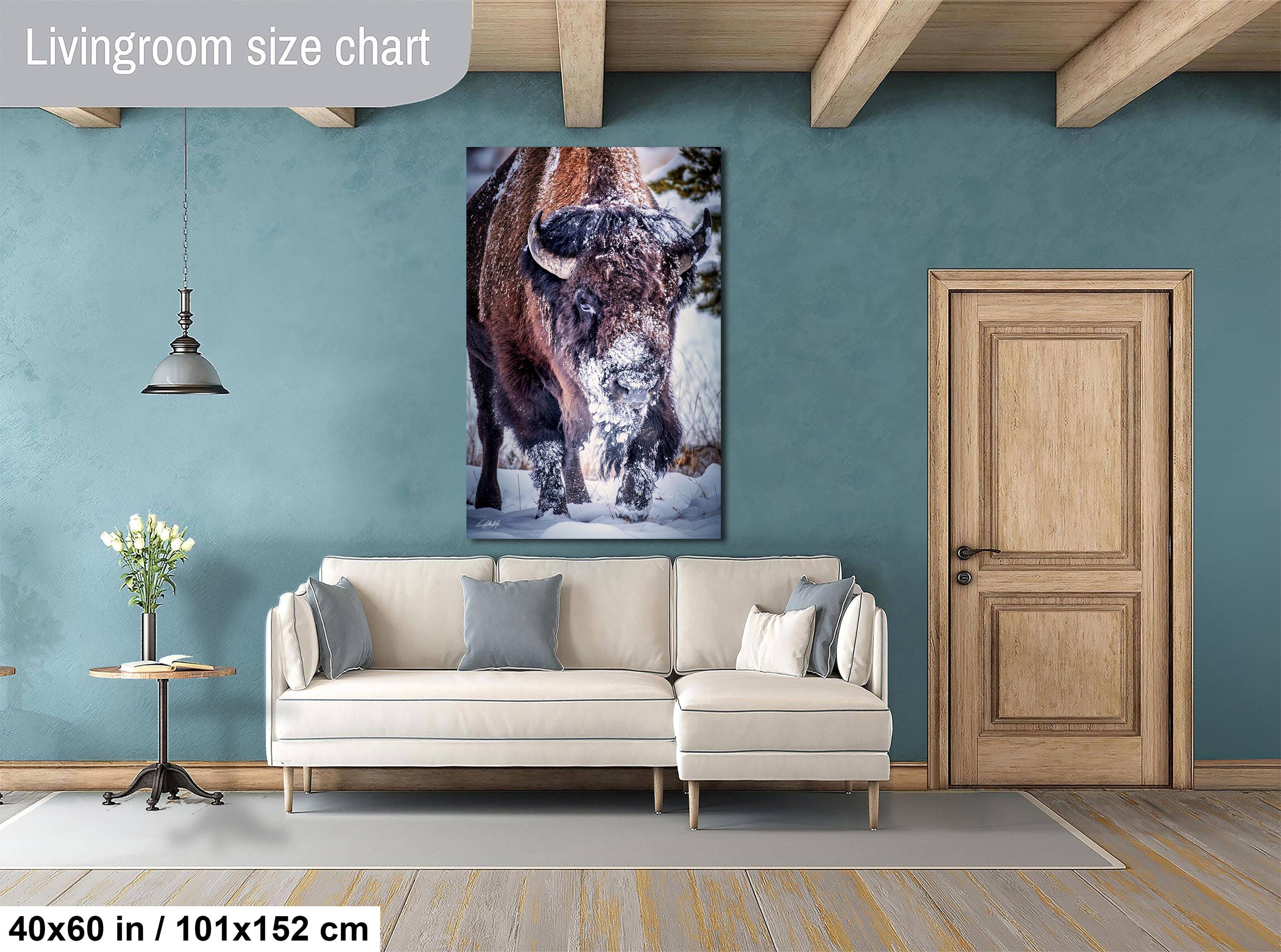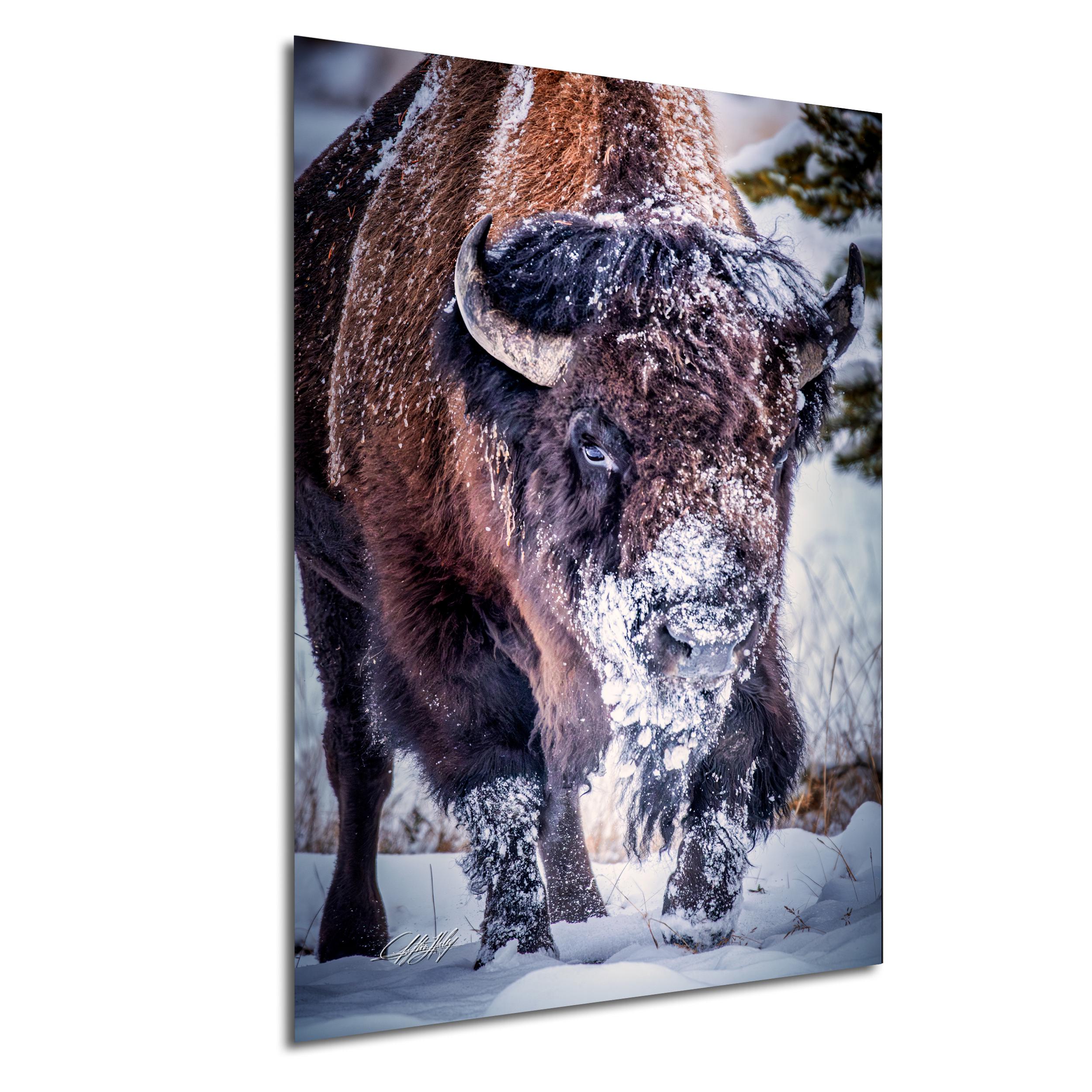 Step into the wintry world of Yellowstone with this large home office accent, where the majestic bison stands resilient against snow-covered plains—captured in earth tone canvas hues that celebrate the enduring American spirit. This unique nature gift is hand signed by the artist, adding authenticity and a personal touch to your decor.