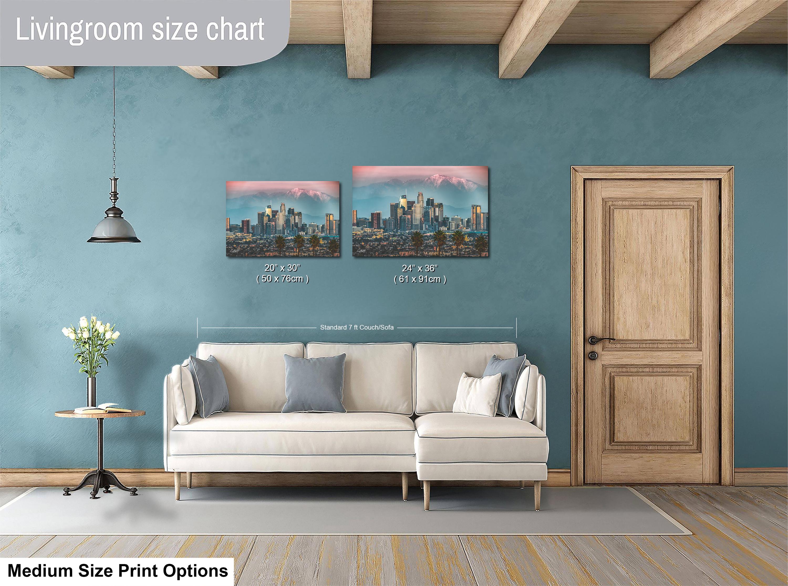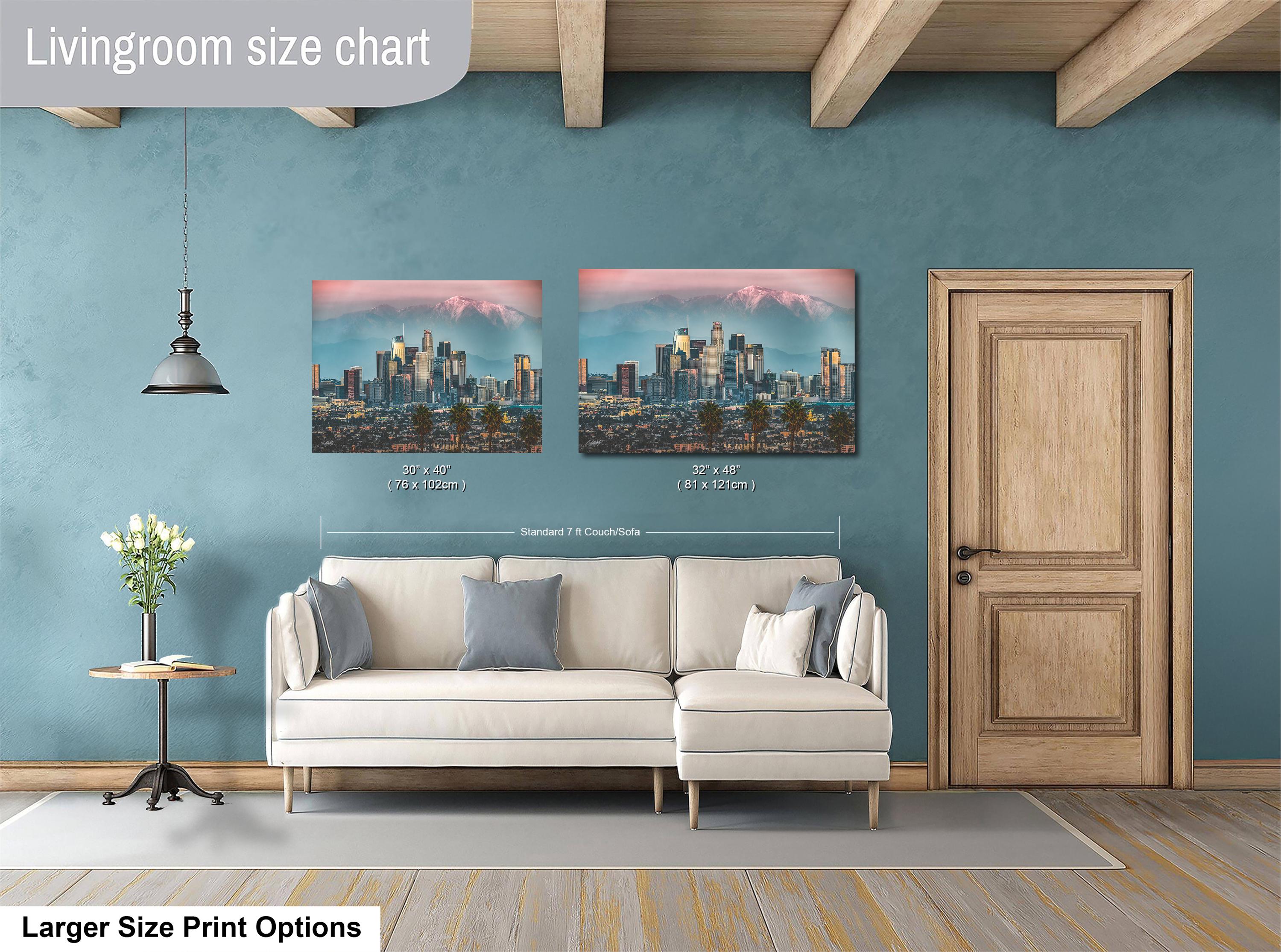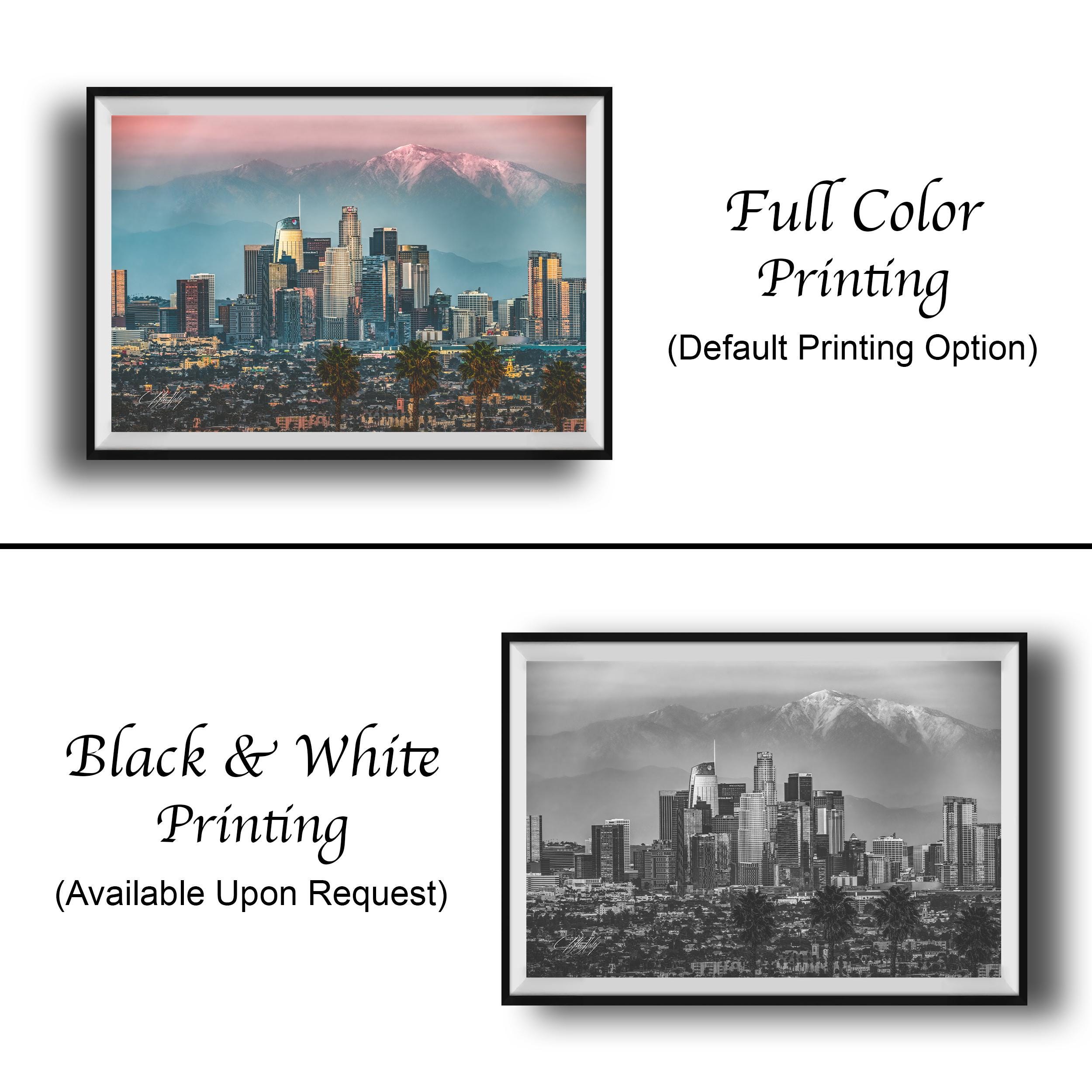 • Dimensions and customization options available upon request • No returns due to custom creation, but exchanges or replacements are offered for damaged items • Perfect as cityscape wall art or an urban sunset print for any California landscape enthusiast