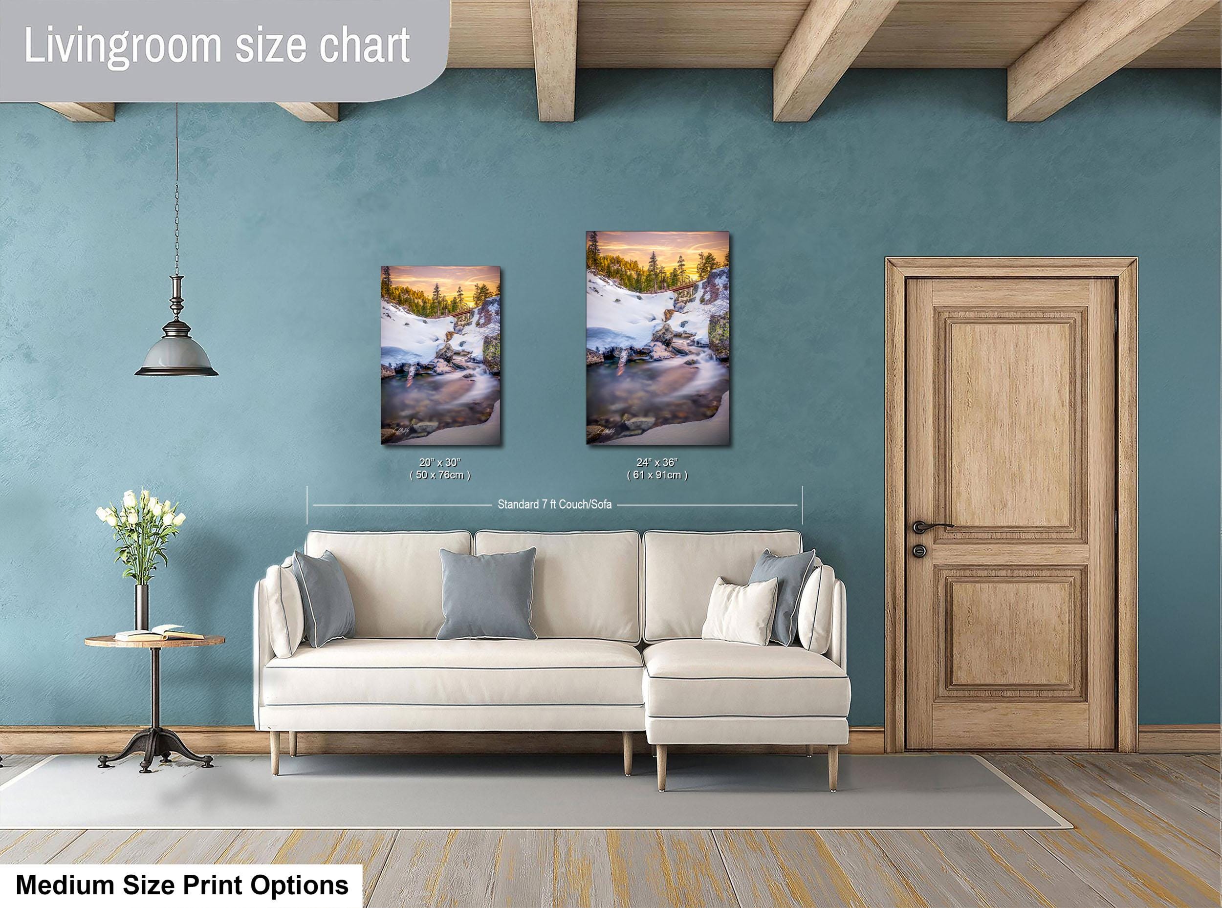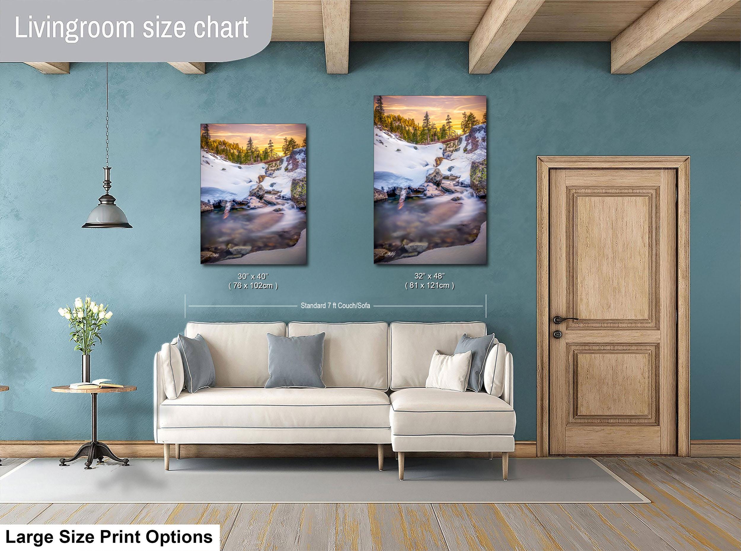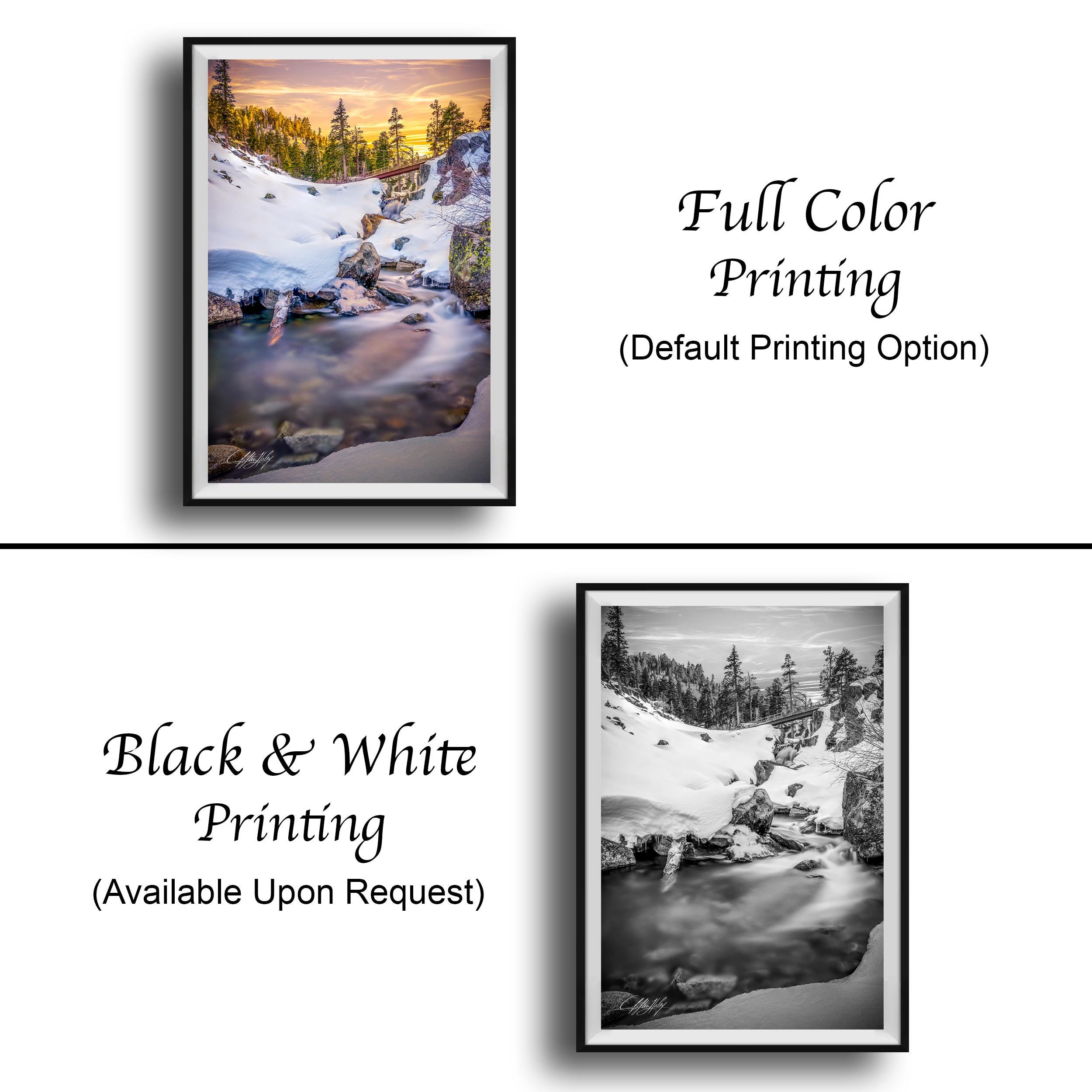 Eagle Falls Lake Tahoe print captures the serene beauty of a cascading waterfall framed by towering pine forests and majestic mountain scenery. This fine art photography piece brings the calming essence of nature's quiet glory into your home, perfect for enhancing any modern nature wall or outdoor wall decor.