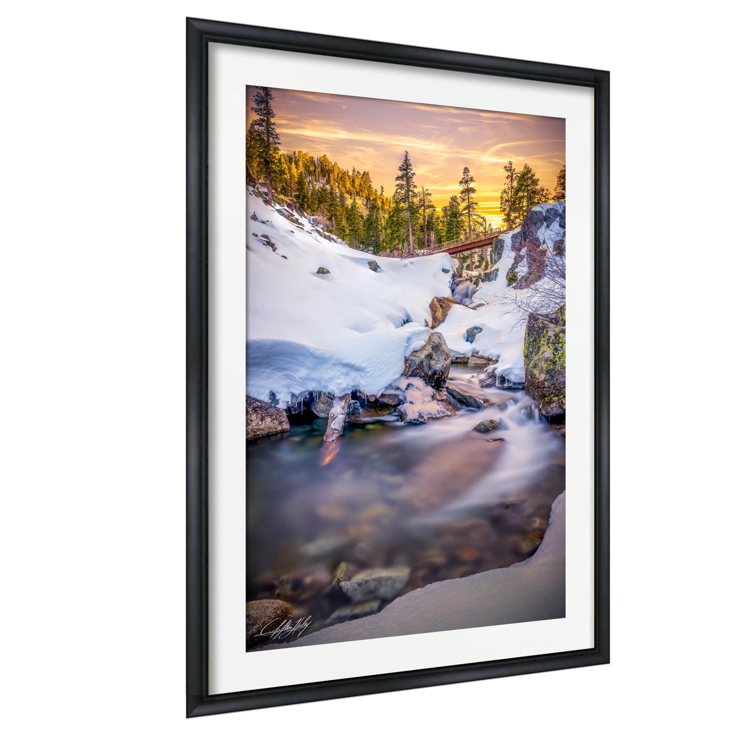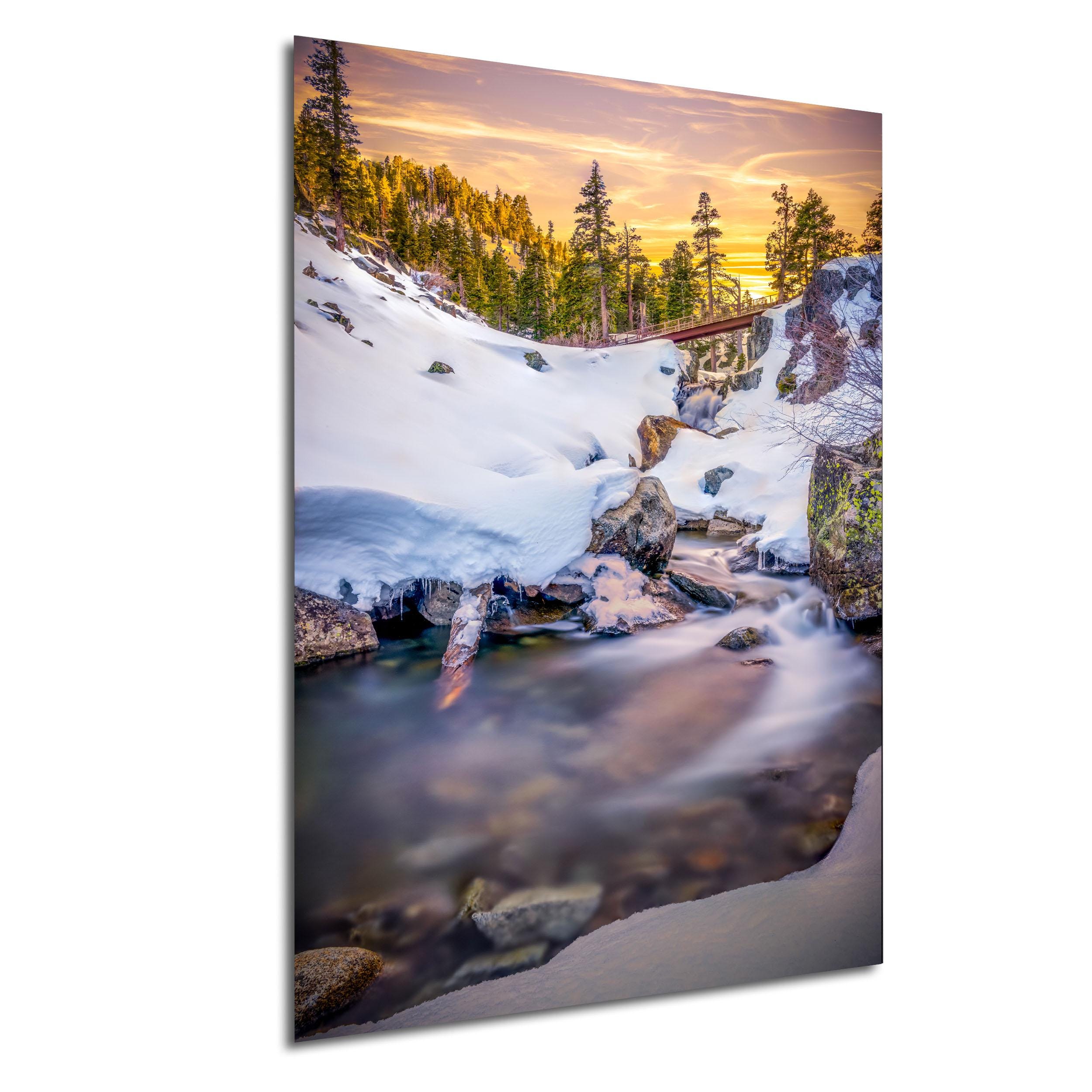 Experience the tranquil winter waterfall art of Eagle Falls, where slow shutter photography reveals the fluid motion of a sunset cascade. The image evokes the crisp, pine-scented air and peaceful ambiance of Tahoe's Emerald Bay, often called the "Jewel of the Sierra."