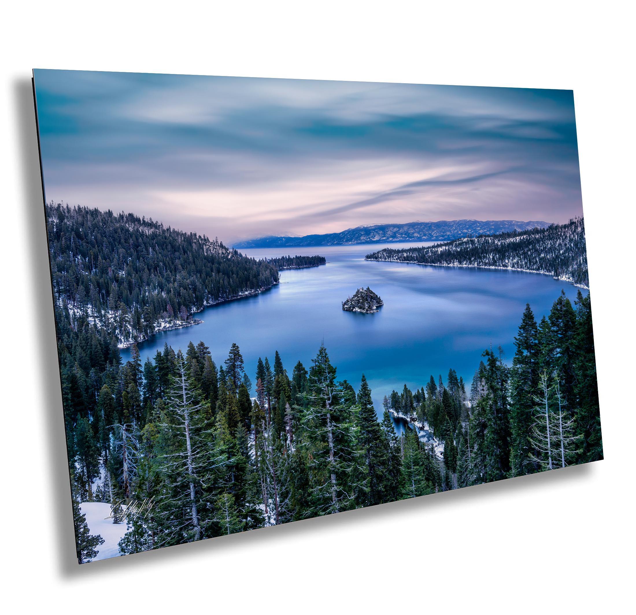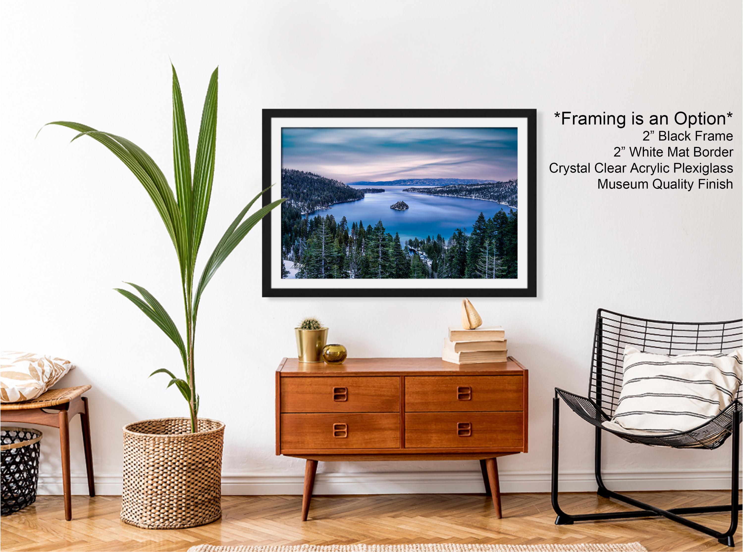 Bring the majestic calm of Emerald Bay and its surrounding mountain panorama into your space with this unique, evocative print.