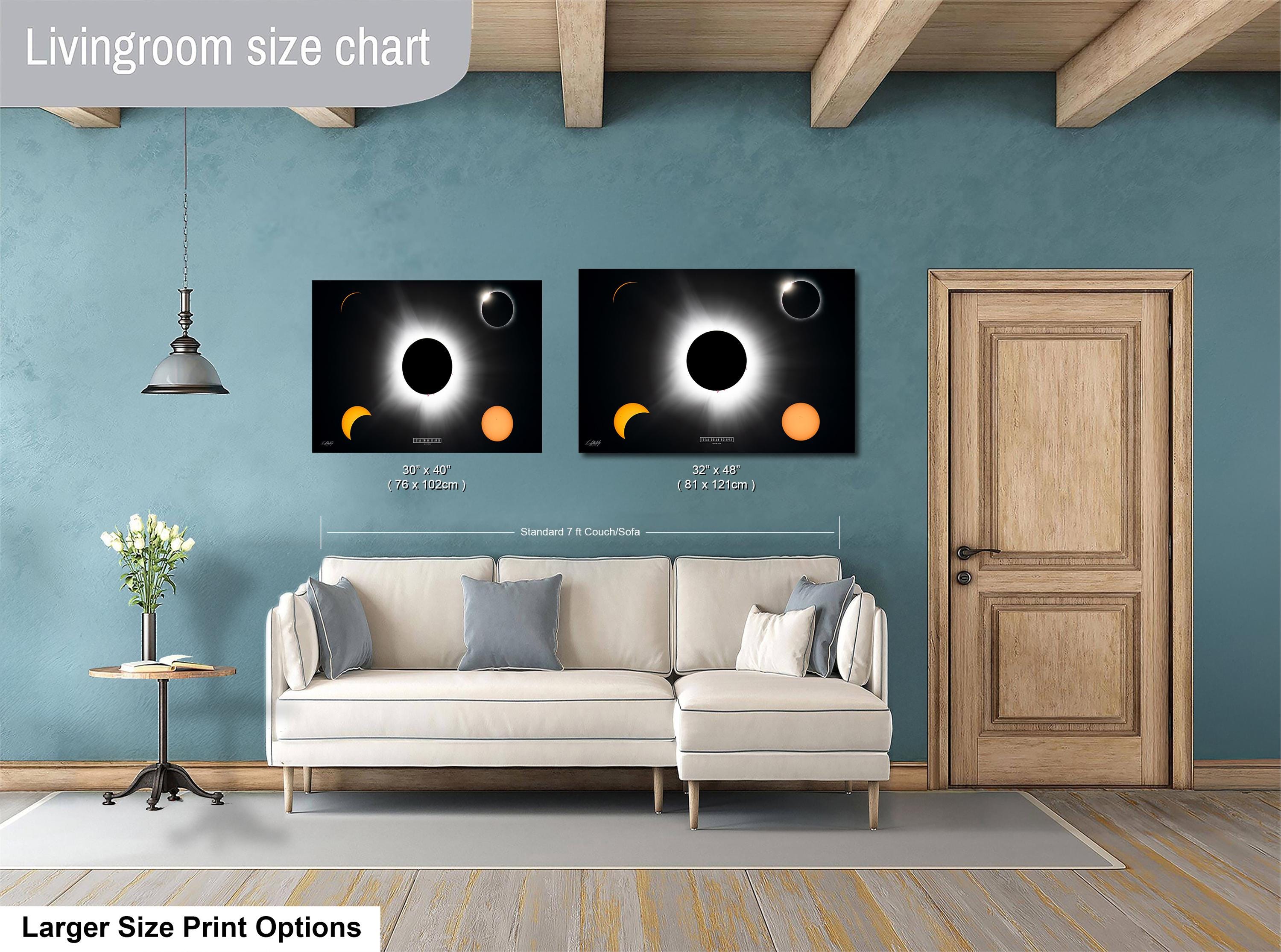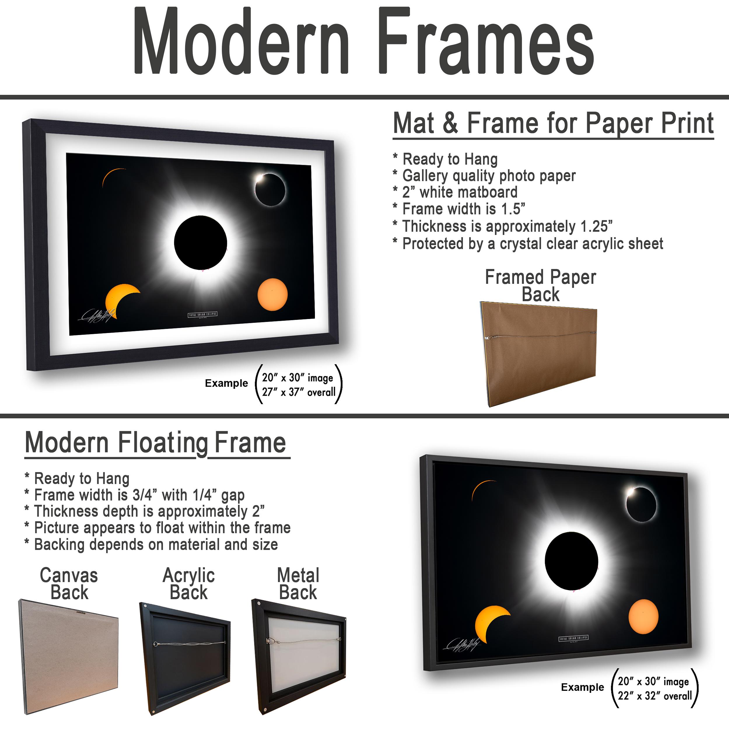 • Made to order fine art print, each piece uniquely crafted with the artist’s signature for authenticity and a personal touch. • Available in multiple formats including framed paper prints with a 2" white mat border, acrylics, aluminum/metal prints, or flush-mounted canvas prints without a mat border. • Dimensions and customization options available upon request to perfectly fit your space. • Ideal gift for astronomy fans, students, educators, or anyone fascinated by solar eclipses and space art.