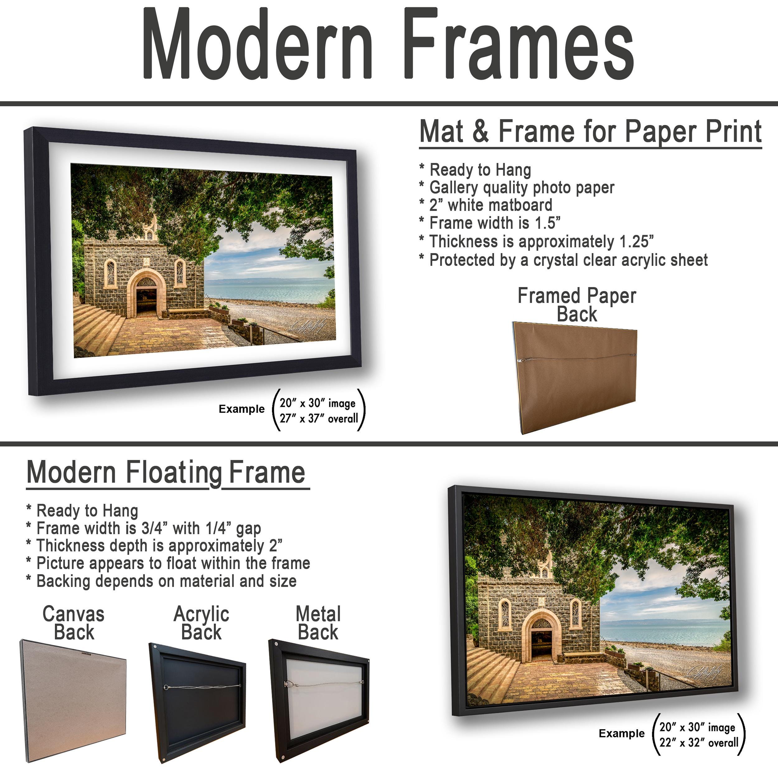 3.1) Only framed paper prints, acrylics and aluminum/metal prints will have a 2" white mat border. 3.2) Canvas prints will be a flush mounted (no mat border) to the frame.