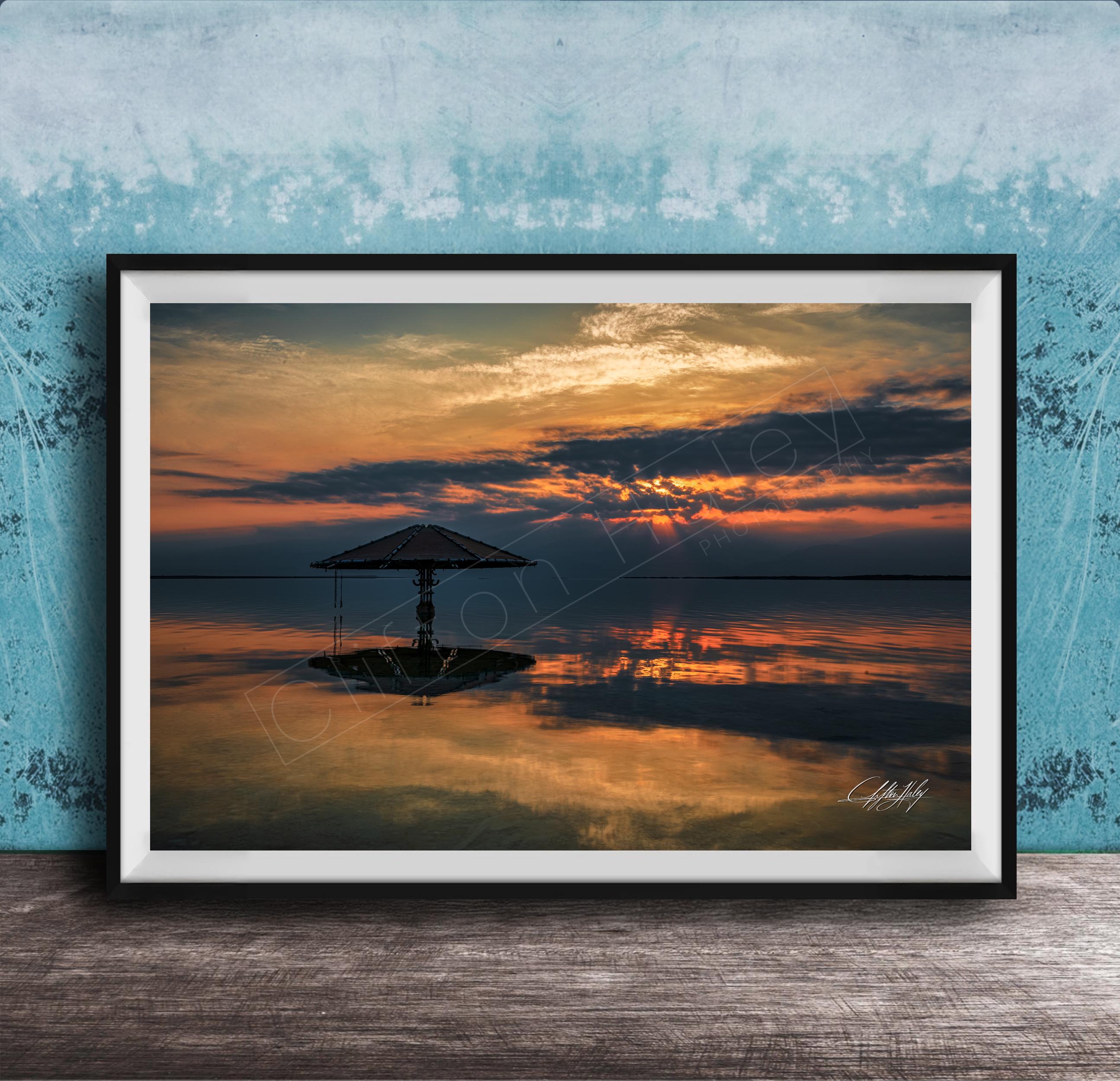 Experience the unique charm of this fine art wall decor, featuring a stunning landscape photo gift from the Middle East. The Dead Sea’s calm waters mirror the vibrant sky in this serene nature scene, making it an ideal piece for lovers of Israel nature art and golden hour artwork.