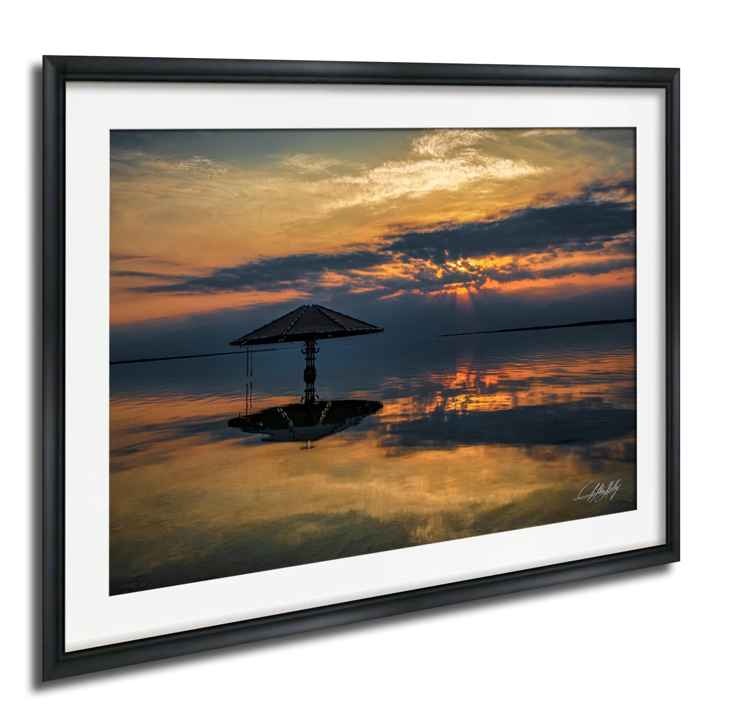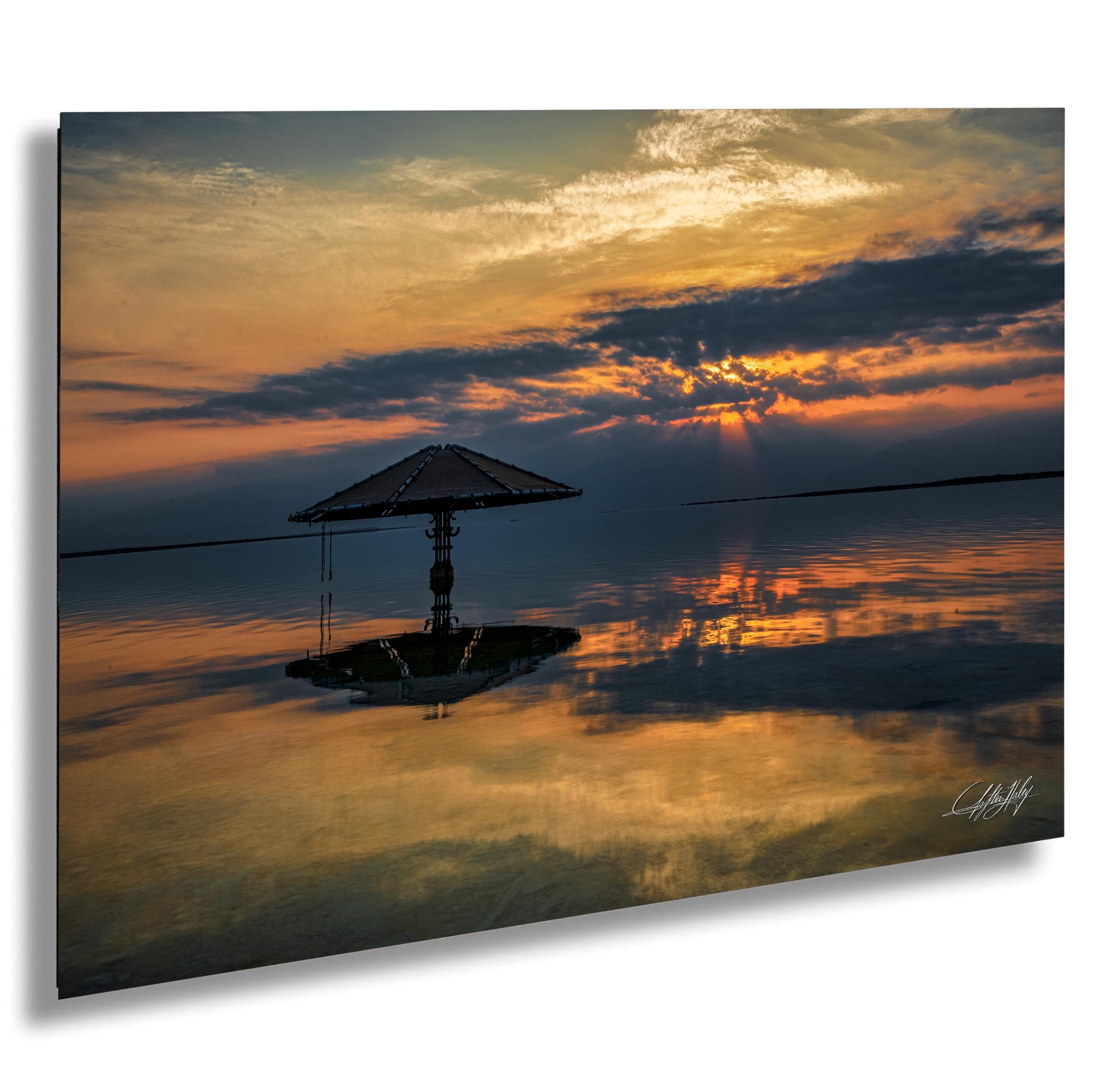 Dead Sea Sunrise metal prints capture the breathtaking beauty of Israel's serene golden hour, bringing the calm waters and amber skies of the Holy Land into your home. This artist signed wall decor reflects a peaceful nature scene that transforms any space with warm, tranquil energy.