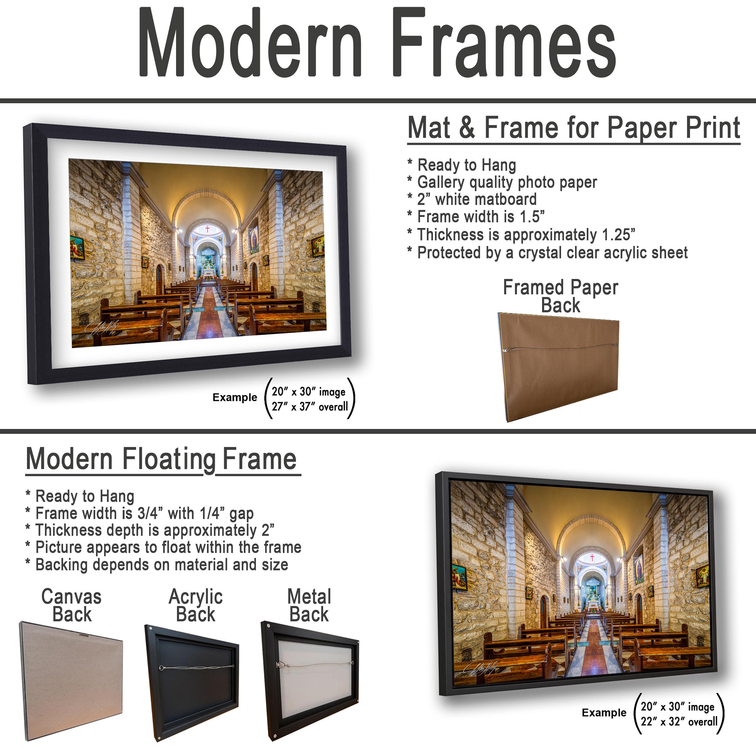 3.1) Only framed paper prints, acrylics and aluminum/metal prints will have a 2" white mat border. 3.2) Canvas prints will be a flush mounted (no mat border) to the frame.
