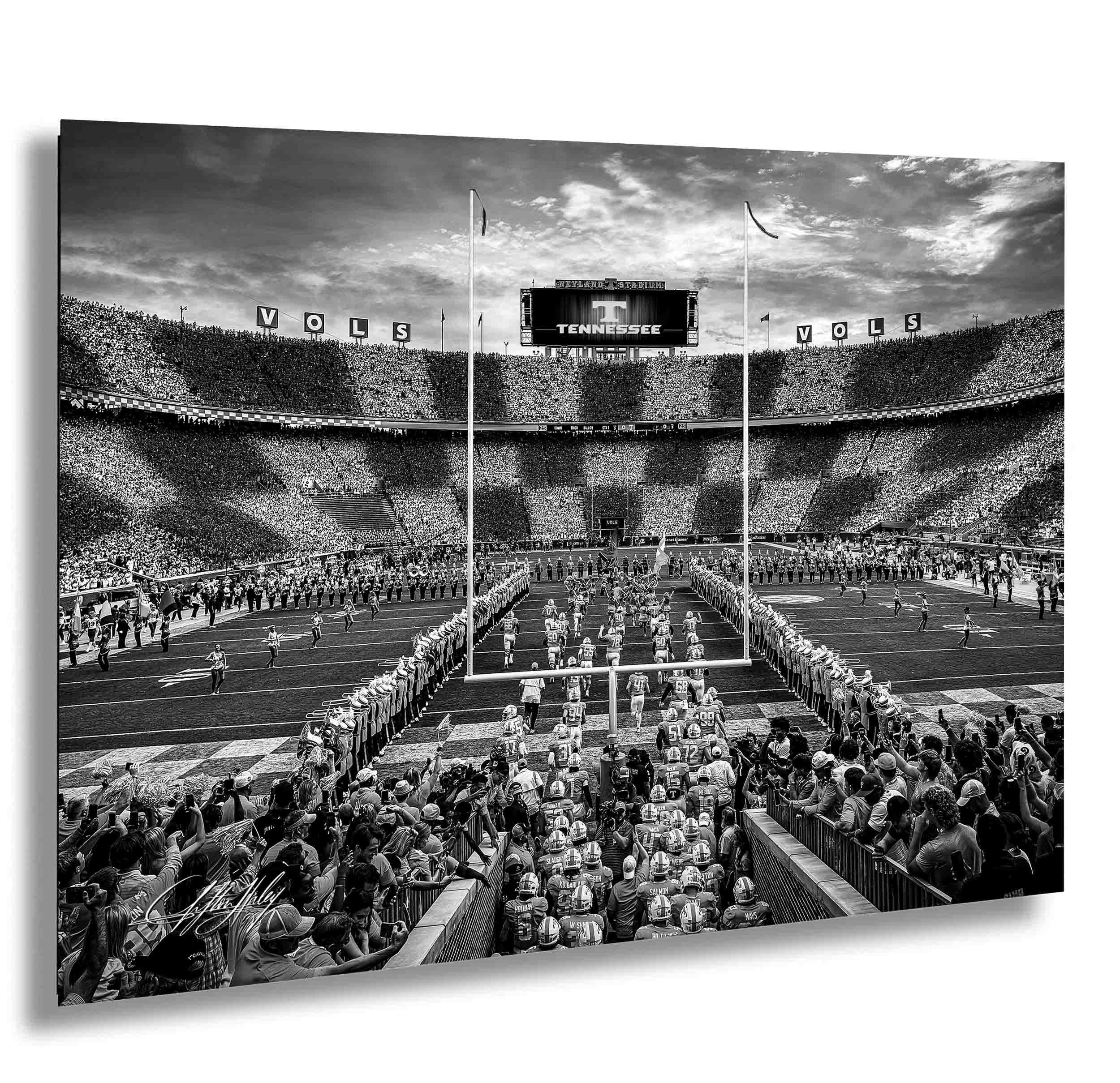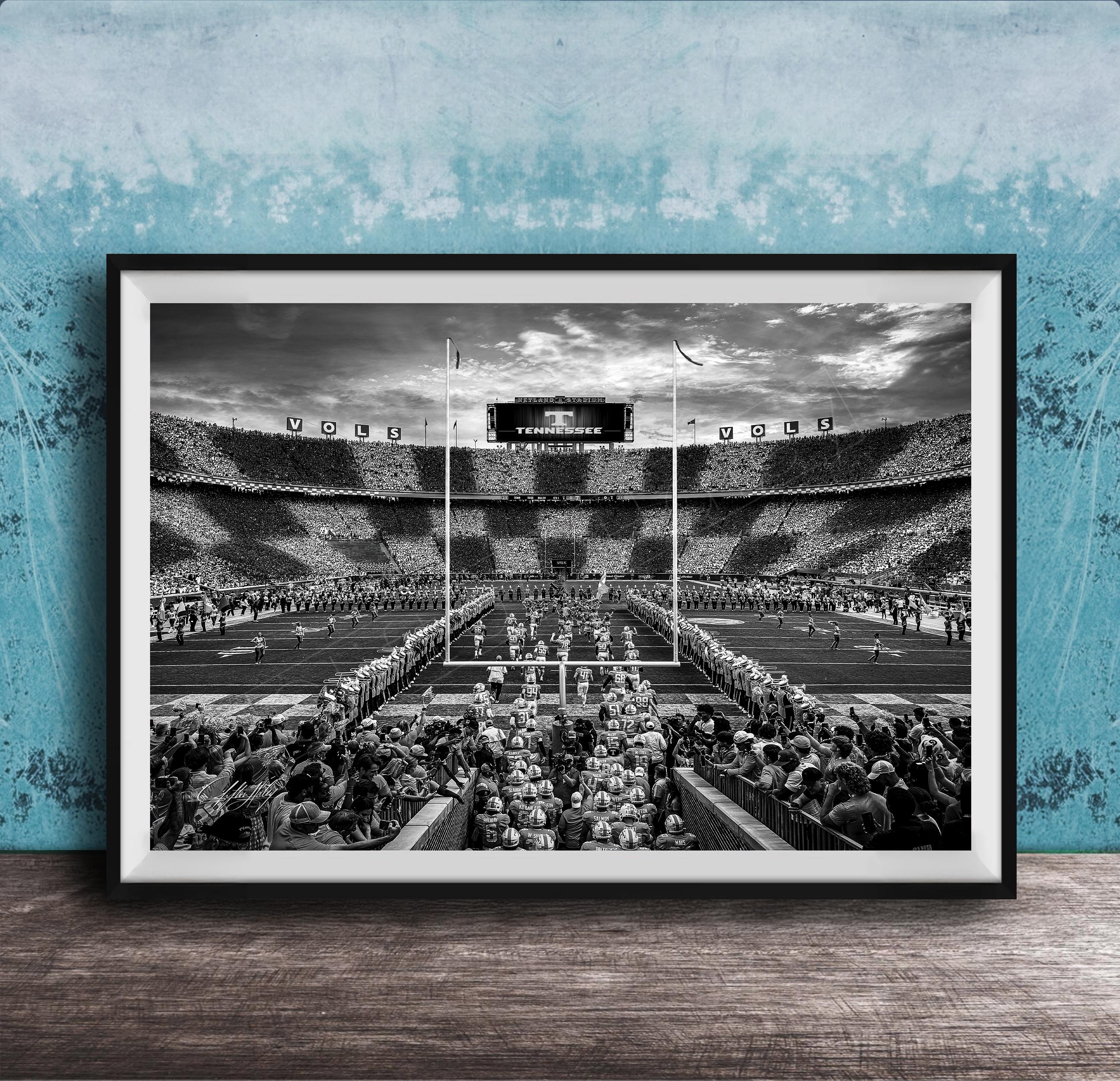 • Authentic stadium photography showcasing Neyland Stadium’s checkerboard end zones