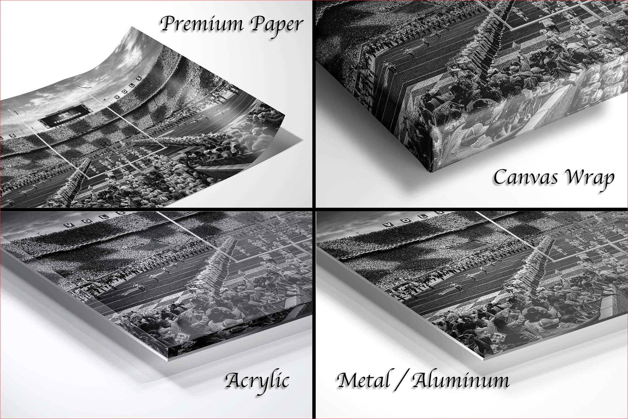 • Dimensions and materials vary by product type; choose from framed paper prints, acrylics, aluminum/metal prints with a 2" white mat border, or flush-mounted canvas prints