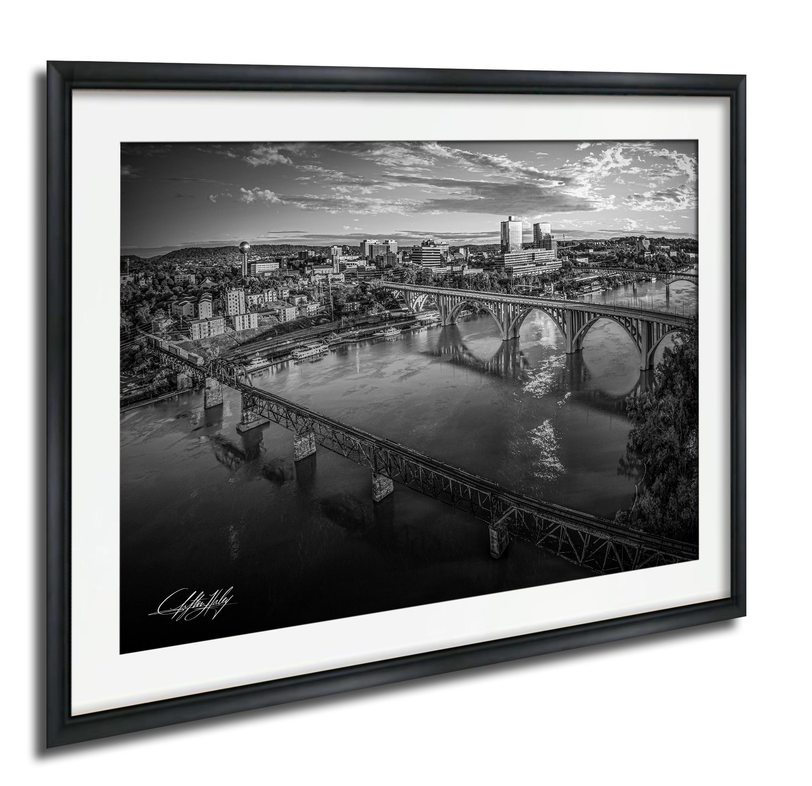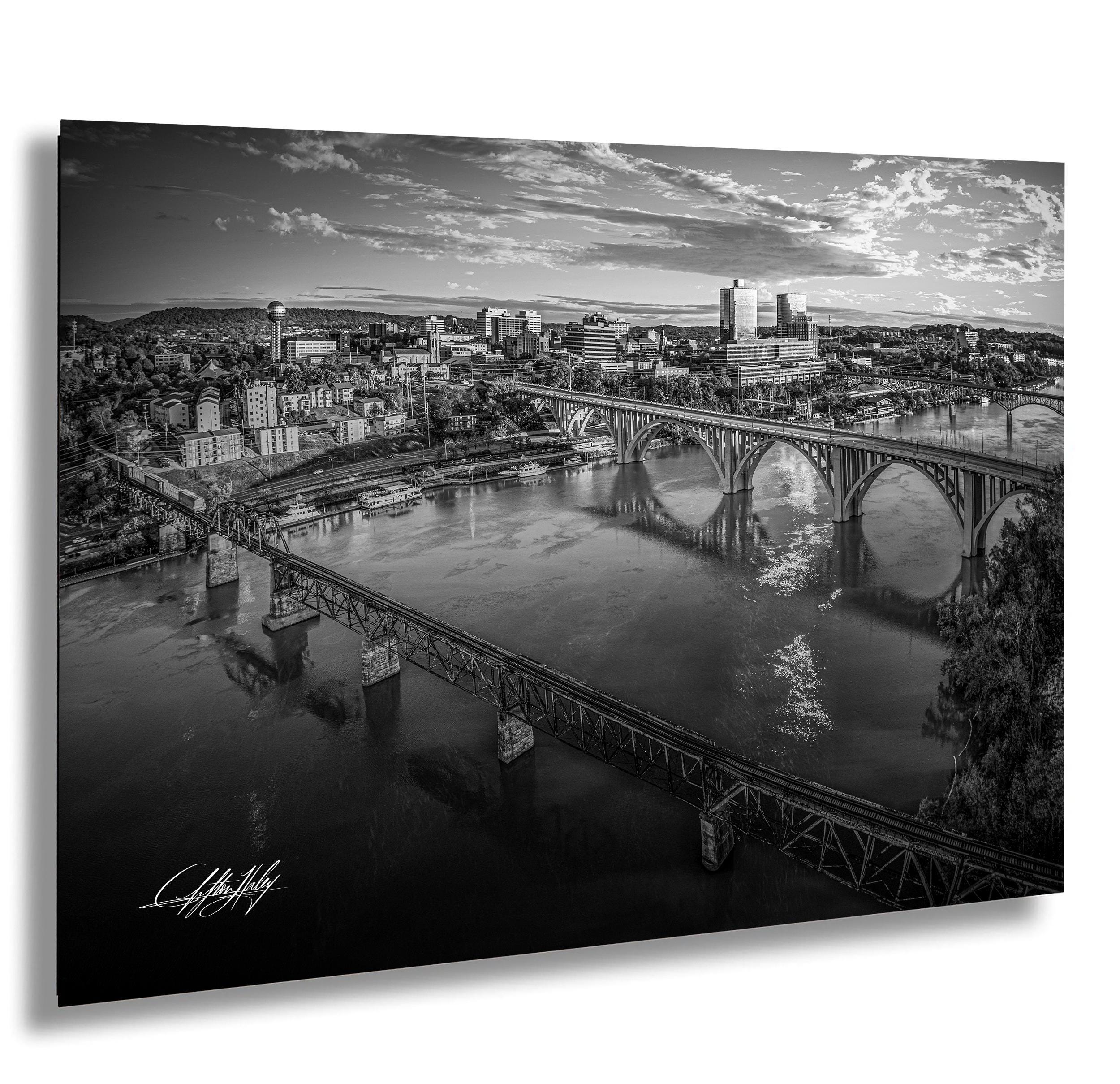 As the autumn sun rises over Knoxville, this fine art print brings to life the crisp air, golden leaves, and the tranquil beauty of the river at sunrise. Each bridge in this travel landscape has a unique story — from the ornate Victorian Norfolk Bridge to the sleek lines of the Gay Street Bridge — immortalized in a striking black and white print.