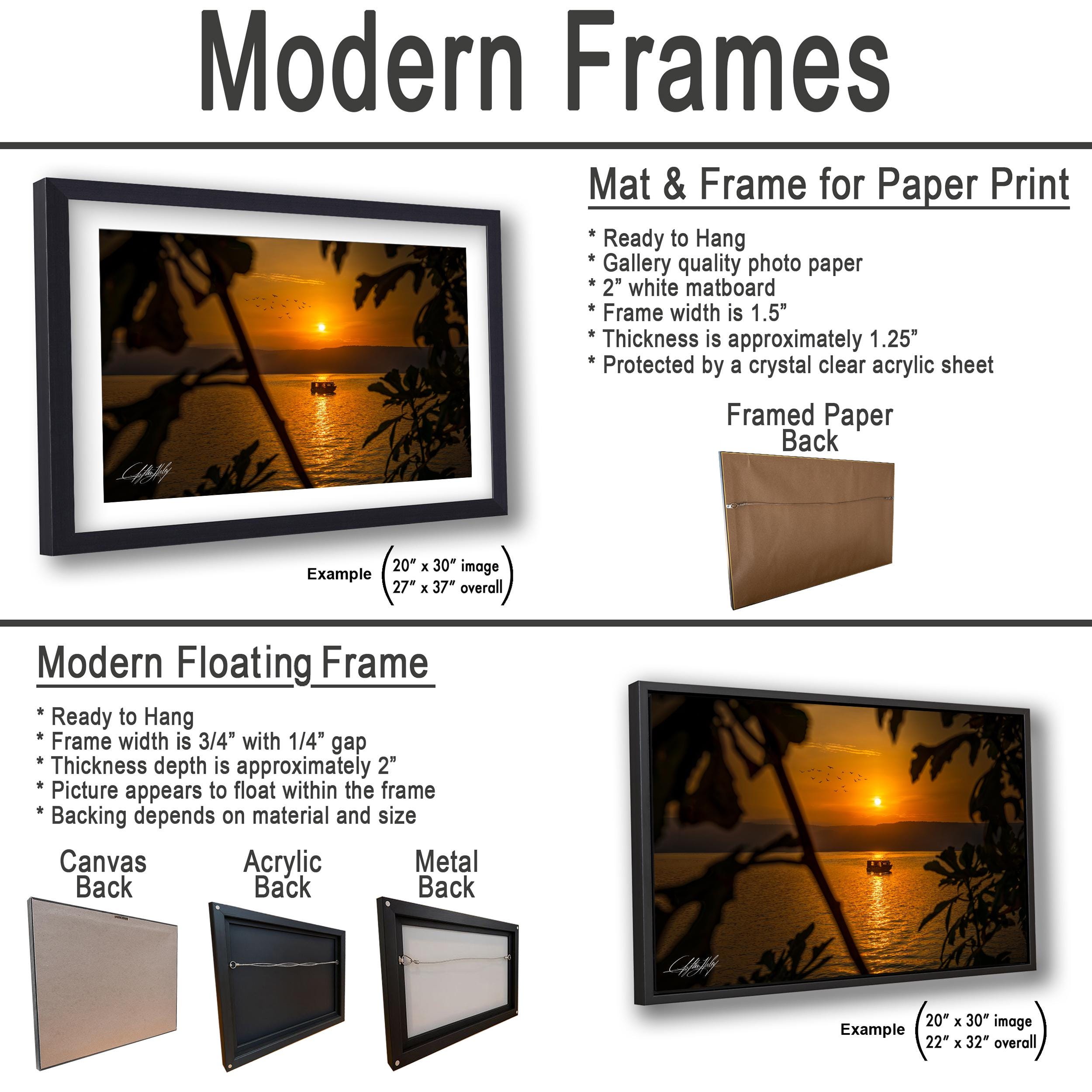 3.1) Only framed paper prints, acrylics and aluminum/metal prints will have a 2" white mat border. 3.2) Canvas prints will be a flush mounted (no mat border) to the frame.