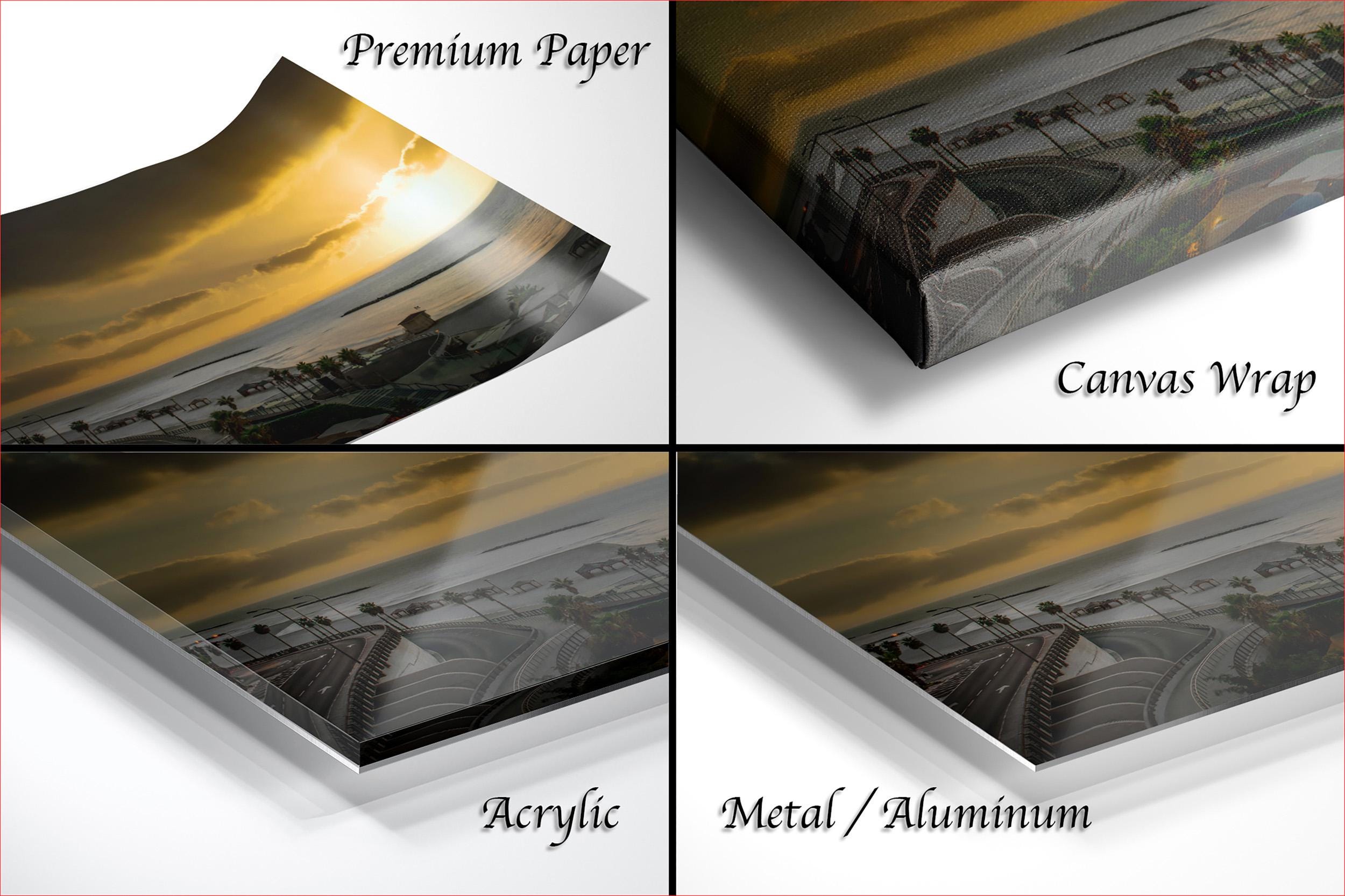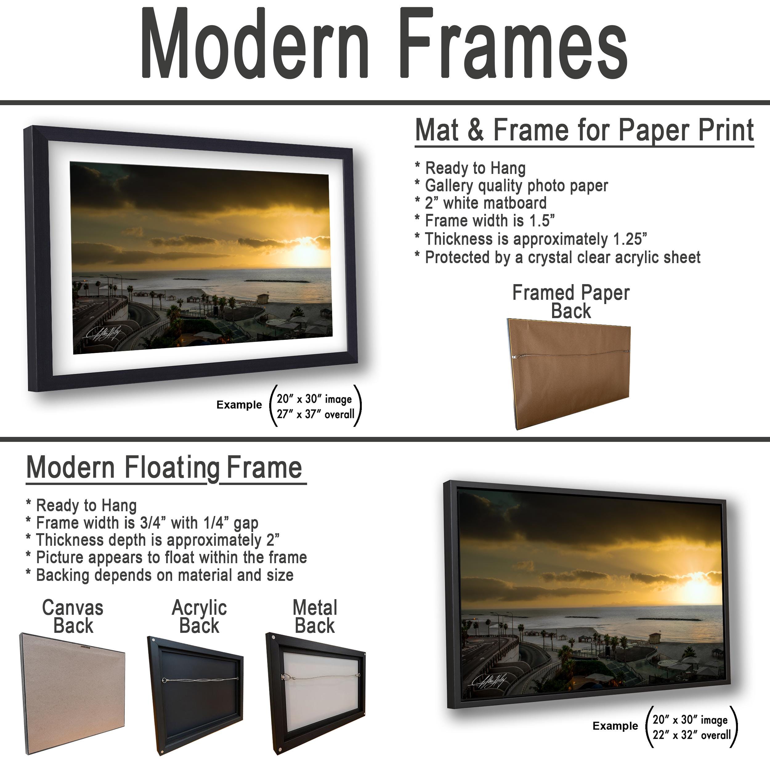 3.1) Only framed paper prints, acrylics and aluminum/metal prints will have a 2" white mat border. 3.2) Canvas prints will be a flush mounted (no mat border) to the frame.