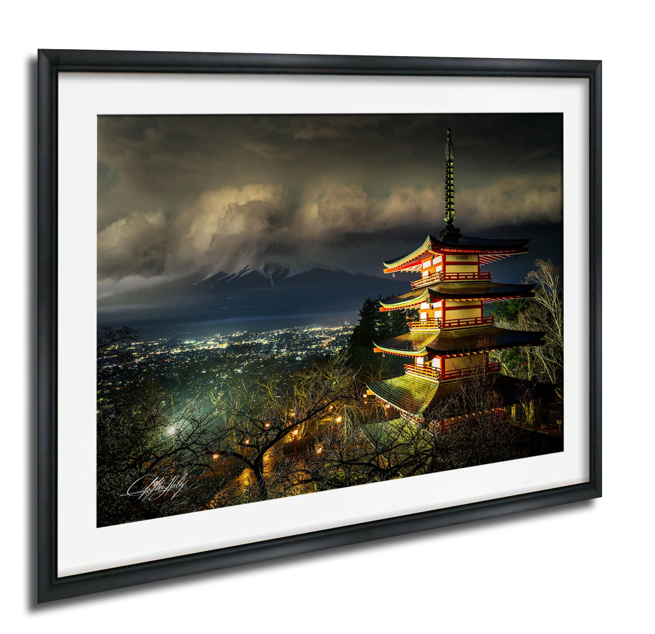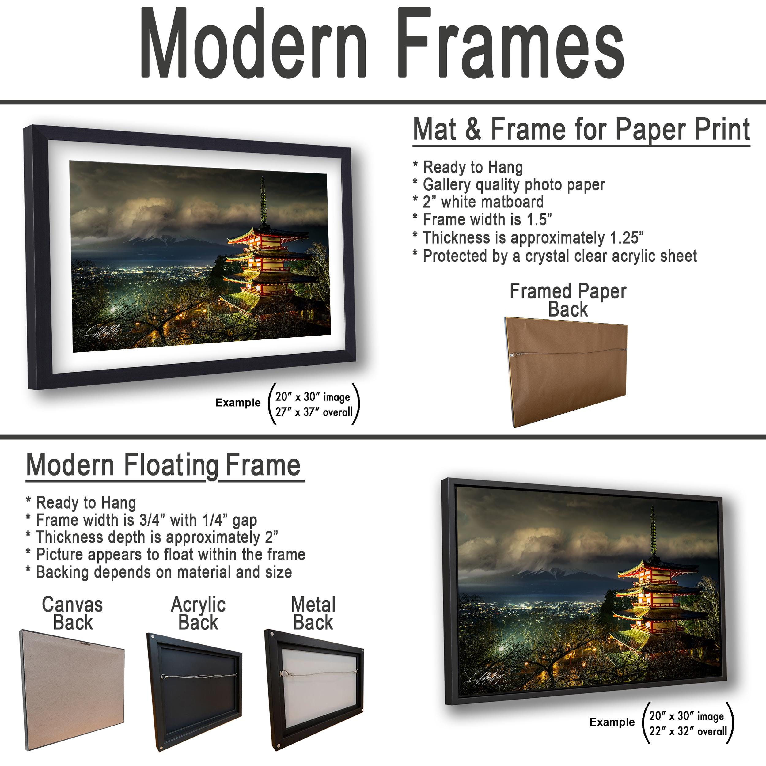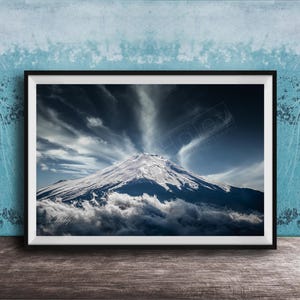 - Mount Fuji canvas prints are flush mounted without a mat border for a sleek, modern look. - Framed paper prints, acrylics, and metal options include a 2" white mat border for classic elegance. - Perfect for nature landscape art lovers seeking storm scene decor that evokes the raw beauty of Fuji.