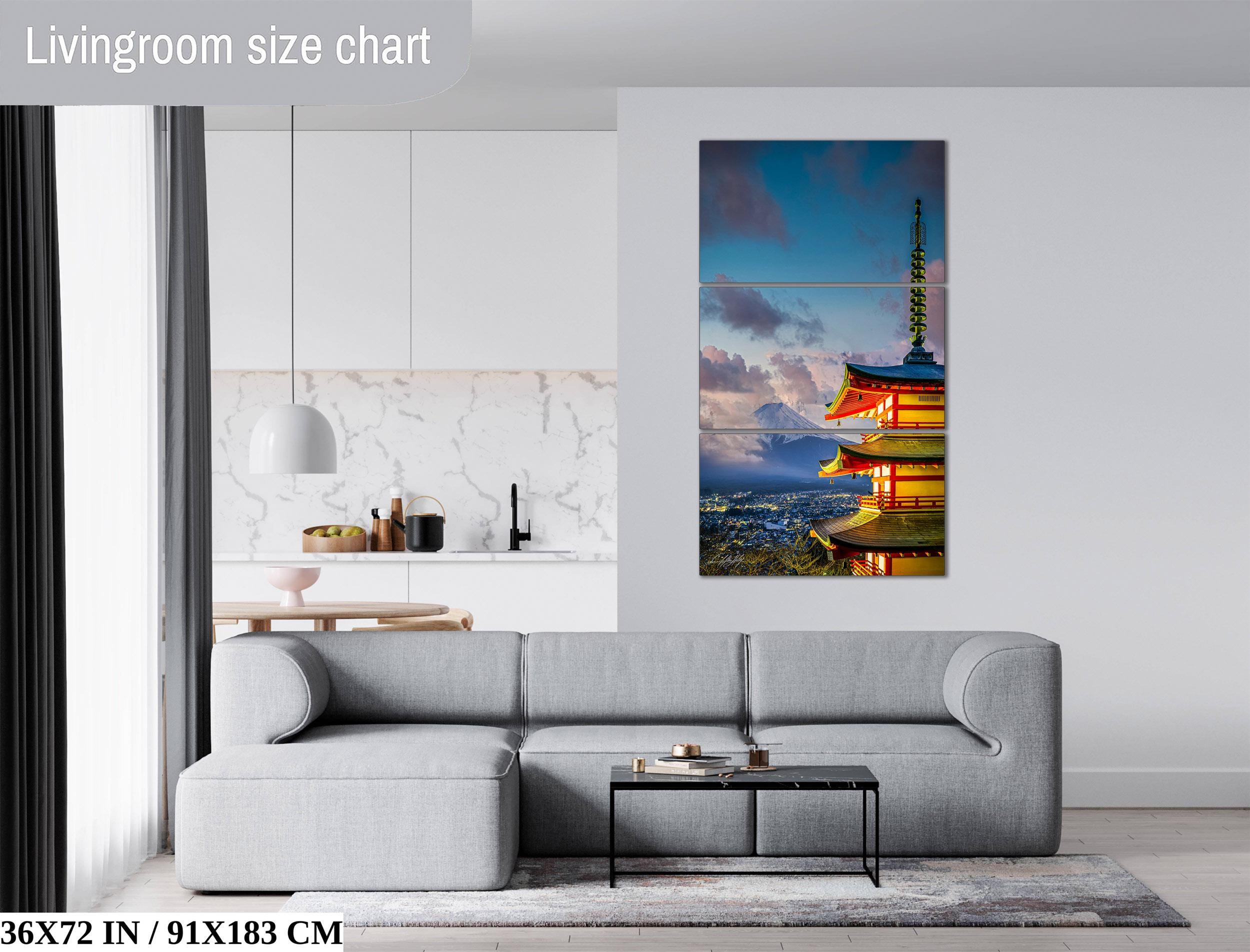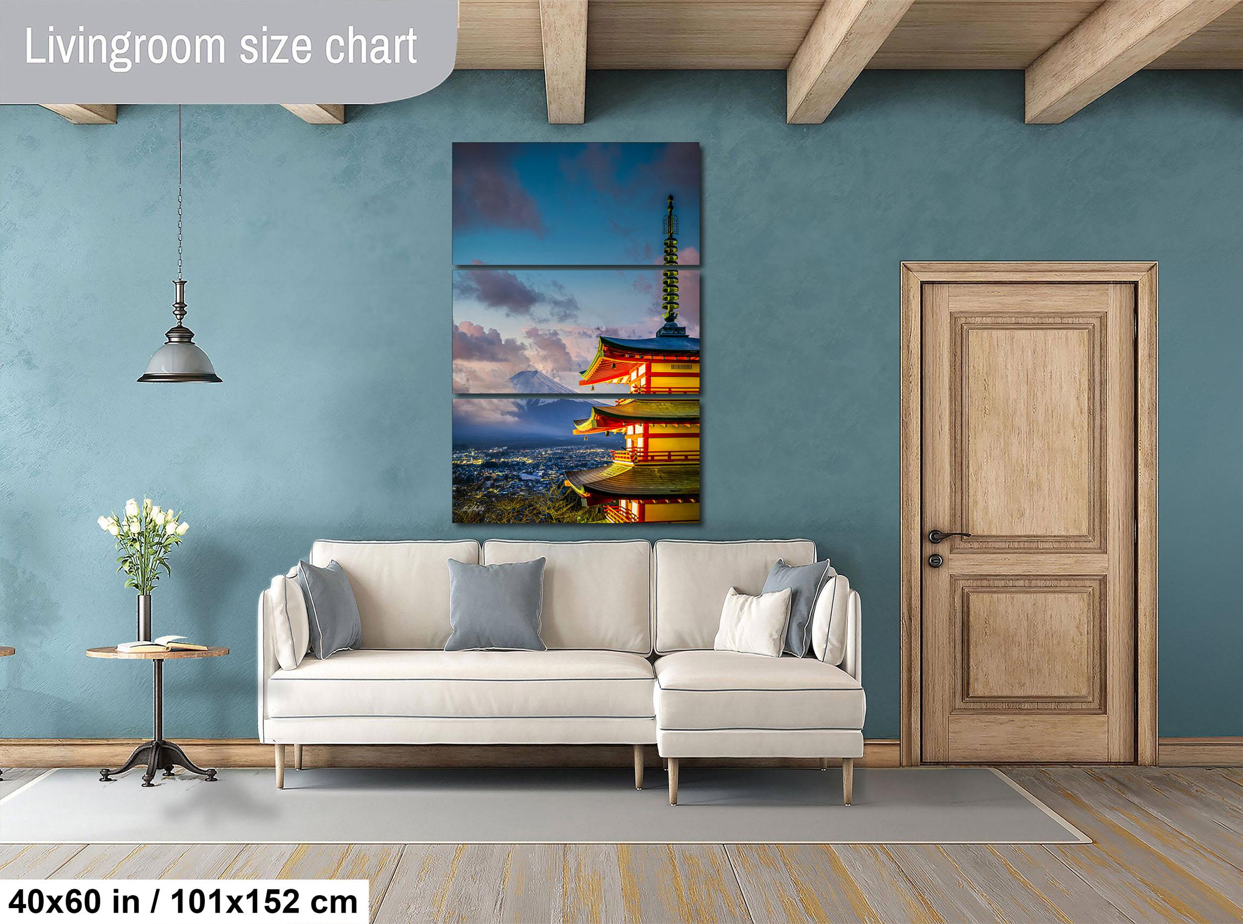This multi panel canvas features a breathtaking view from the historic Arakura Sengen Pagoda, where Mount Fuji stands majestically amidst sakura trees. The photograph embodies a meditative wall art piece, perfect for creating a serene atmosphere in any space.