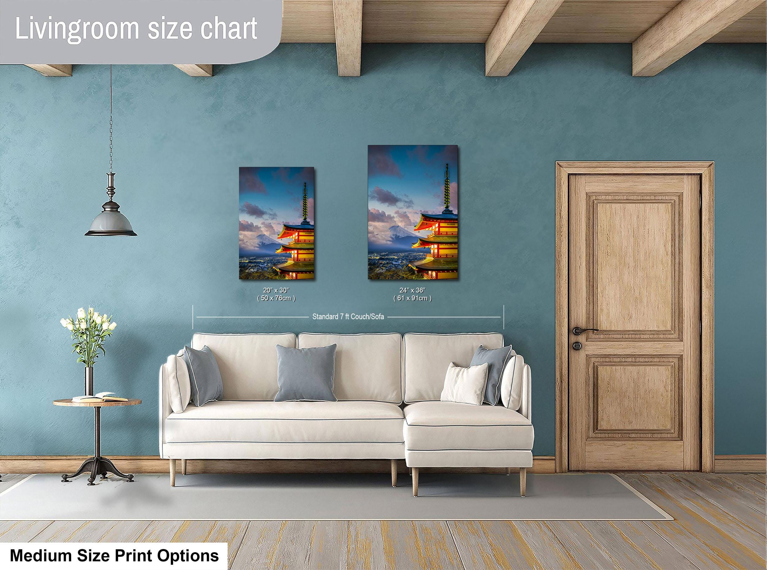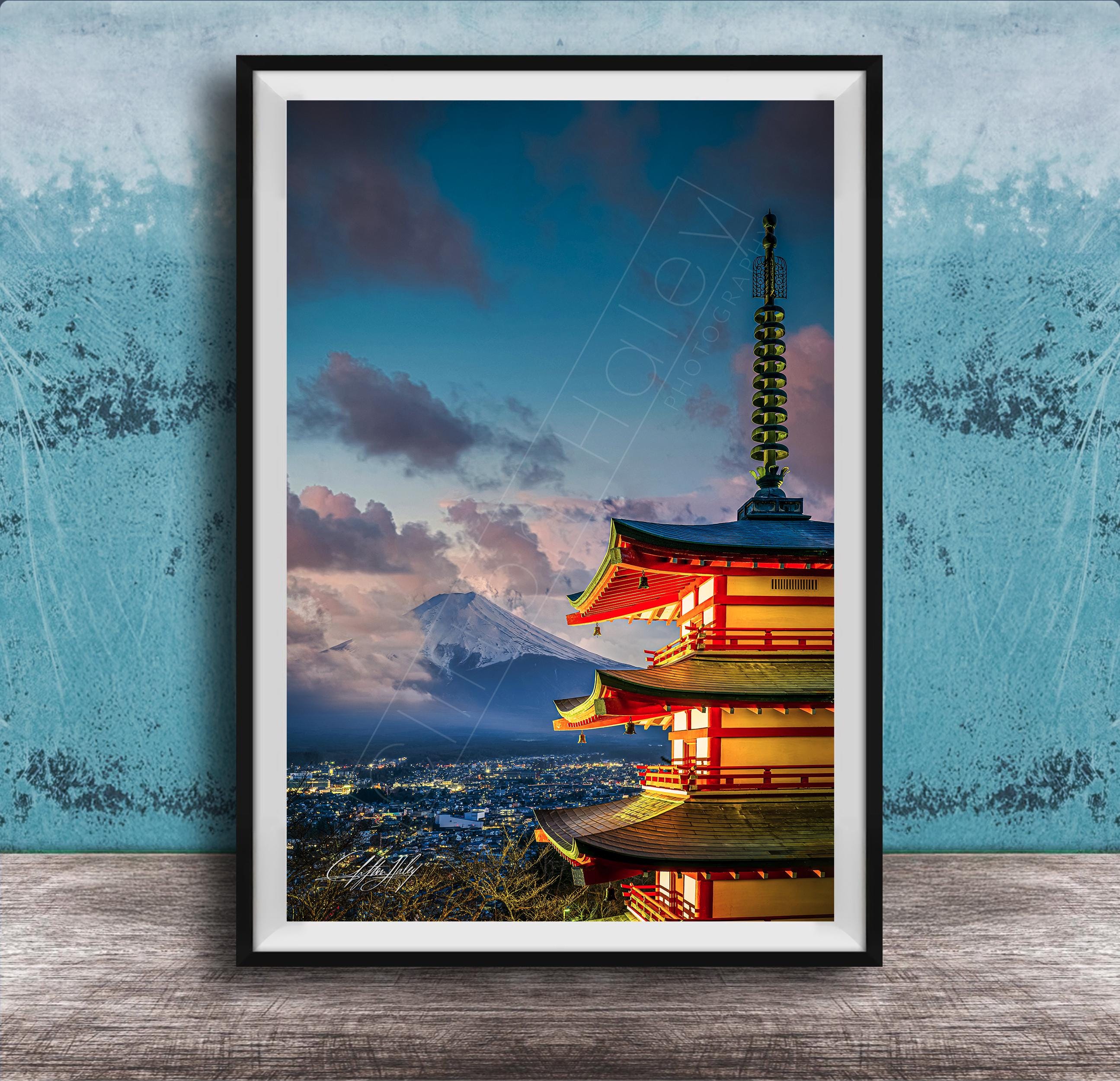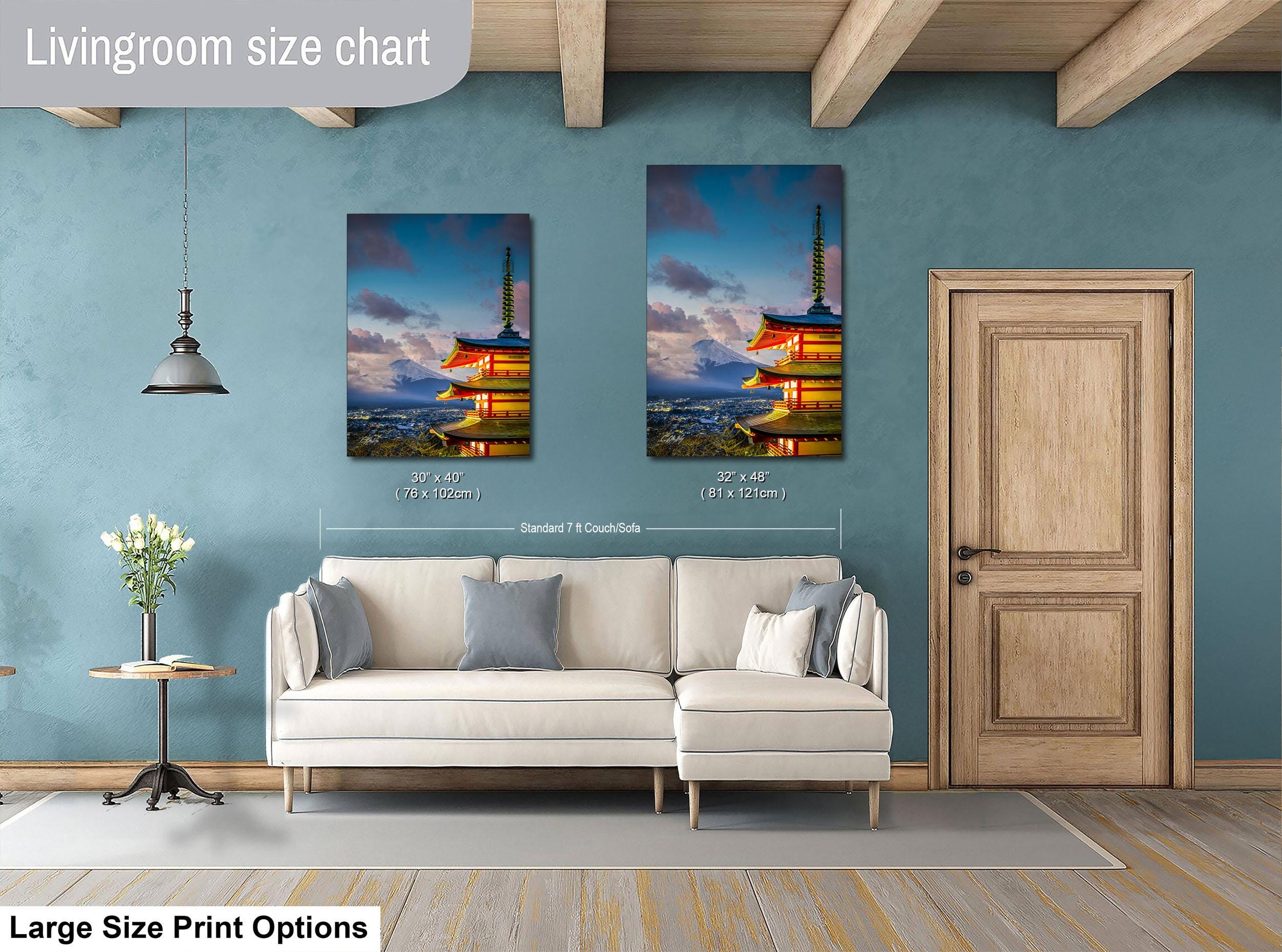 Mount Fuji Arakura Pagoda Canvas invites you to experience the serene beauty of Japan's iconic landscape through fine art photography. This Japanese wall art captures the tranquil moment of sunrise over cherry blossom trees, blending traditional symbolism with modern home decor.
