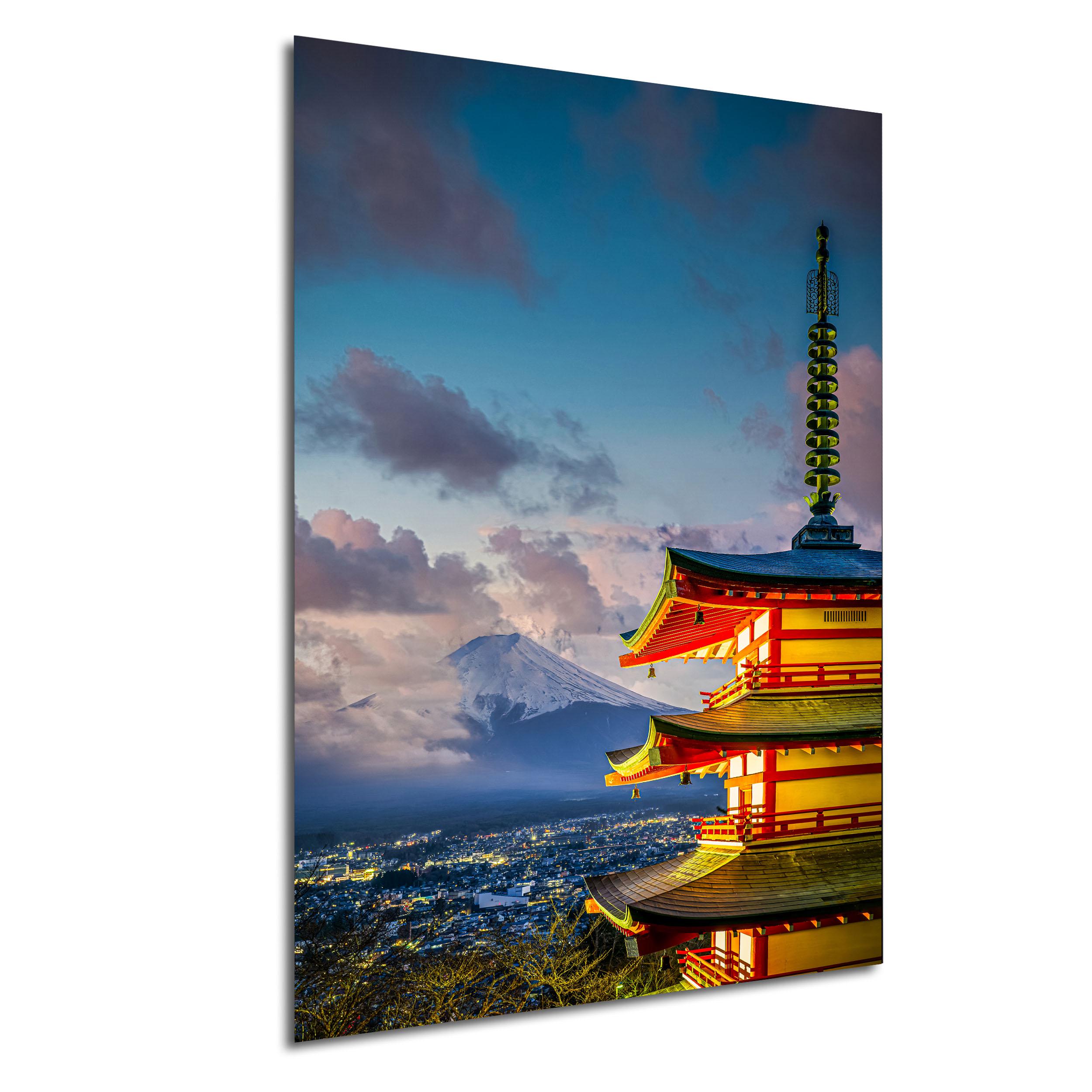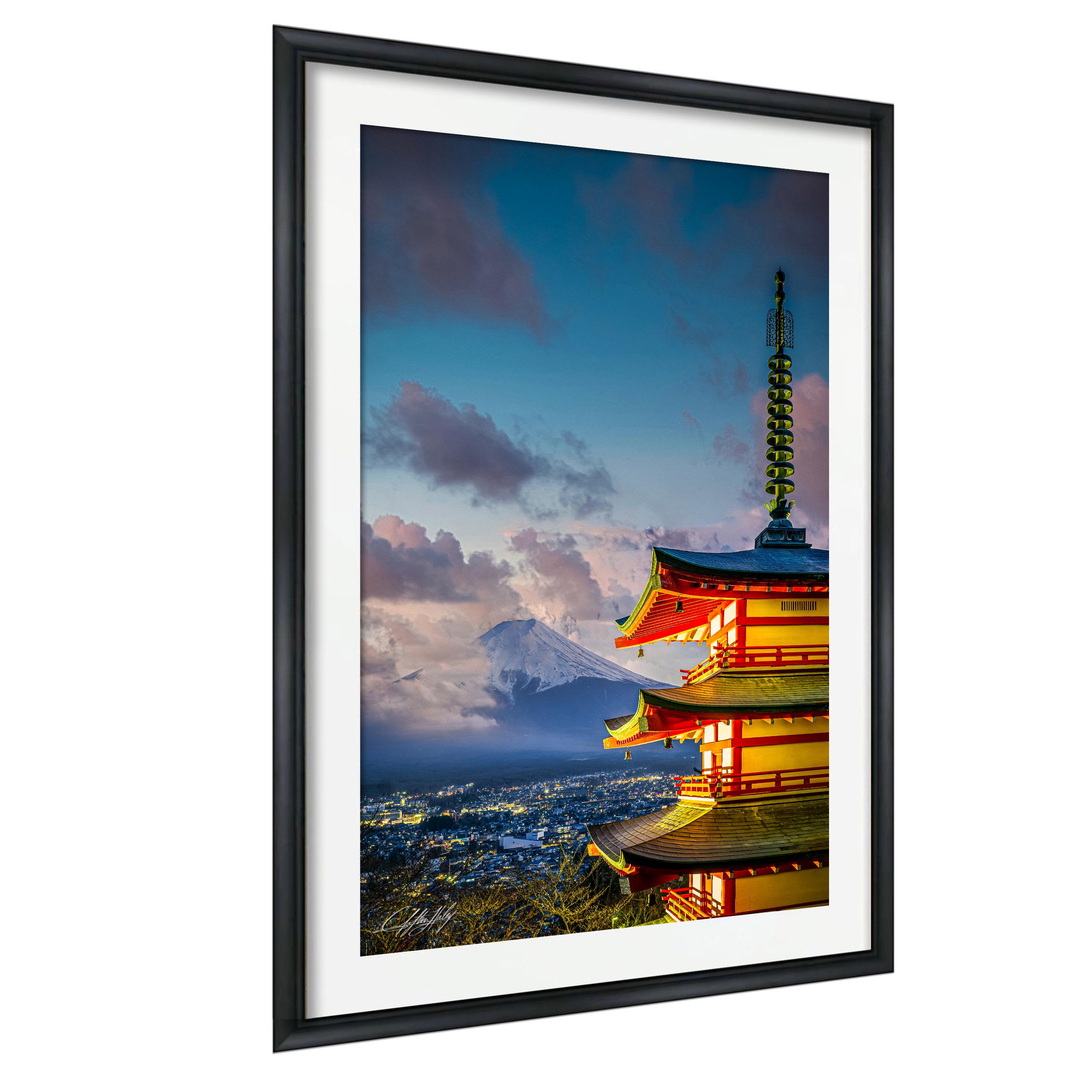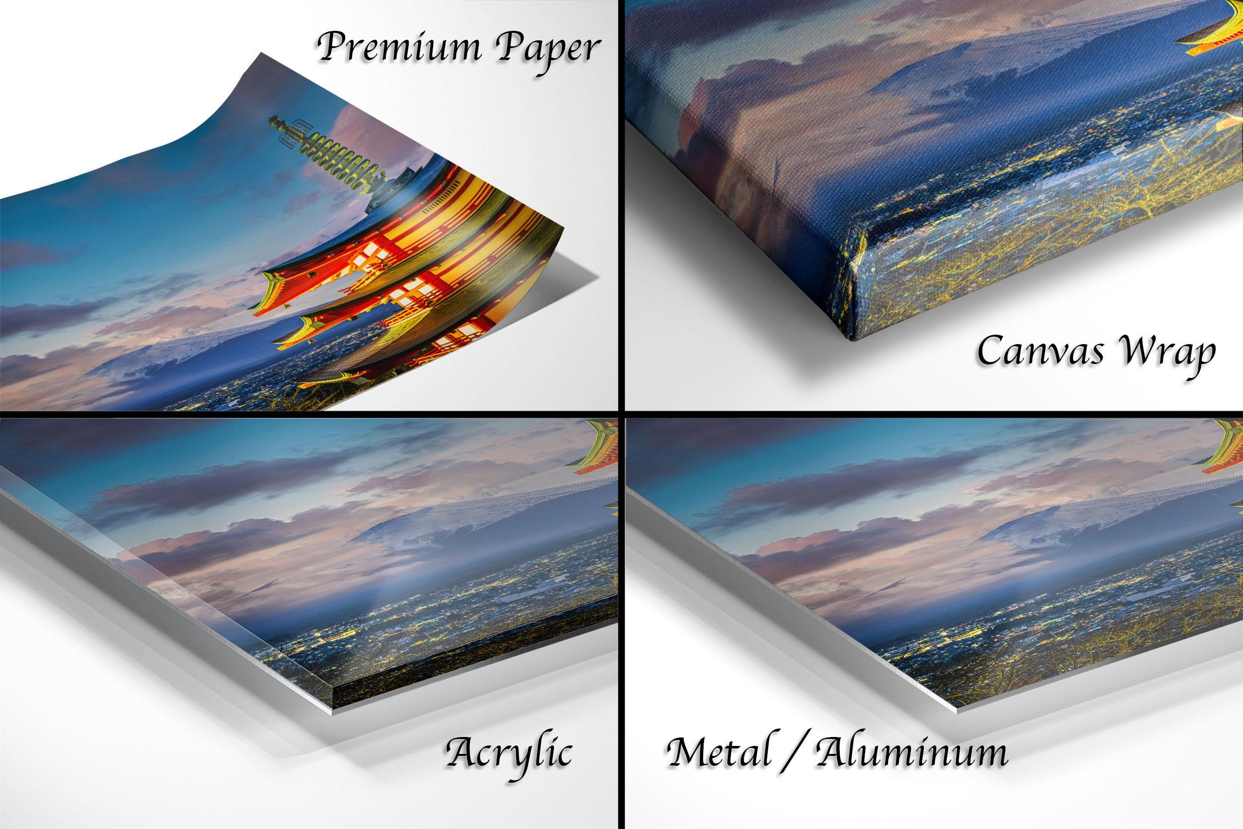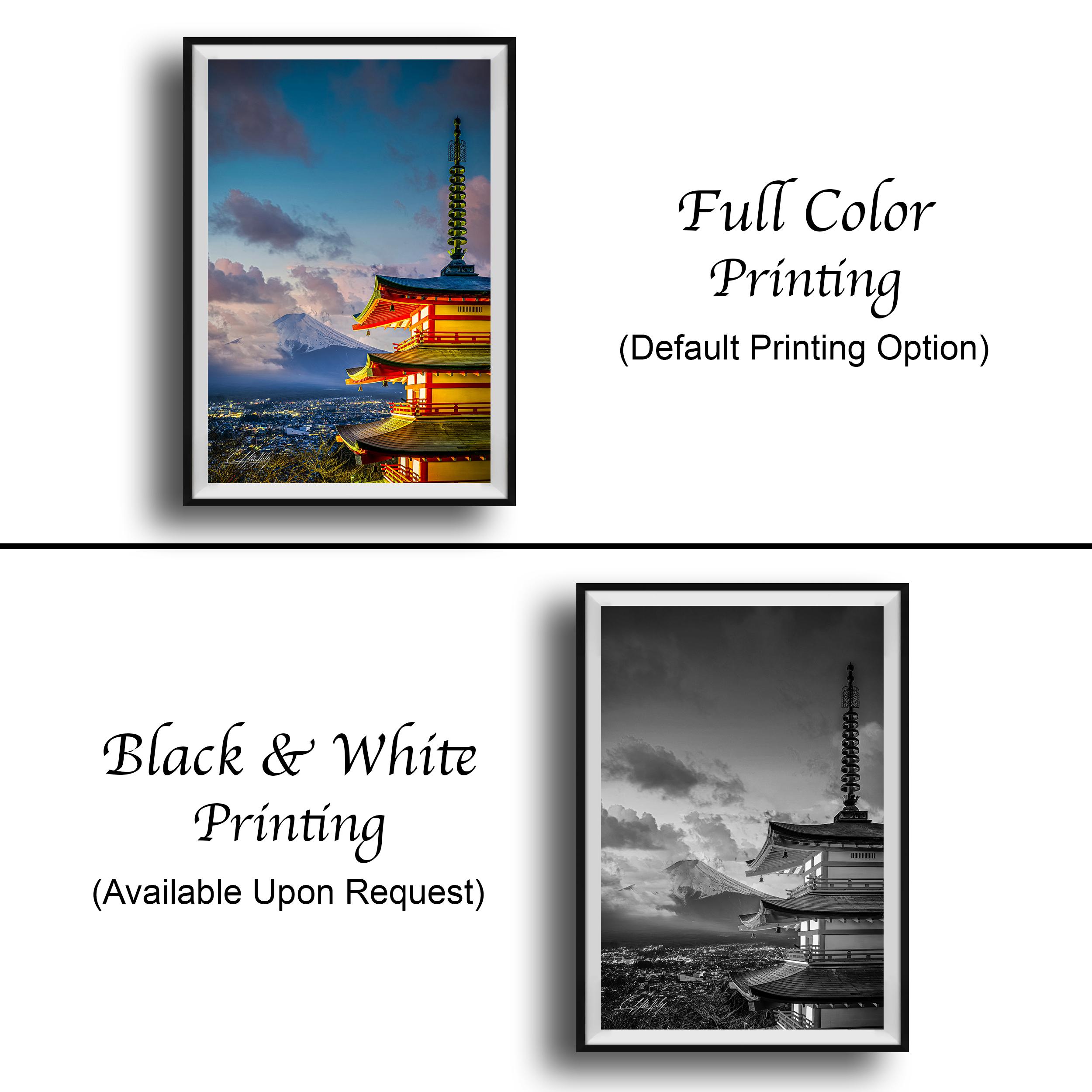 Mount Fuji Arakura Pagoda Canvas invites you to experience the serene beauty of Japan's iconic landscape through fine art photography. This Japanese wall art captures the tranquil moment of sunrise over cherry blossom trees, blending traditional symbolism with modern home decor.