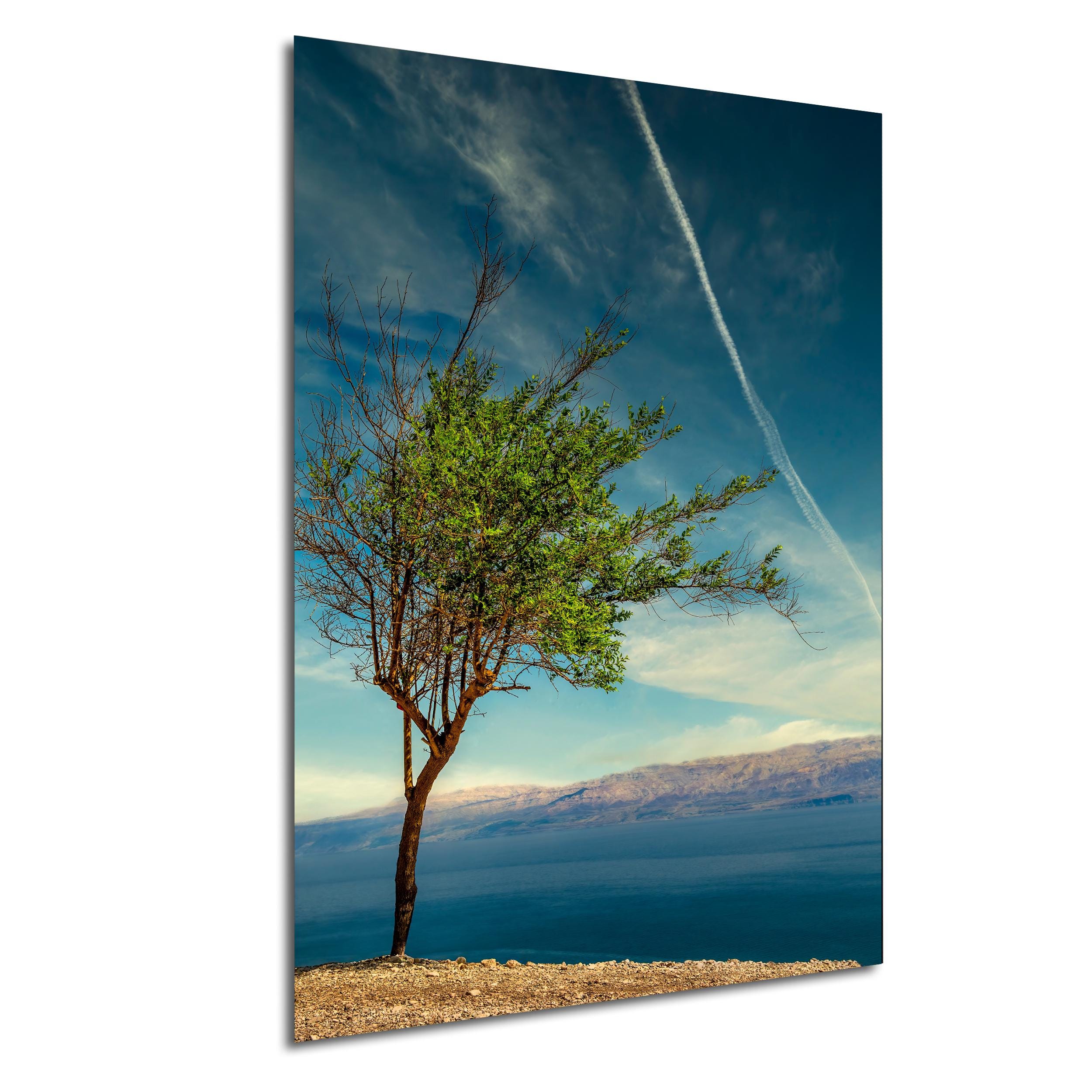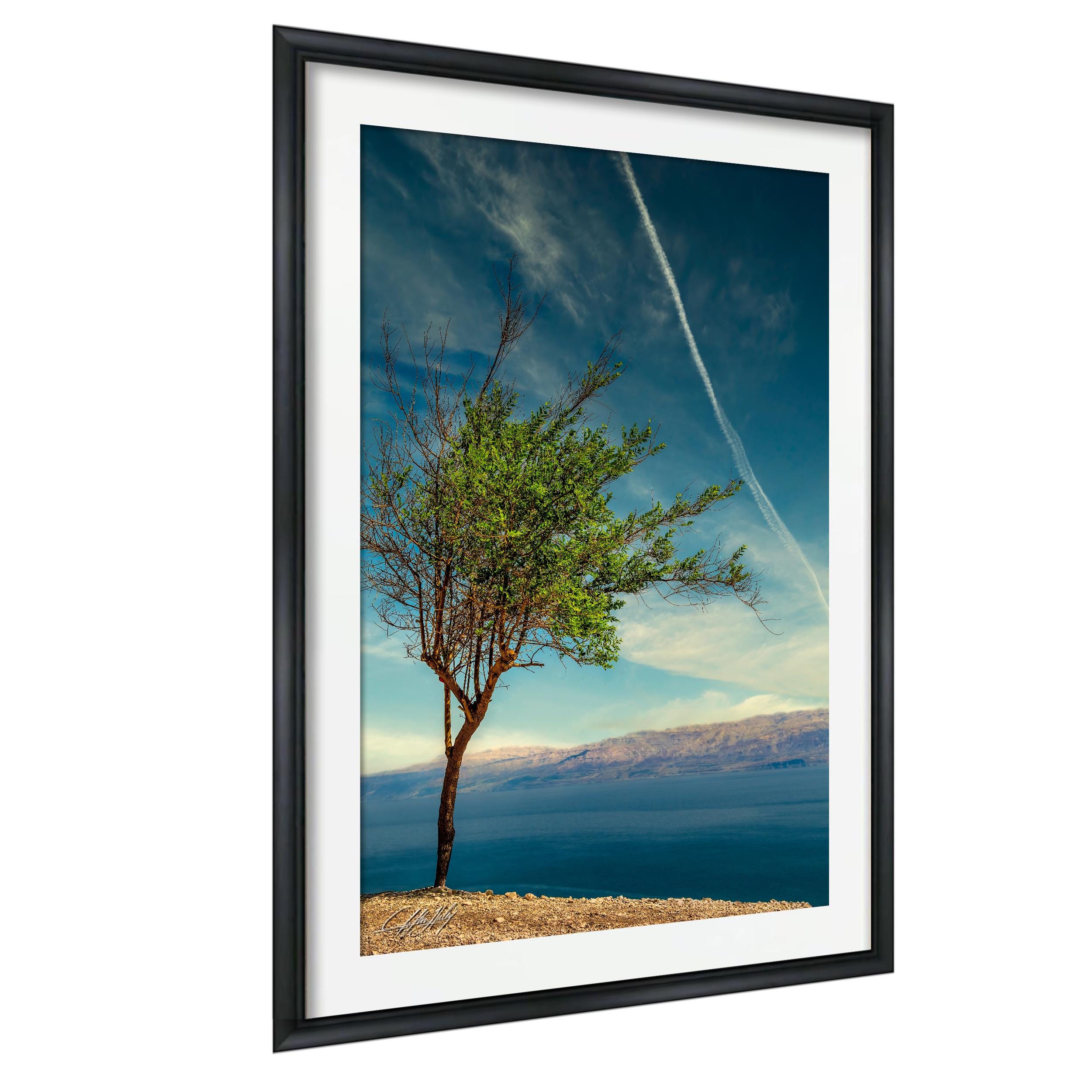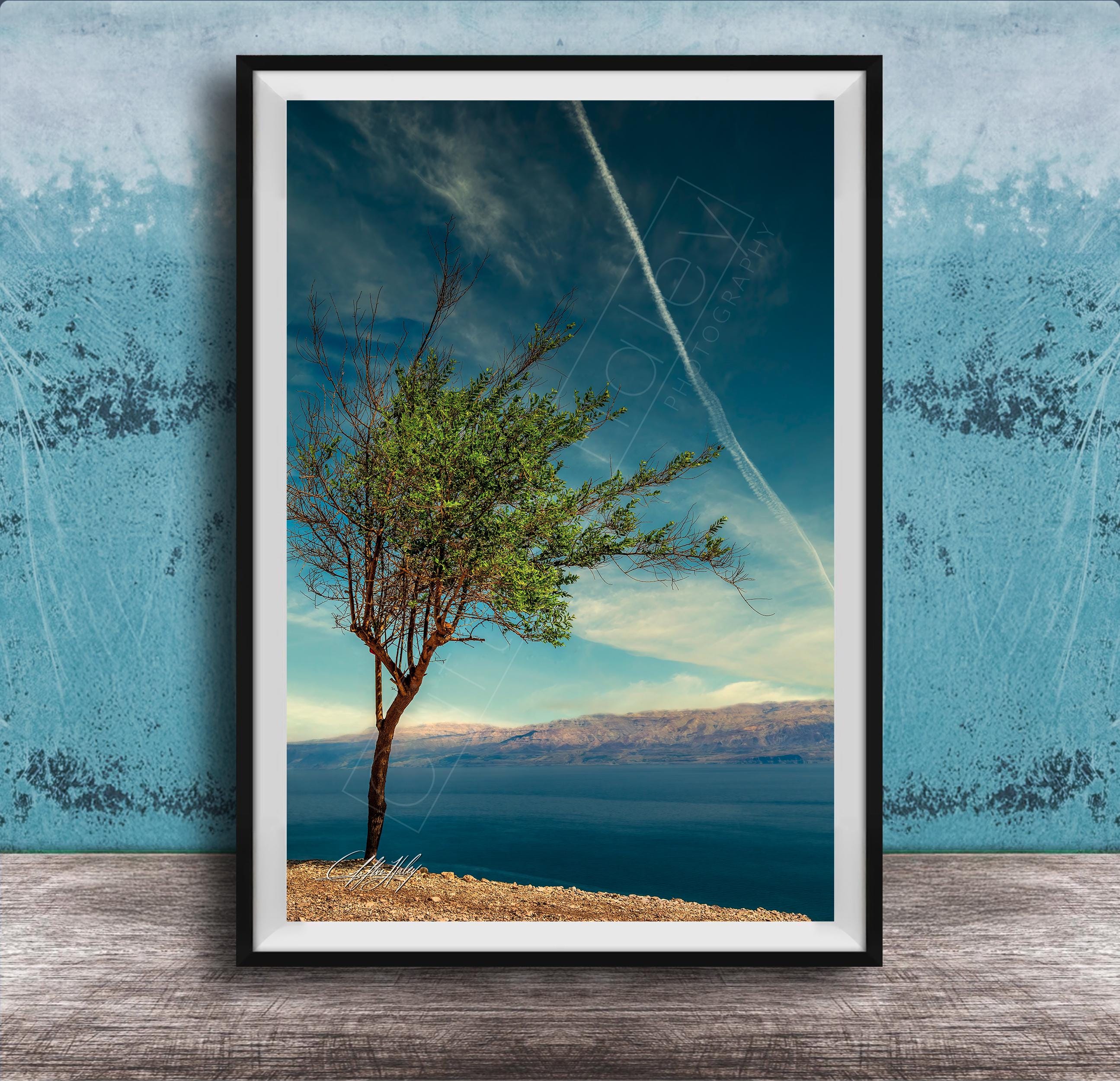 Perched above the shimmering Dead Sea, this fine art wall decor showcases the iconic acacia tree, a symbol deeply woven into ancient history and spirituality. The ancient acacia wood, famously used in sacred artifacts like the Ark of the Covenant, lends this image a profound cultural resonance.